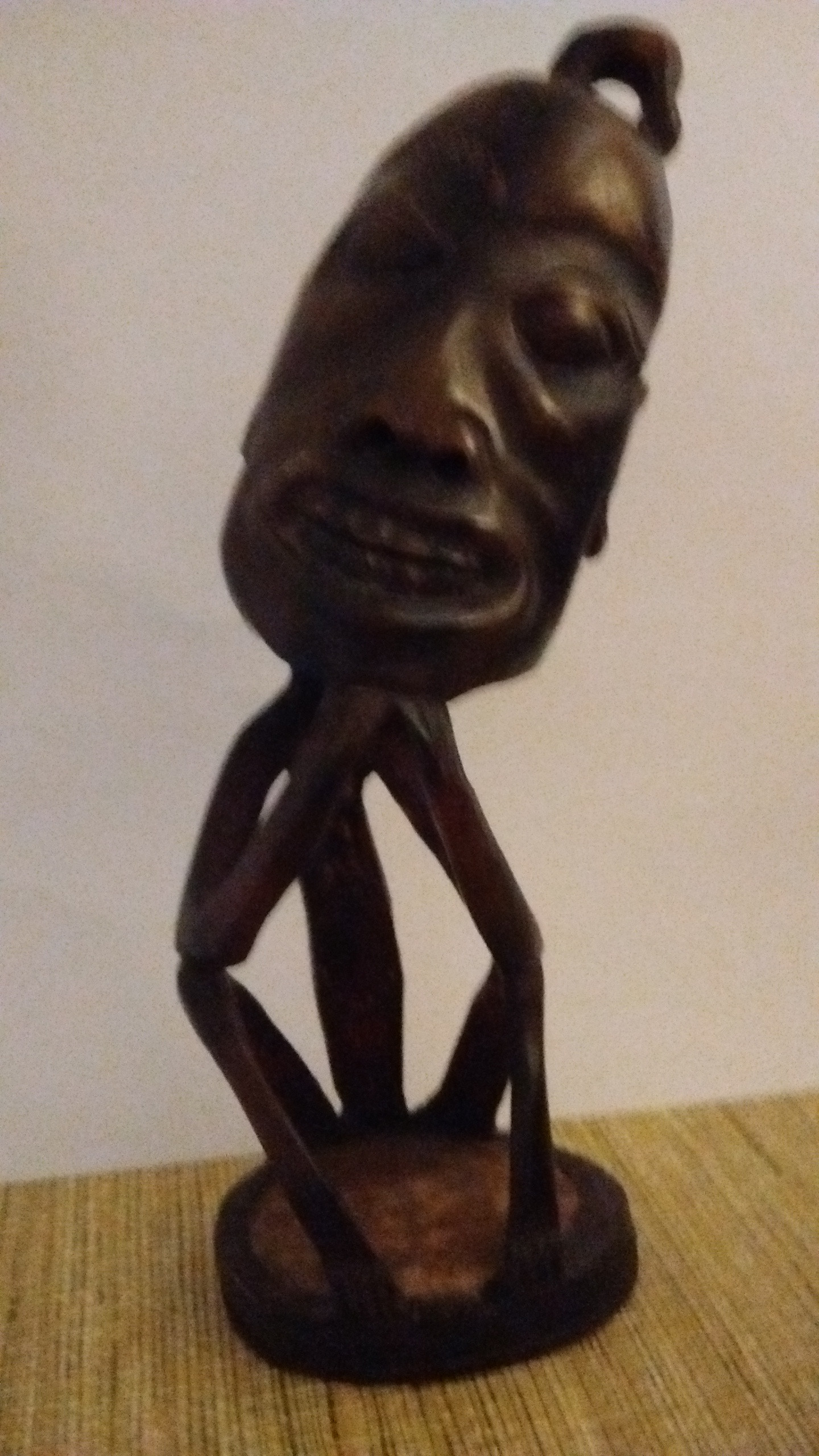 This is a hand-carved wooden figure purchased in Bali, Indonesia, in 2000. The piece was said to have originated from a village on one of the Indonesian islands, possibly Timor. The sculpture is crafted in a distinctive tribal or ethnic art style, characterized by exaggerated facial features and a stylized, abstract body structure.