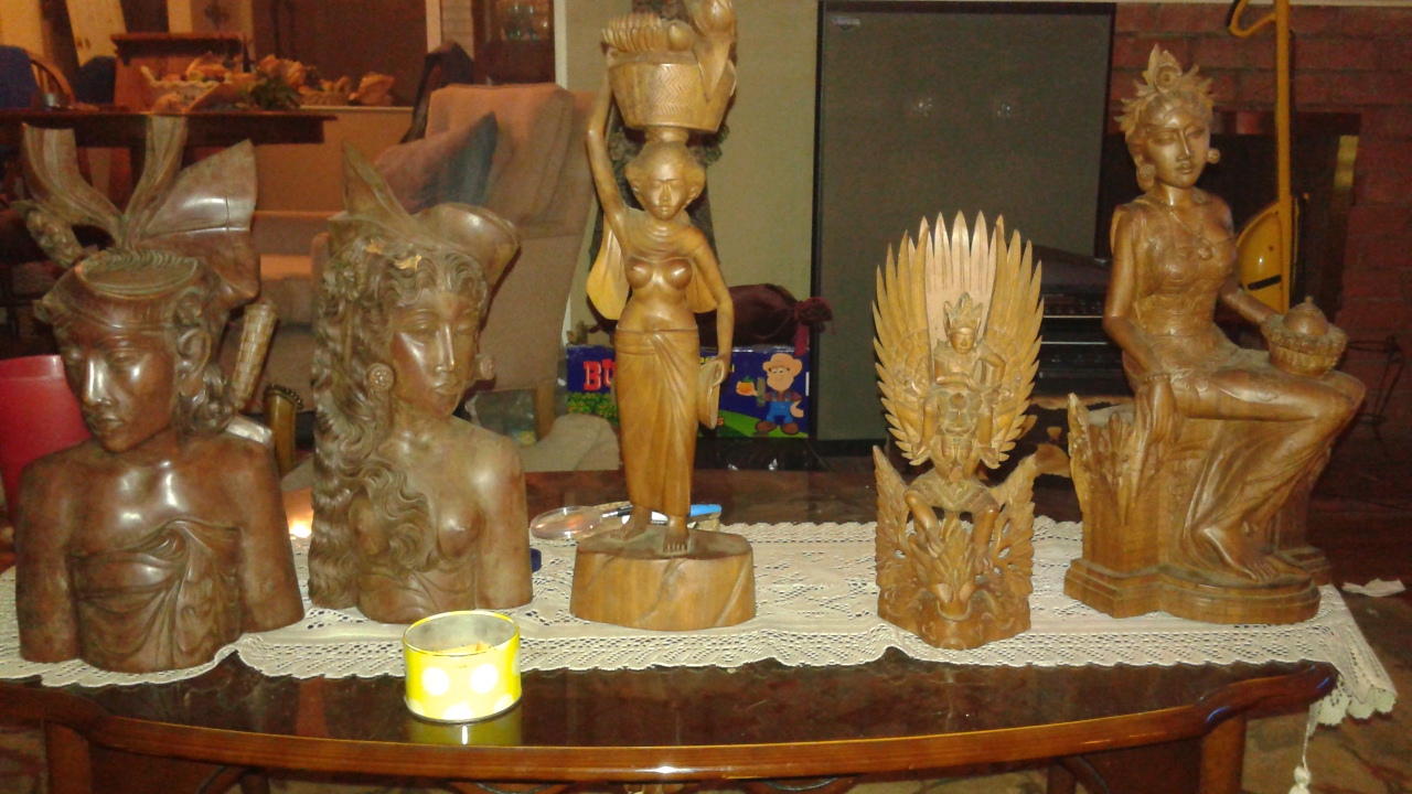 Description I have 5 wooden sculptures on the he bottom they say "A A A R A I Bali sesetan I had them passed down through a family member that passed away just want to know what they are worth and sell them