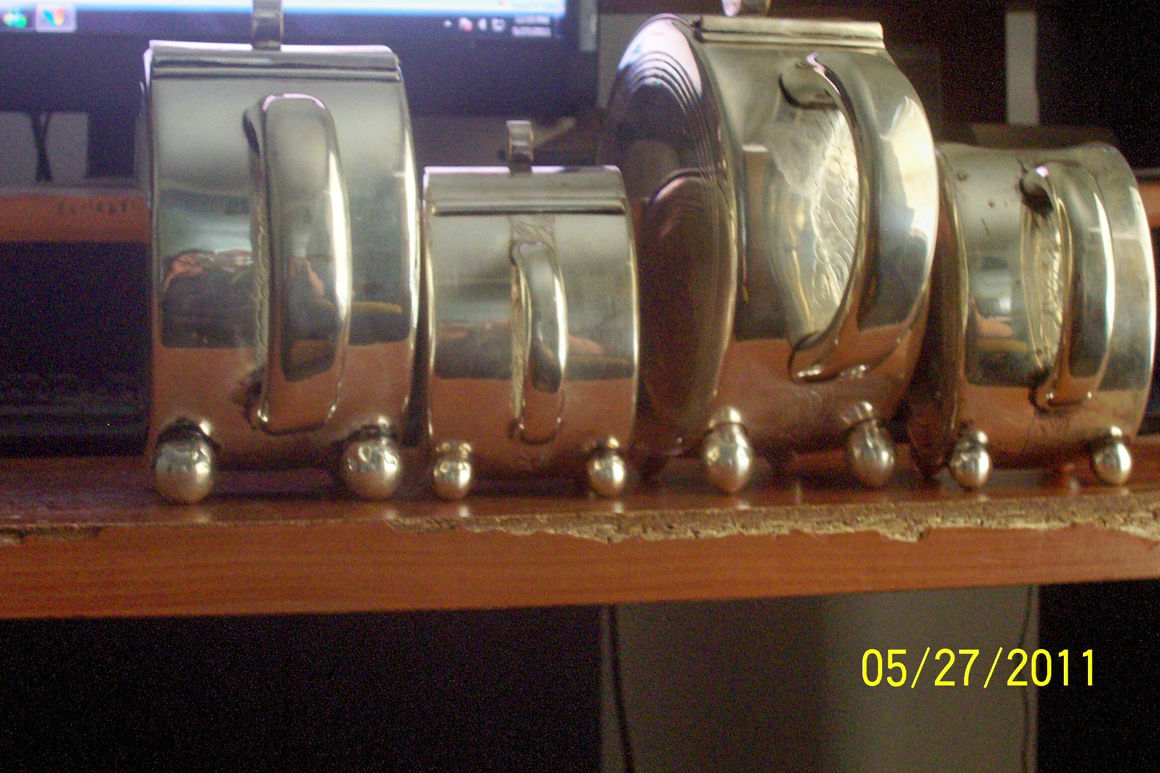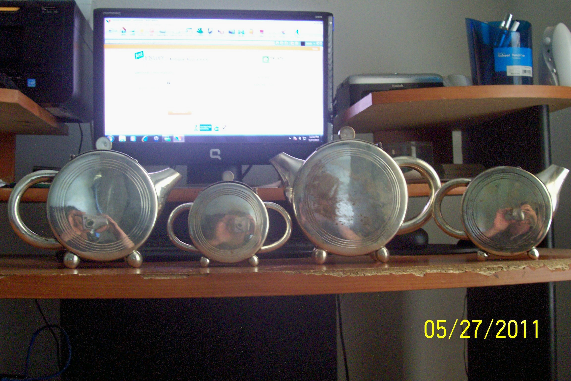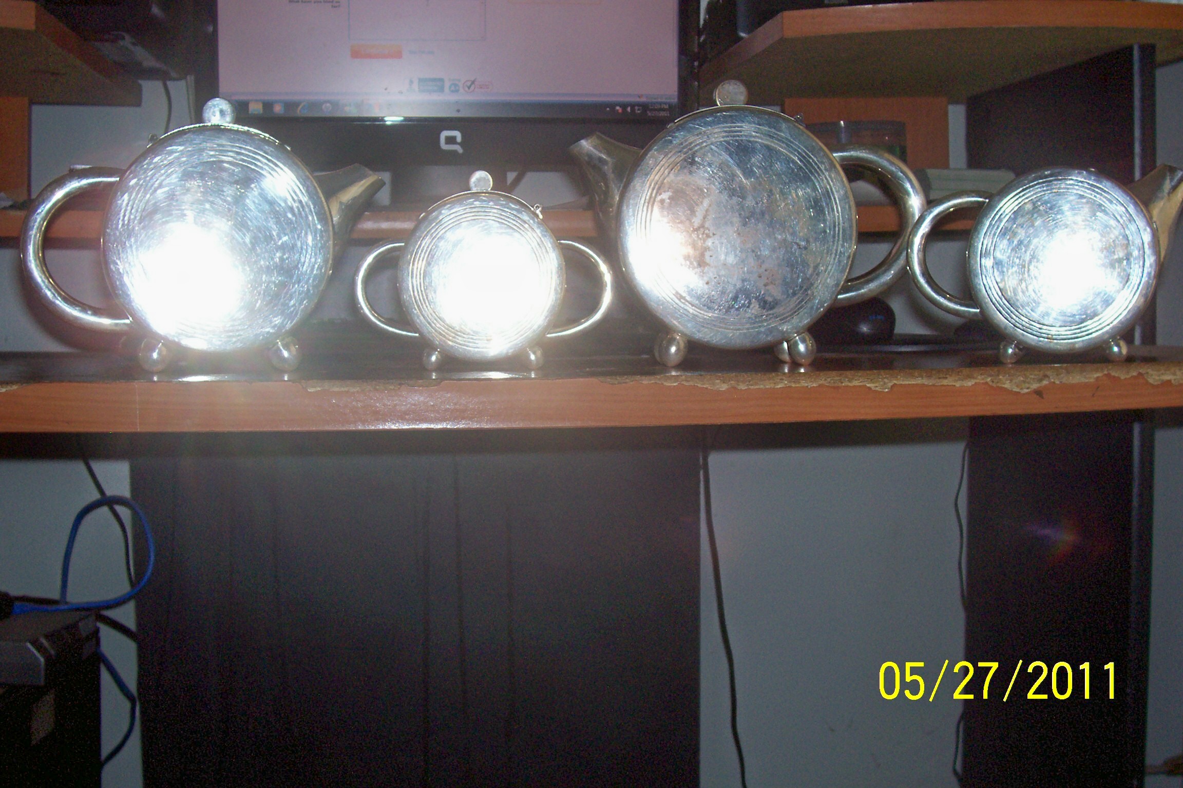 This set has 2 teapots a creamer pot and a sugar pot. I do not have the silver tray that goes with it. There are some spots where the silver has rubbed thin but it still shines and is in good condition. No tarnish on the insides of the pots they are all nice and look good. Each pot has leaves and flowers engraved on them. I could not get my camera to take a picture of the mark but it is DBL(each letter is inside a box) and there is a shield above them. I don't have any other information on these pieces.