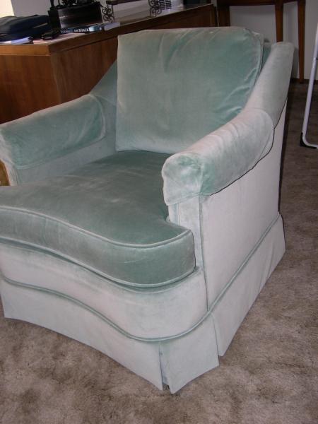 The 2 light blue/green chairs show no wear but some fade on the tops of the low backs.