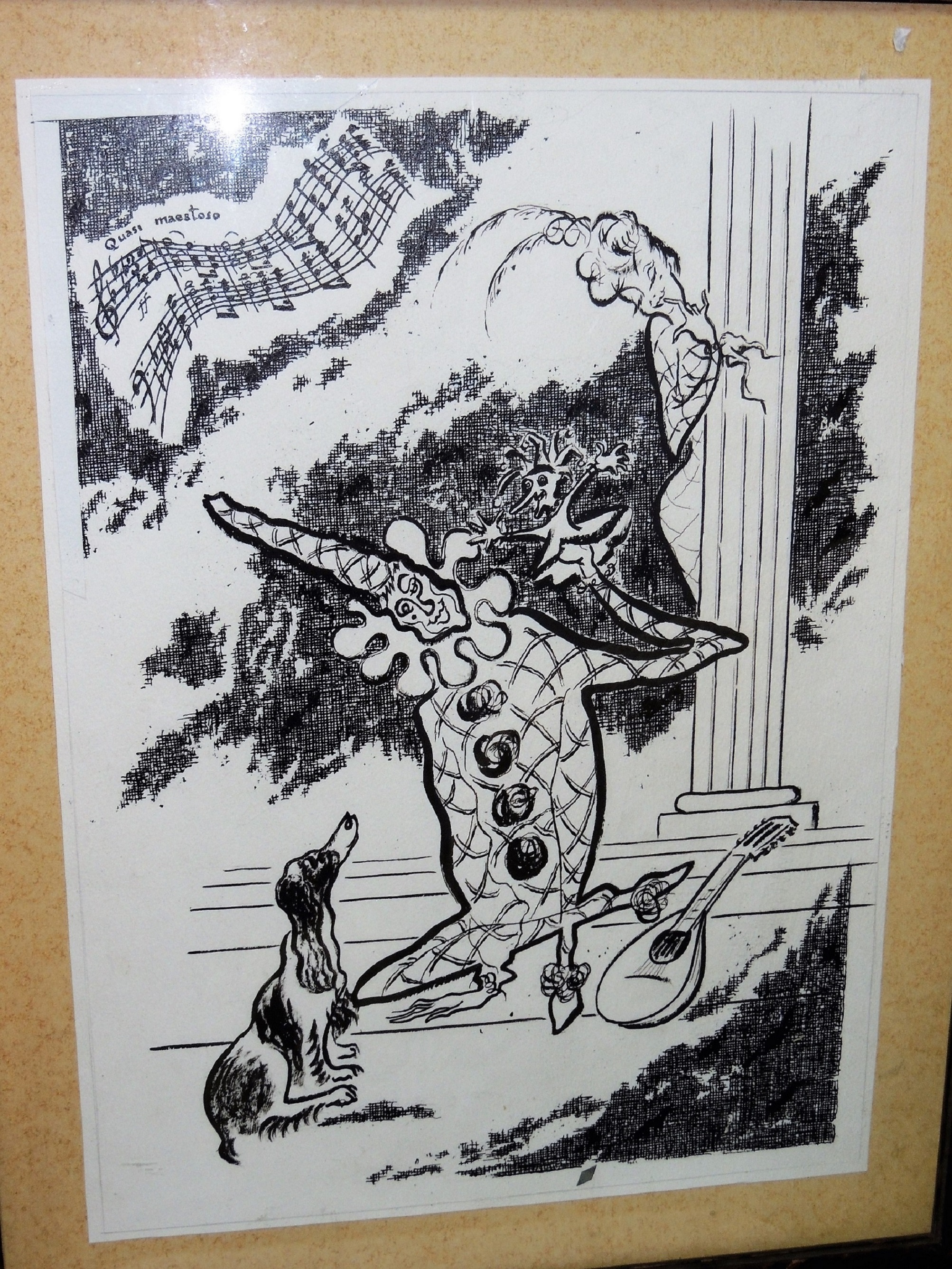 Here is what appears to be an ink drawing of a harlequin style scene, the musical notes in the top left are titled "Quasi maestoso". The drawing is approximately 12" by 17".