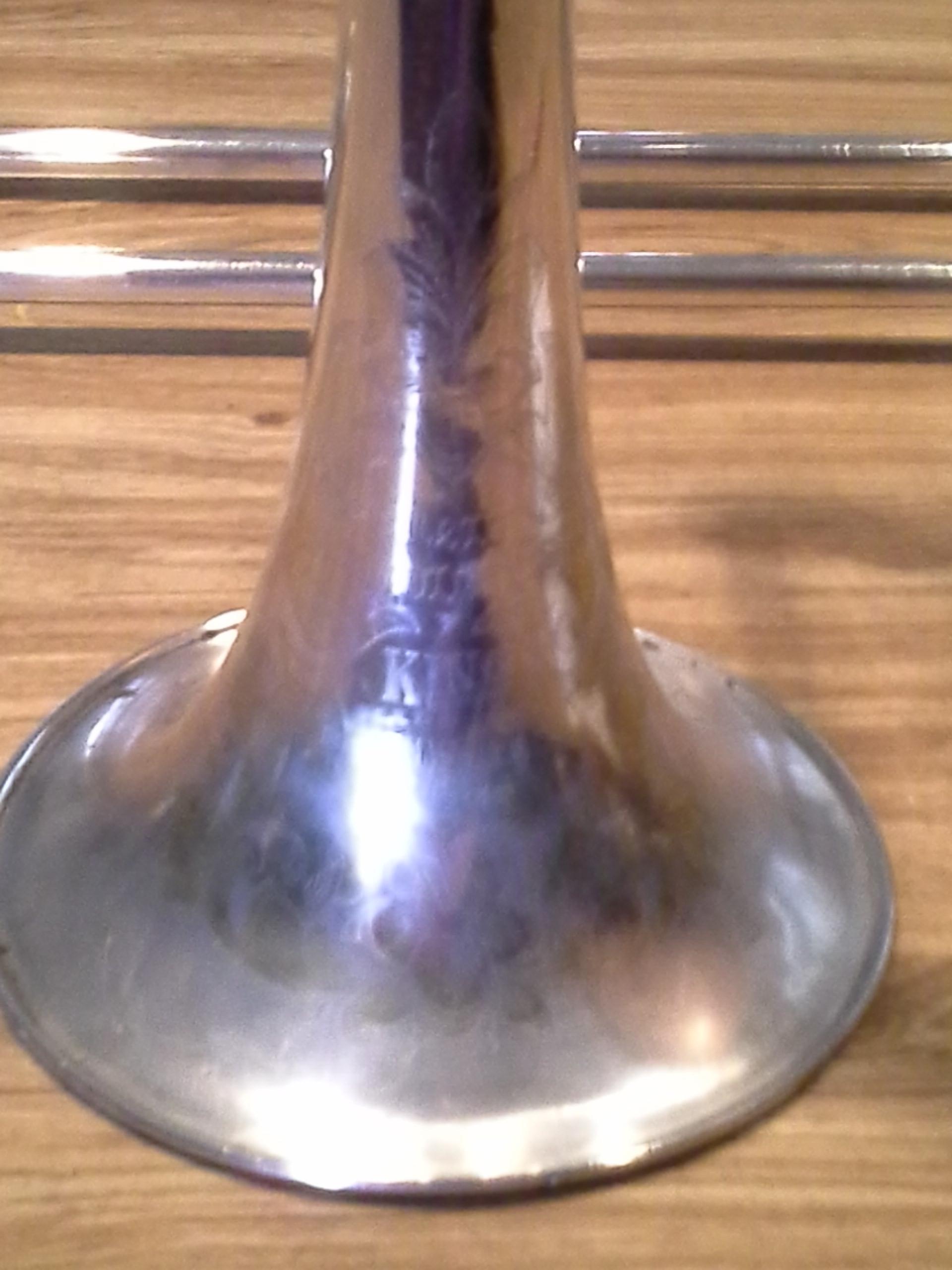 1910 antique silver trombone. Made by h n white.in Cleveland Ohio. Seriel number 107708. Has flower design on bell.the low pitch.