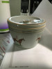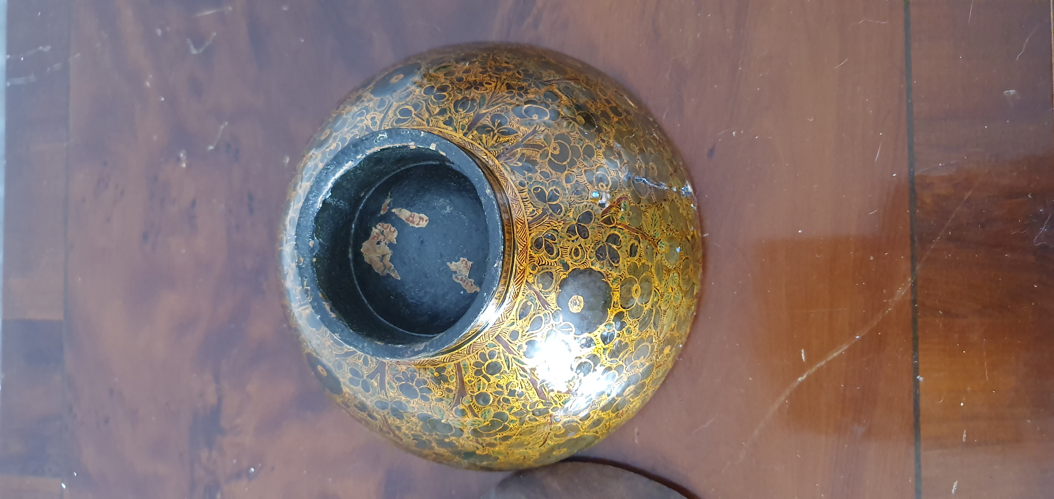 This appears to be a lacquered woode bowl with an underglaze decoration but over laid in the interior of the bowl is what looks like gold or brass metal that has been moulded to the shape of the bowl including the flange shape of the rim.