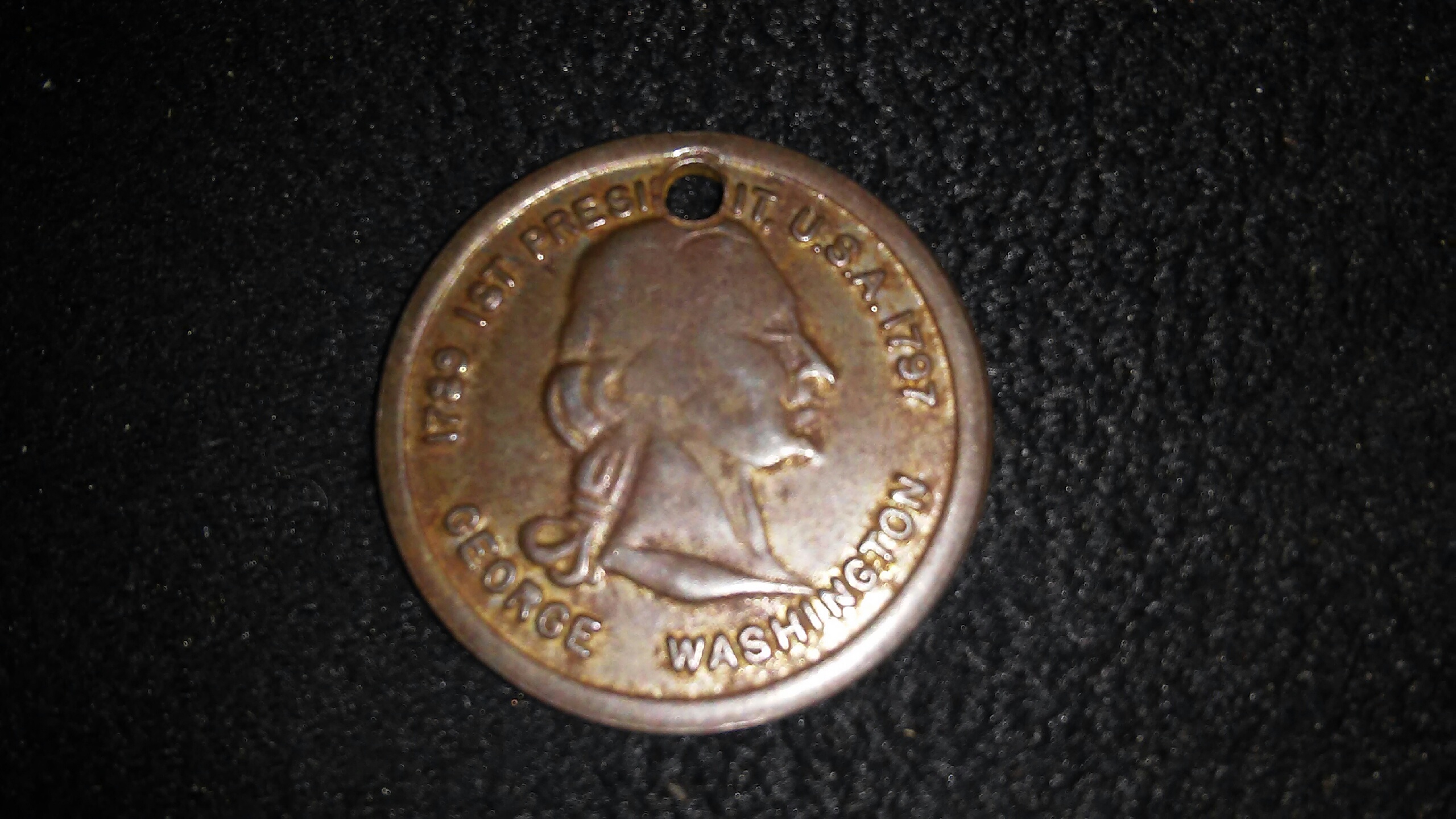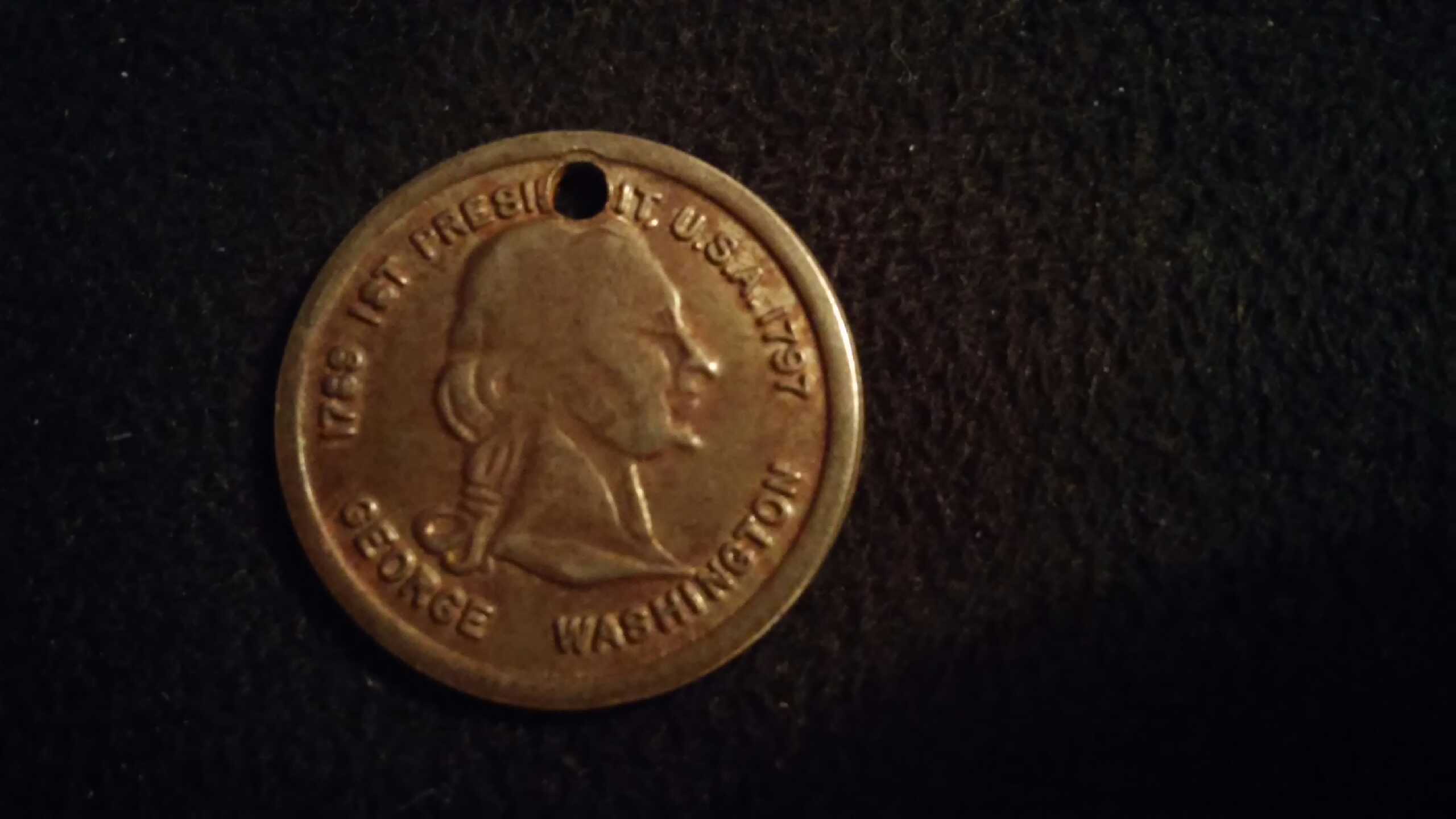 It has a bust of George Washington in the middle and around the edge it reads "1789 1st president U.S.A 1797." With "George Washington" at the bottom. It appears as if it was originally a coin and someone drilled a hole at the top to use it as a medallion.