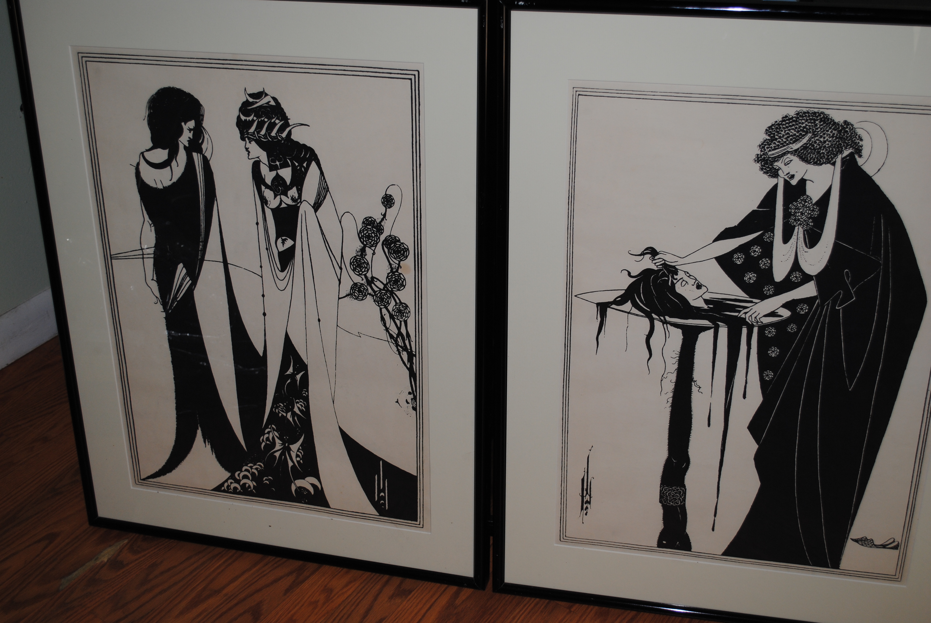 I'm hoping someone might recognize this work or maybe who created it. Set of 2 (I'm not sure ink or prints). Seems to depict some sort of story. Very interesting and morbid art. There is an image on the works that may be a signature or artists mark. They measure approx. 23" x 16". Thanks