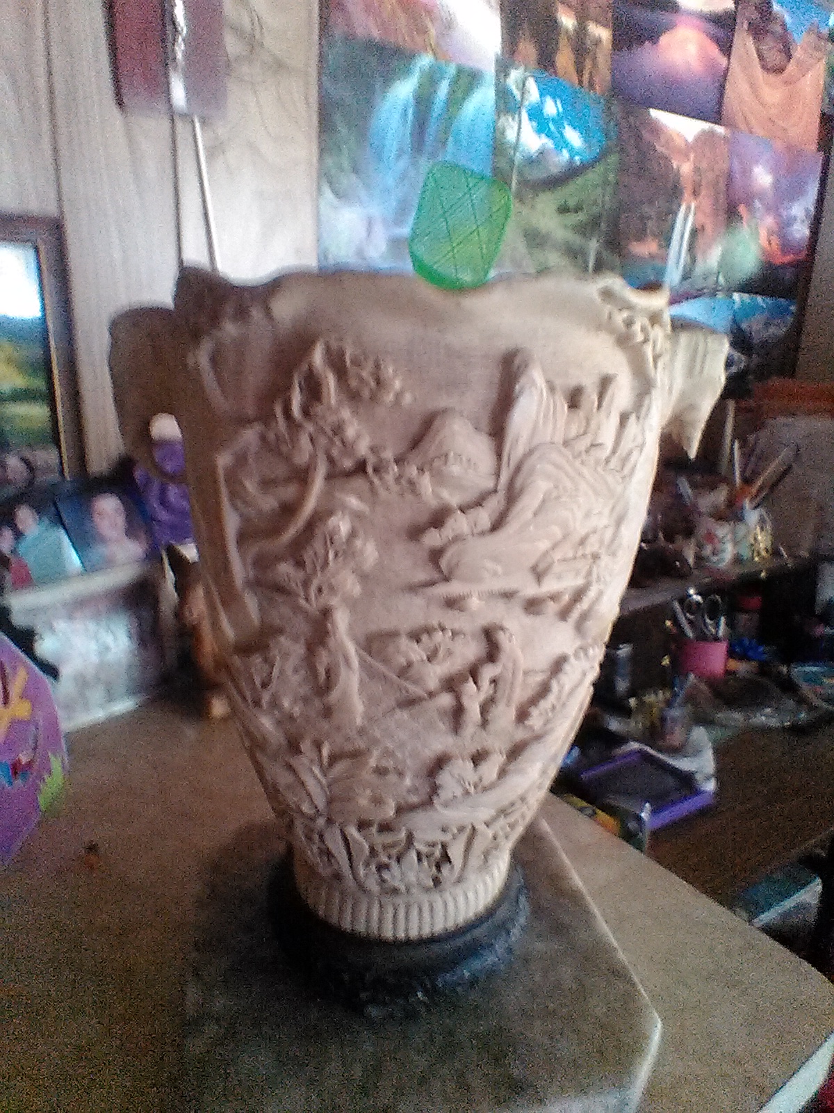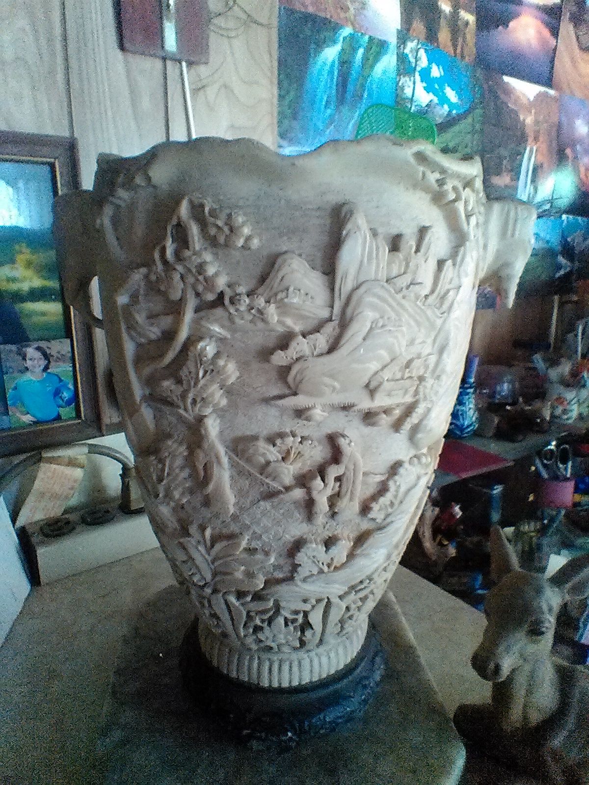 YOU HAVE TO SEE THIS VASE TO BELEIVE , THAT MAN COULD HAVE CREATED SUCH LOVE INTO THIS WORK OF ART. PERHAPS THE SPIRIT OF THE TUSK, IS THE TRUE MAGIC, CARVED FROM A MASSIVE ANAIMAL!.TRULY A WONDER OF MAN AND BEAST MESHING INTO ONE WONDER . THE TIME MUST HAVE BEEN YEARS IN THE MAKING.SEE FOR YOURSELF .