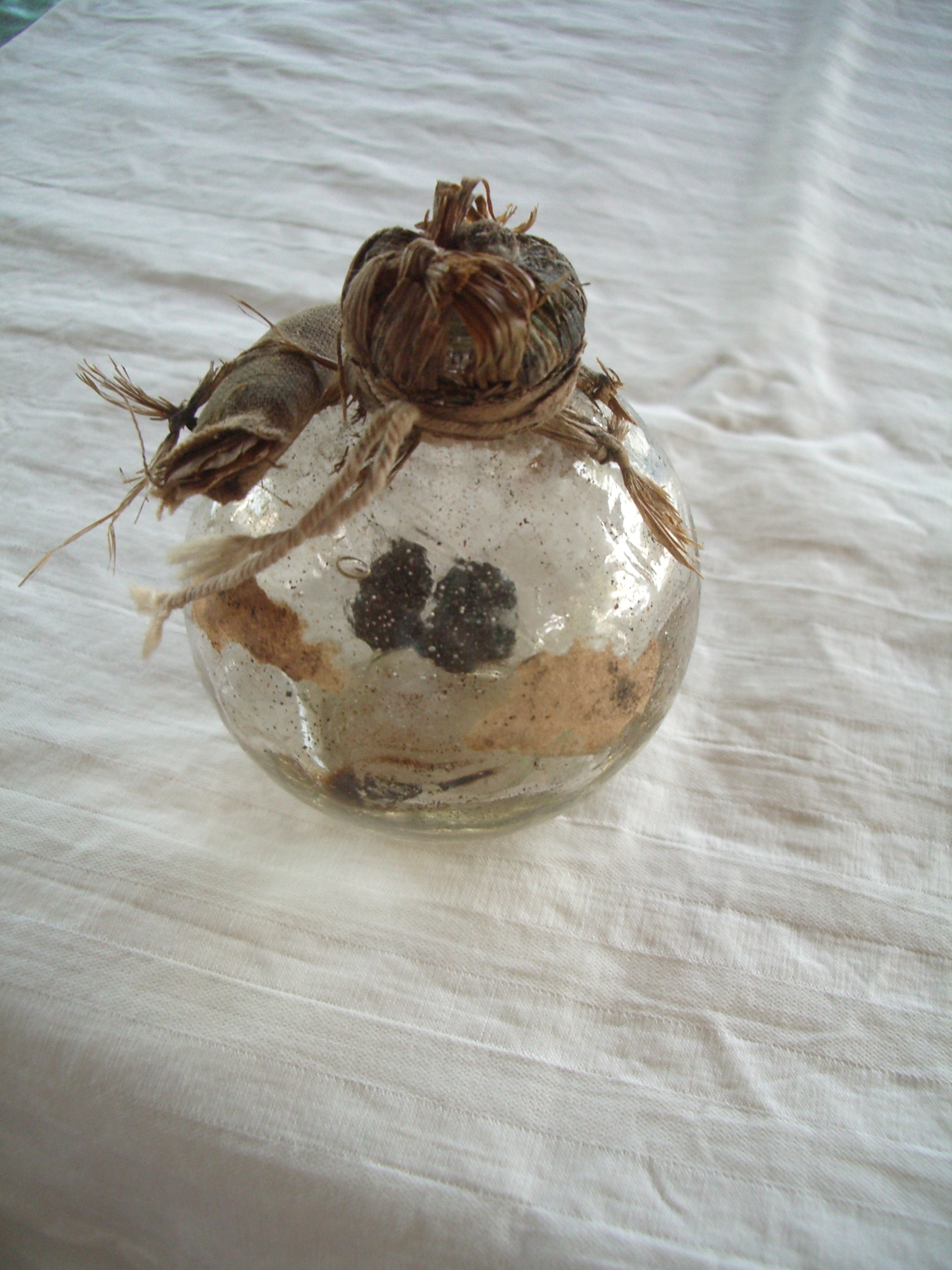 Wanted to share this very unique item and see if anyone has seen one before or if anyone knows anything about this piece. Maybe it is nothing, but maybe it really is something special. The glass bottle has a very small piece of a soft burned wood inside it and the bottle was closed on top with only a kind of tied straw covering the small opening of the bottle. Before we disturbed it, it is clear that the small piece of wood was put inside and closed in. The bottle is very old I think because there are bubbles throughout the glass and no mark on the bottom of the bottle. There are many little pieces of debris throughout the glass and the straw on top of the bottle is crumbling when touched. It is dense and heavy. There was a very tiny square hand sewn cotton cloth packet tied around the top of the bottle and inside was a very tiny piece of folded up paper. The paper is so old it either had no writing on it or the writing is totally gone now. The paper is crumbling when touched/unfolded (we used a tweezers). The bottle was possibly covered in paper at one time, or at least now there are a very few small patches of paper on the outside of the bottle. What you see hanging from the side is the tiny pouch that was found tied around the top of the bottle. We are so intrigued by this piece and only wish there had been some writing on the paper we found. The bottle was found at an estate sale.