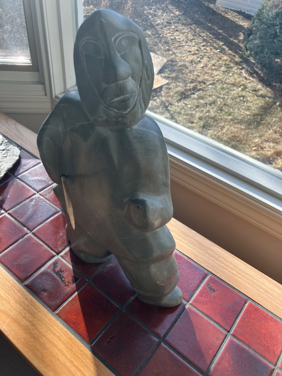 Physical Description: This Inuit soapstone carving stands approximately 14 inches tall and features a stylized human figure. The sculpture is crafted from a smooth, grayish-green soapstone, known for its durability and fine detail. The figure has a rounded head with prominent facial features, including a pronounced nose and mouth, and a slightly hunched posture. The carving exhibits a polished finish, enhancing its aesthetic appeal.