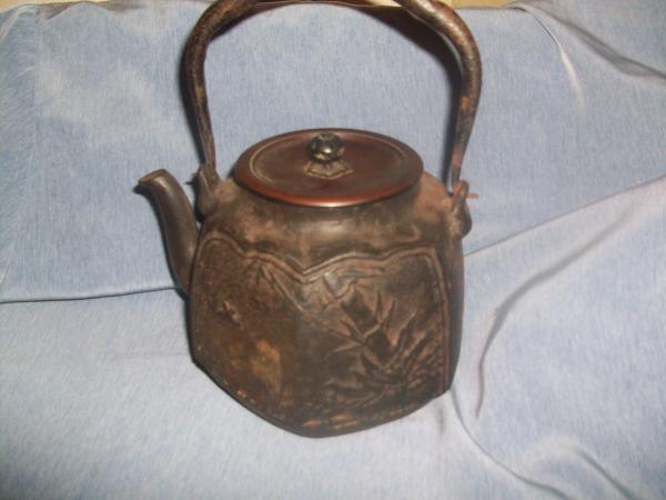 iron tea kettle, and asian scenery on it, markings on inside of brass lid, I know nothing about this and would like any info.