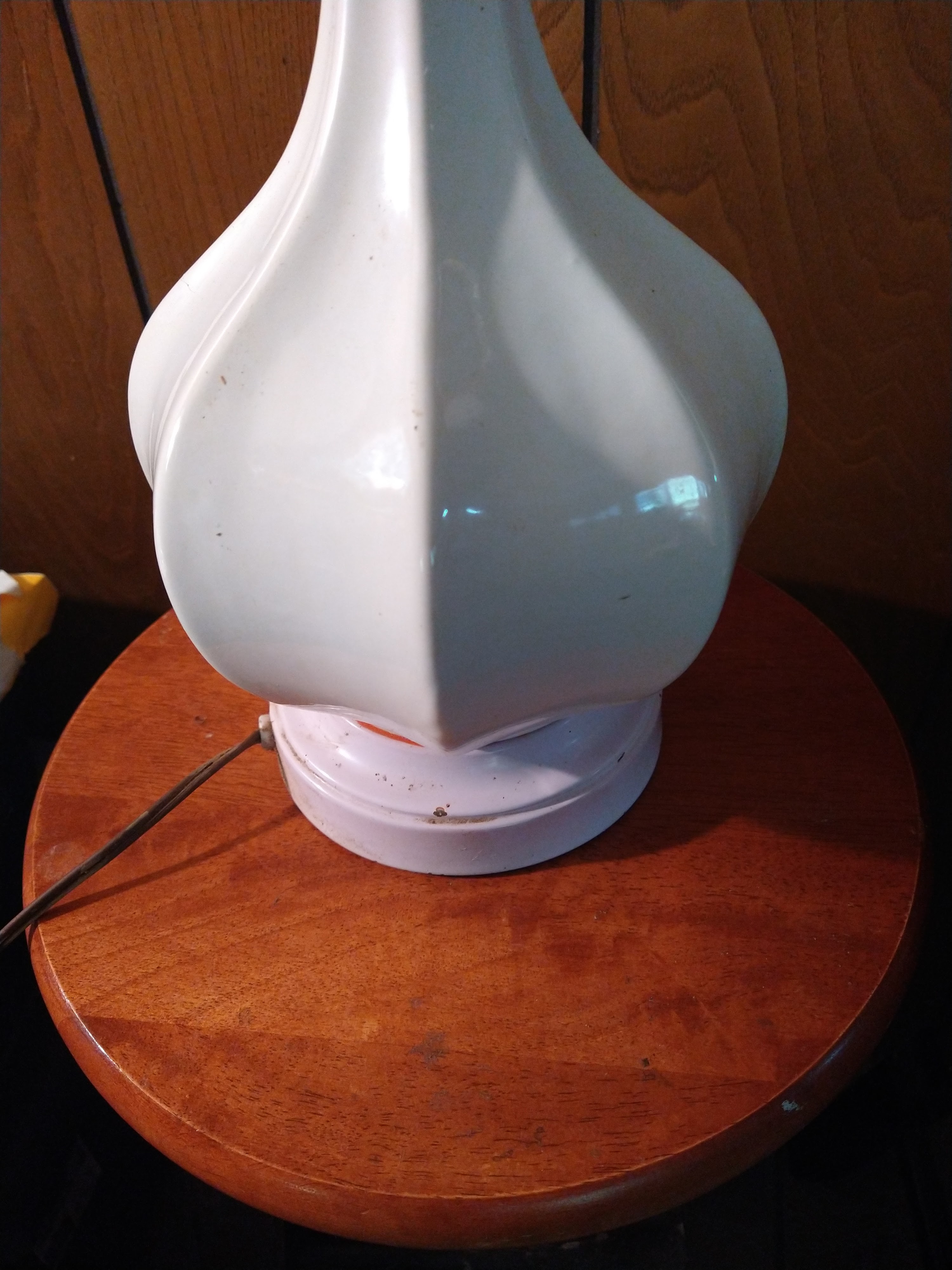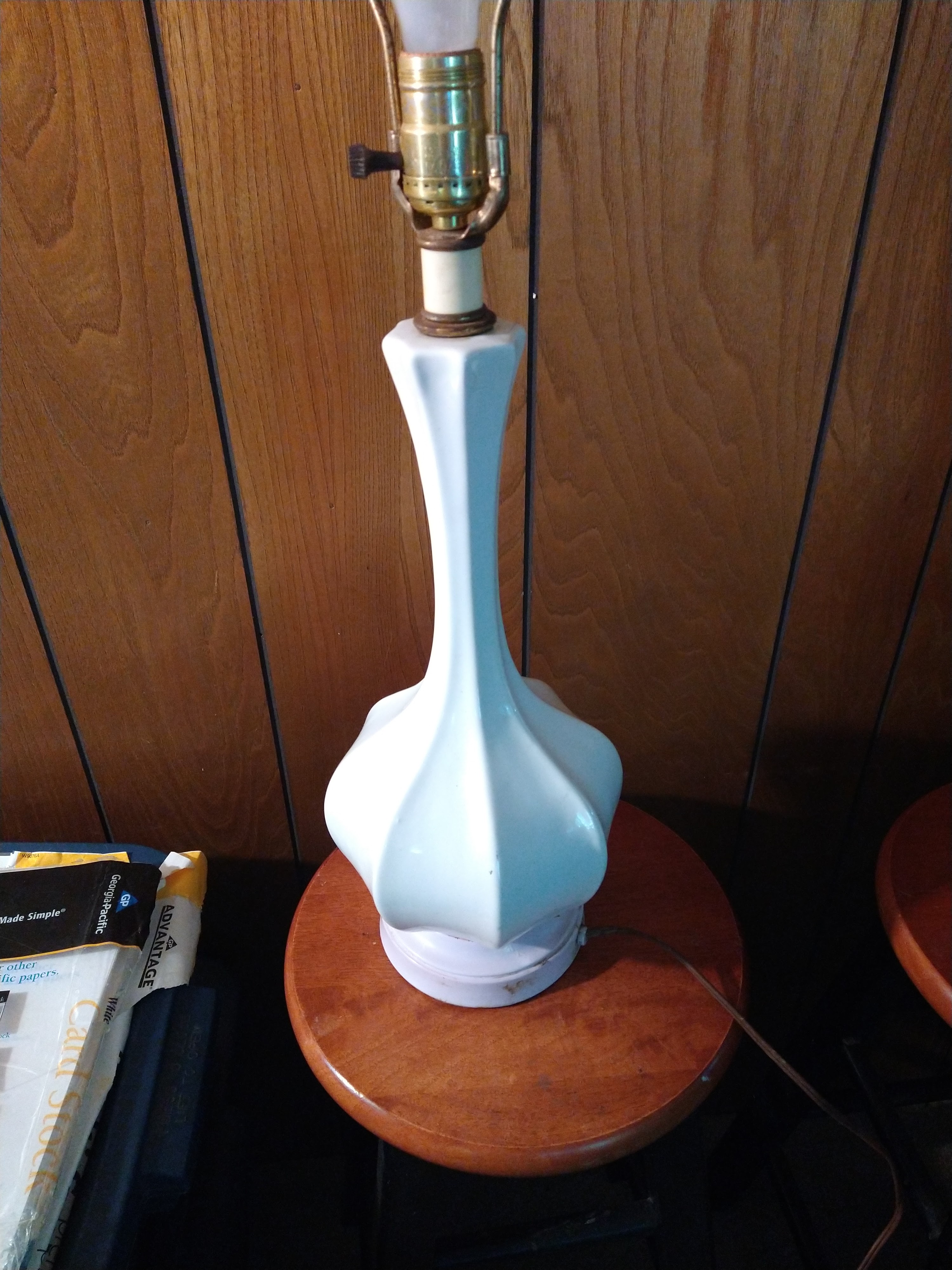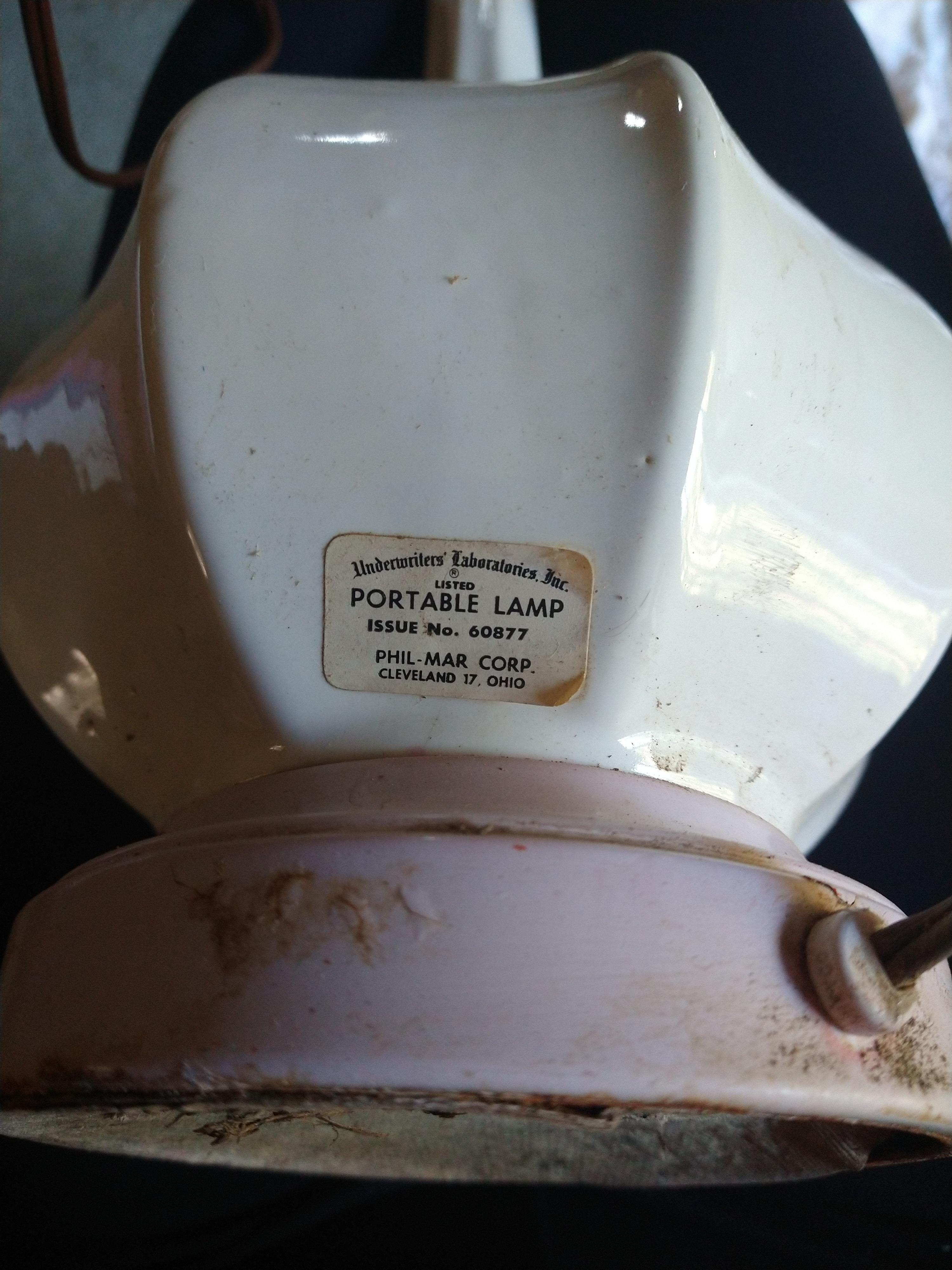 This lamp is porcelain with possibly a wood base. It has a UL listed sticker "Portable Lamp Issue No. 60877 / Phil-Mar. Corp. / Cleveland 17 Ohio" and is off-white with a lilac trim. I am hoping someone can give me more information and even a value to list it at. In good, working condition but missing original shade. Shows signs of use.