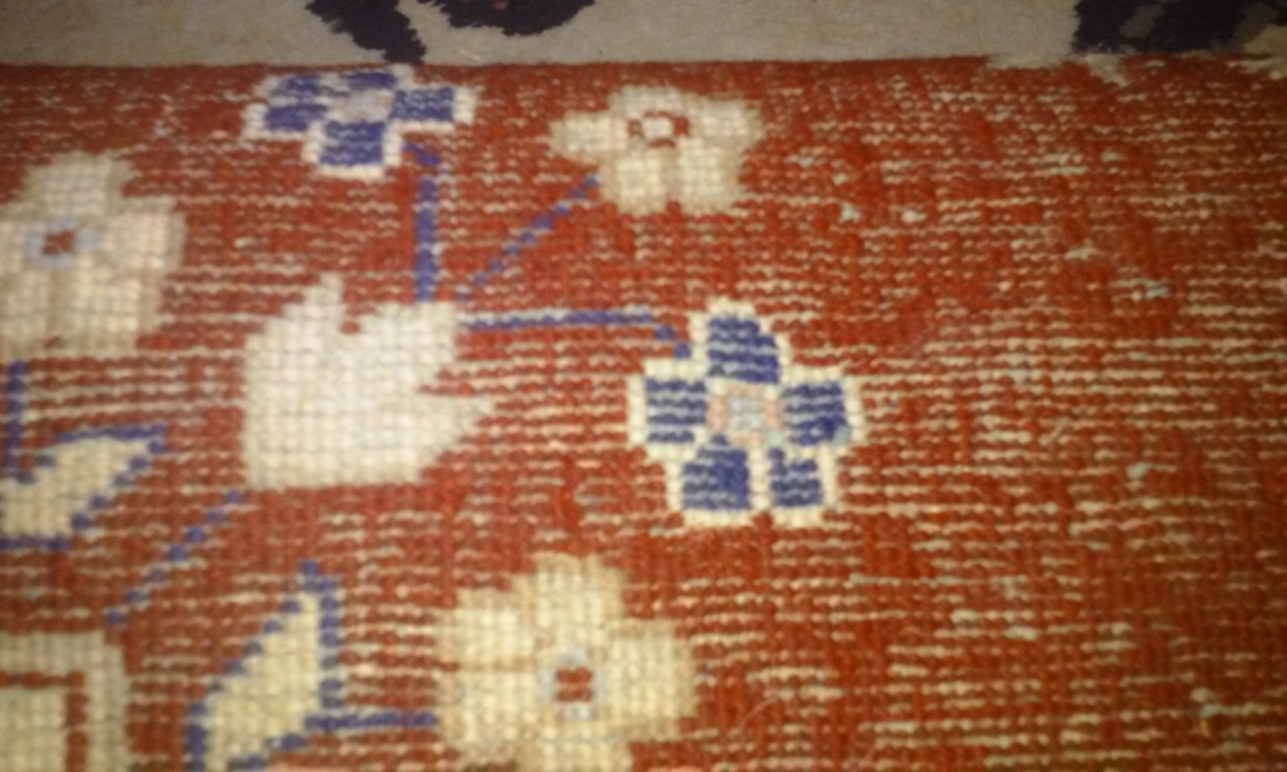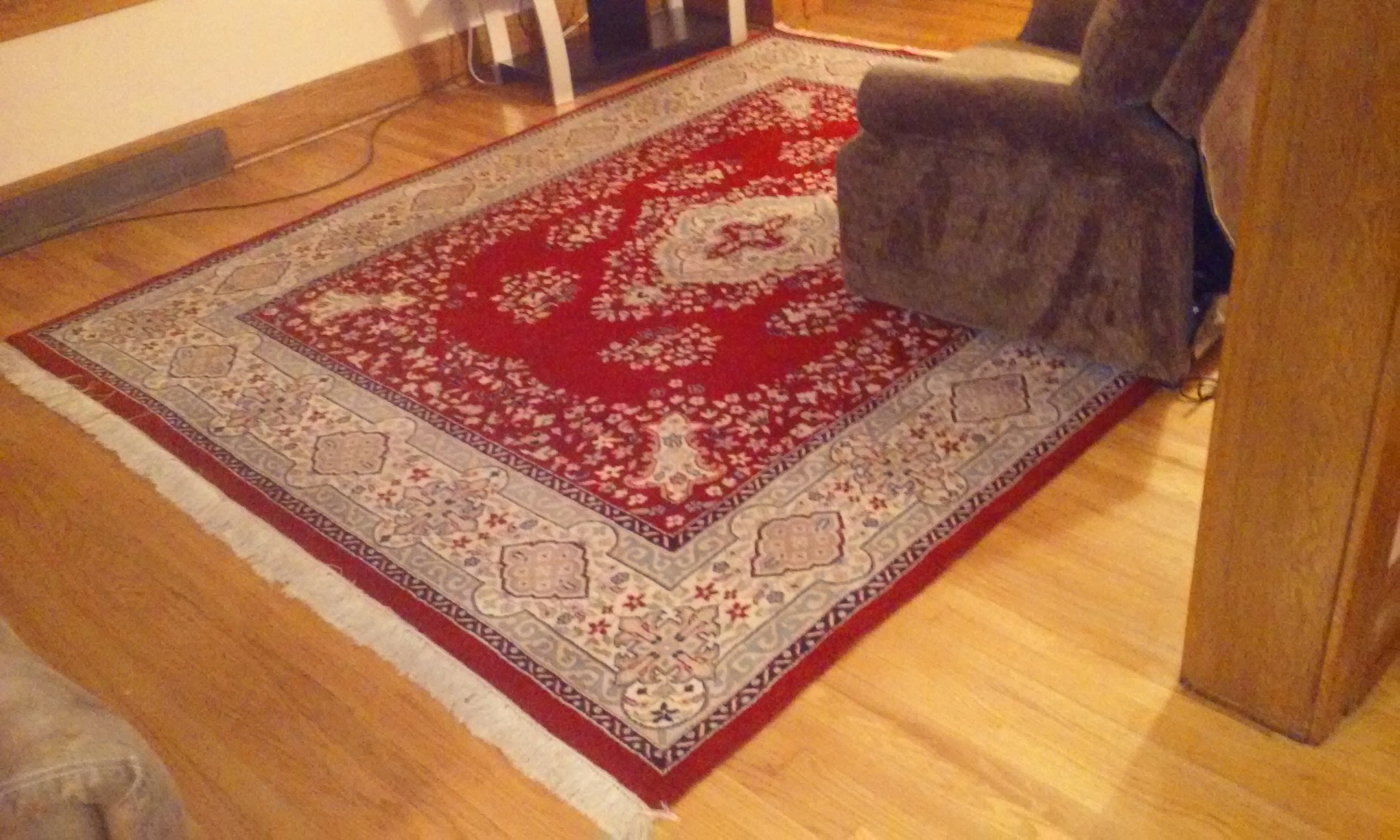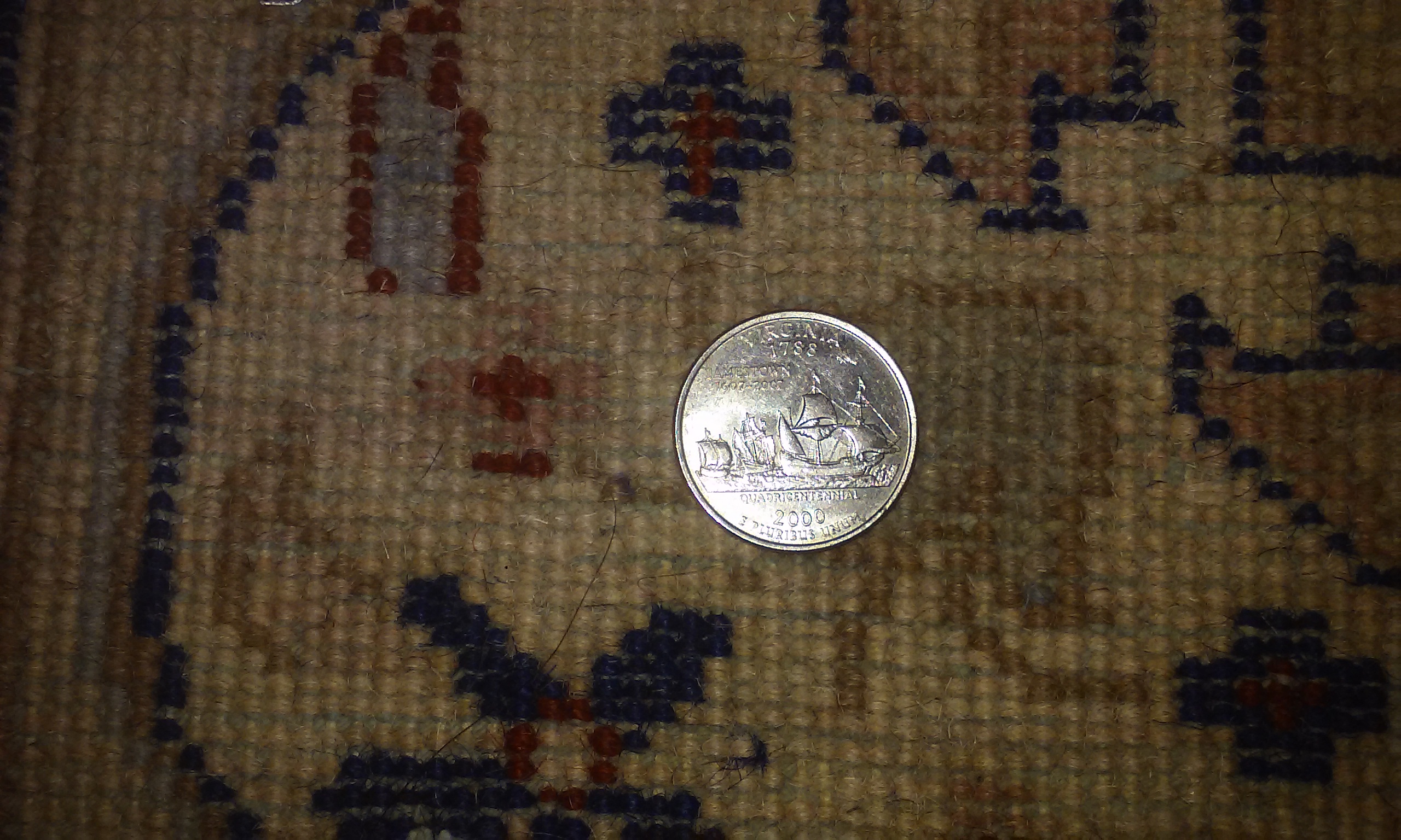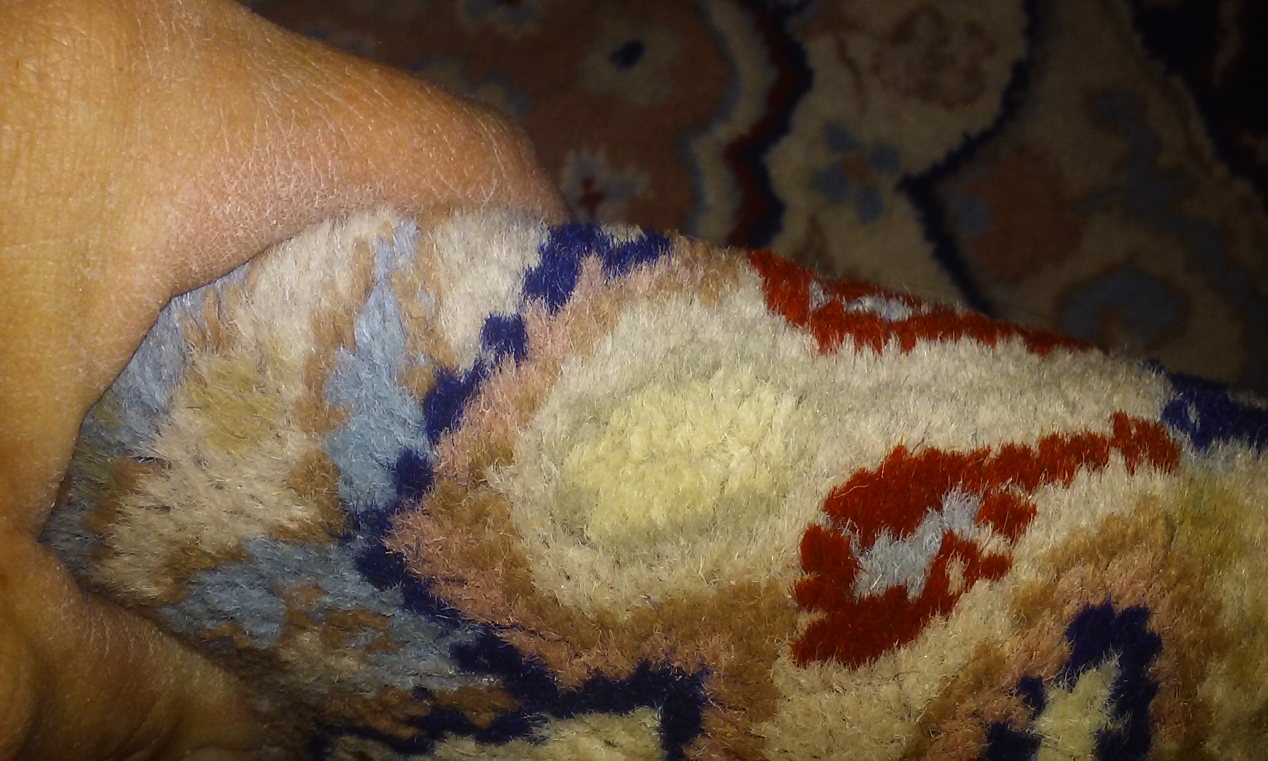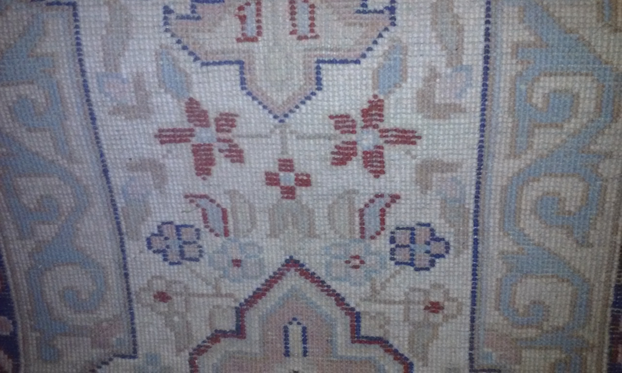 8' 11" and some X 9' 11" and some. It has 6 different colors. Also you'll see where I found maybe a date it was made? The seller said it was her Grandfathers and its 50yrs old and thats all she knows. There is NO wear, fading, tears, fringe missing, or any stains. I have research so many sites to get an idea of what type it is, because I have never purchased one before. Did learn about some to make me think I have a possible antique handmade wool/silk? Persian rug. Along with photos I learned are needed to inquire. Thank goodness for this site. Wish me luck!