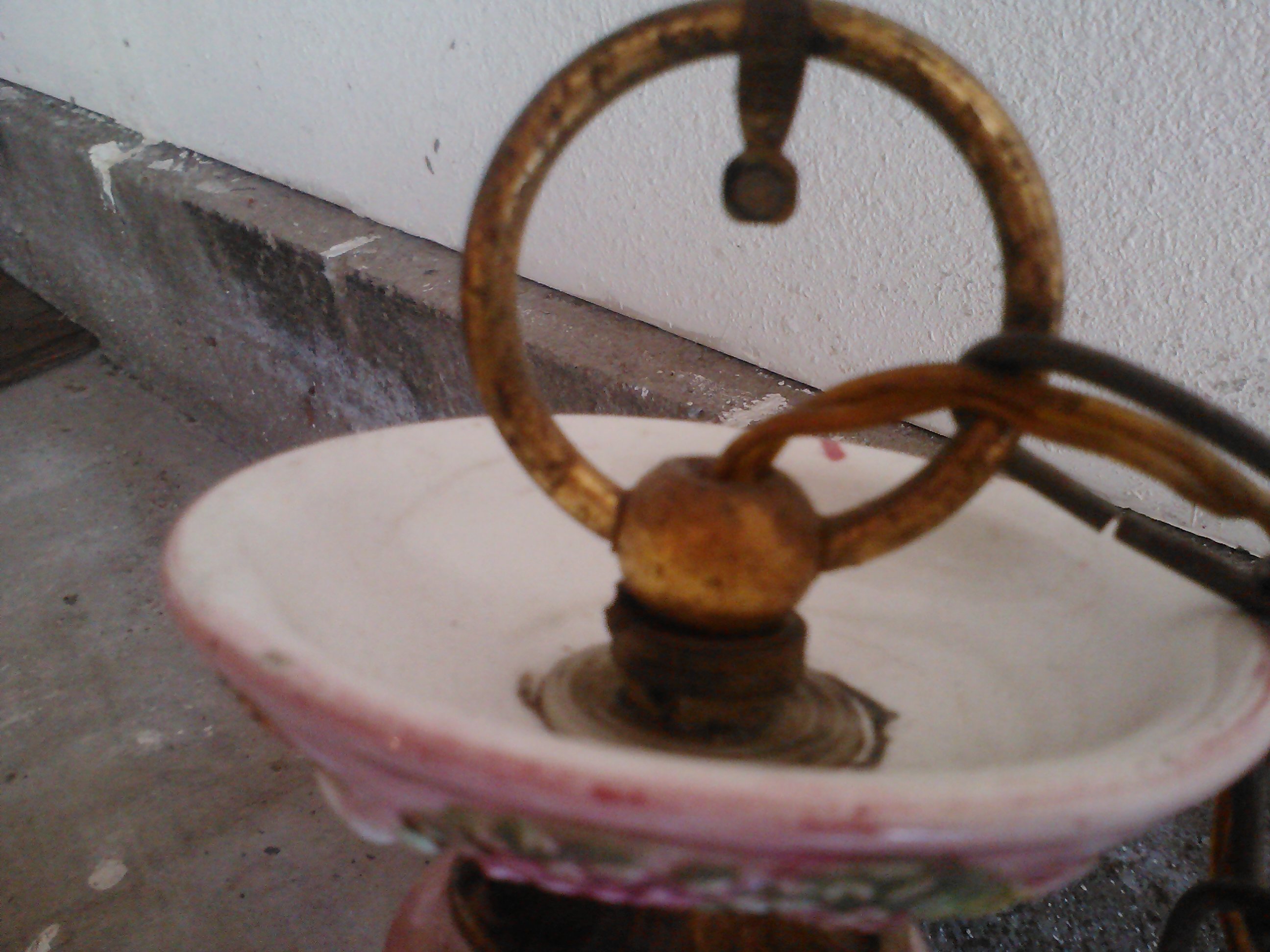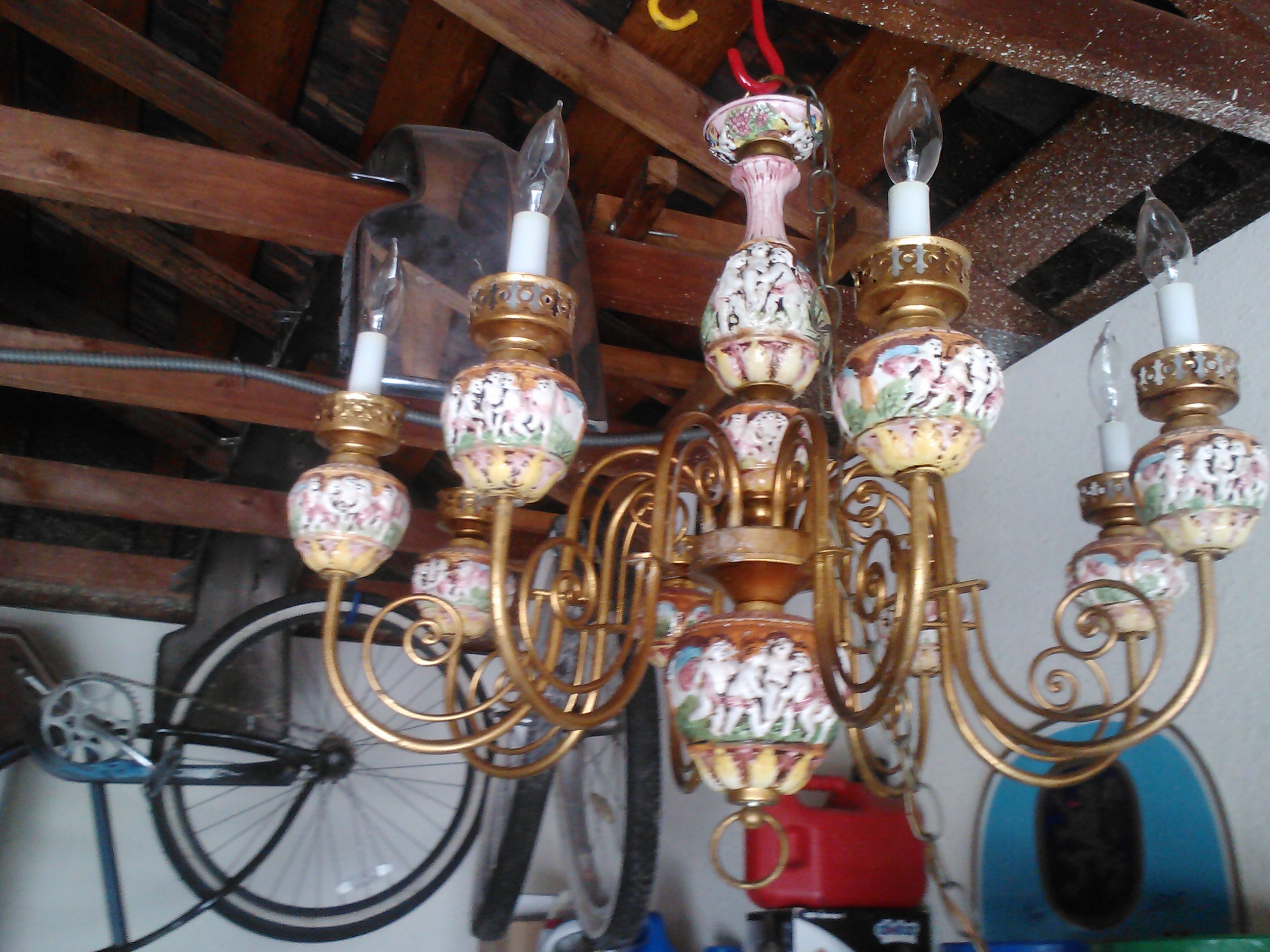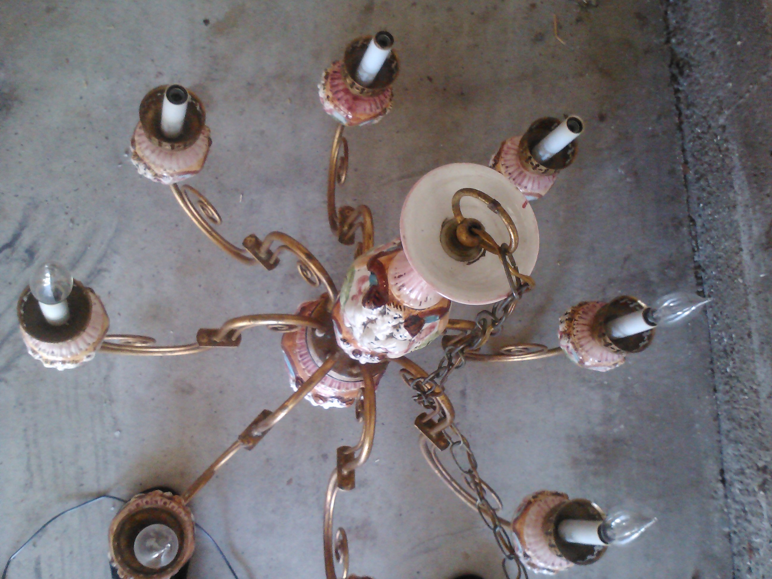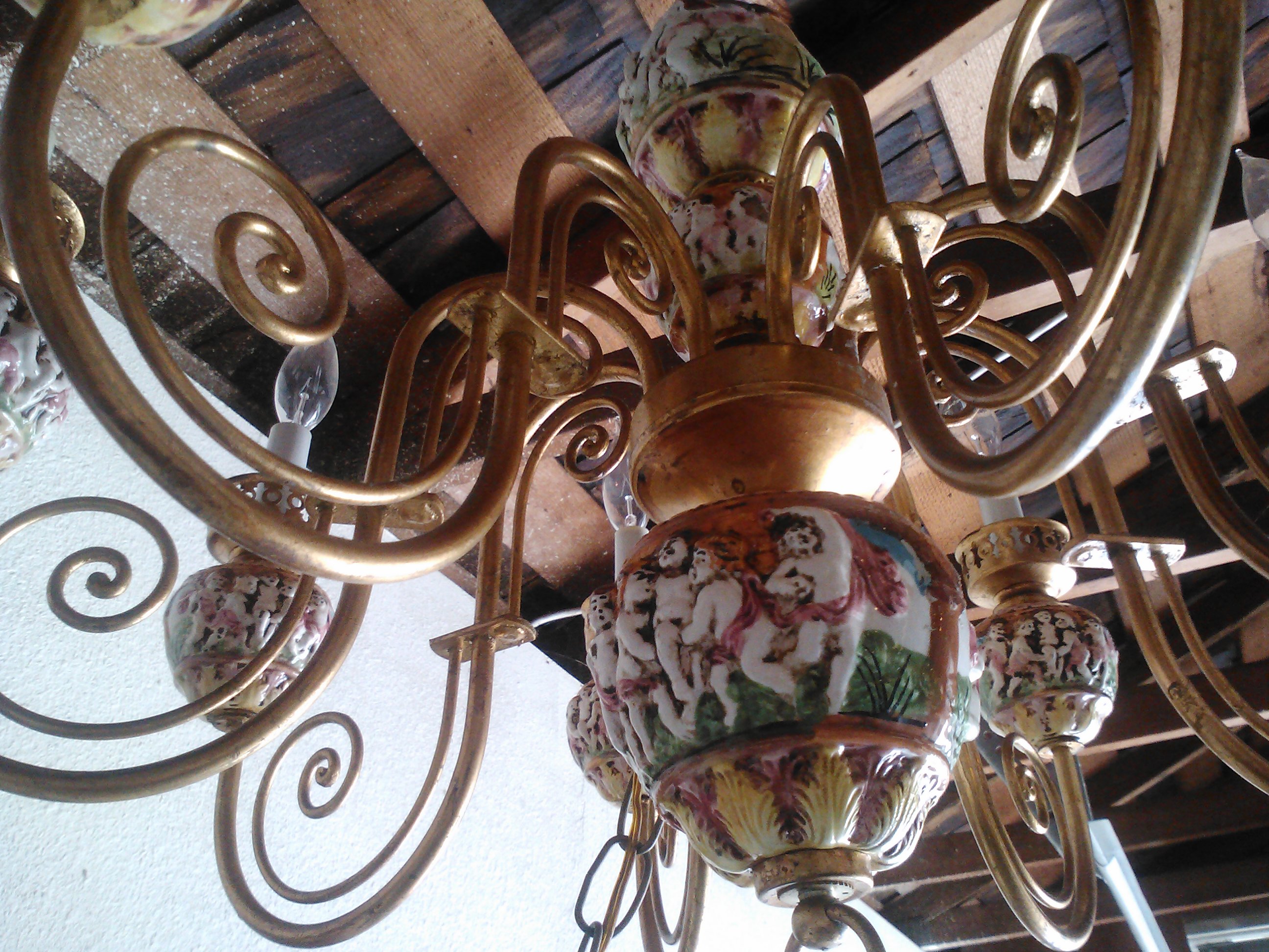 Next to perfect condition, no damage at all, works perfect. Has 8 solid brass arms with gold coating. From Italy brougt back in the 70s. Porcelain piece with cherubs.