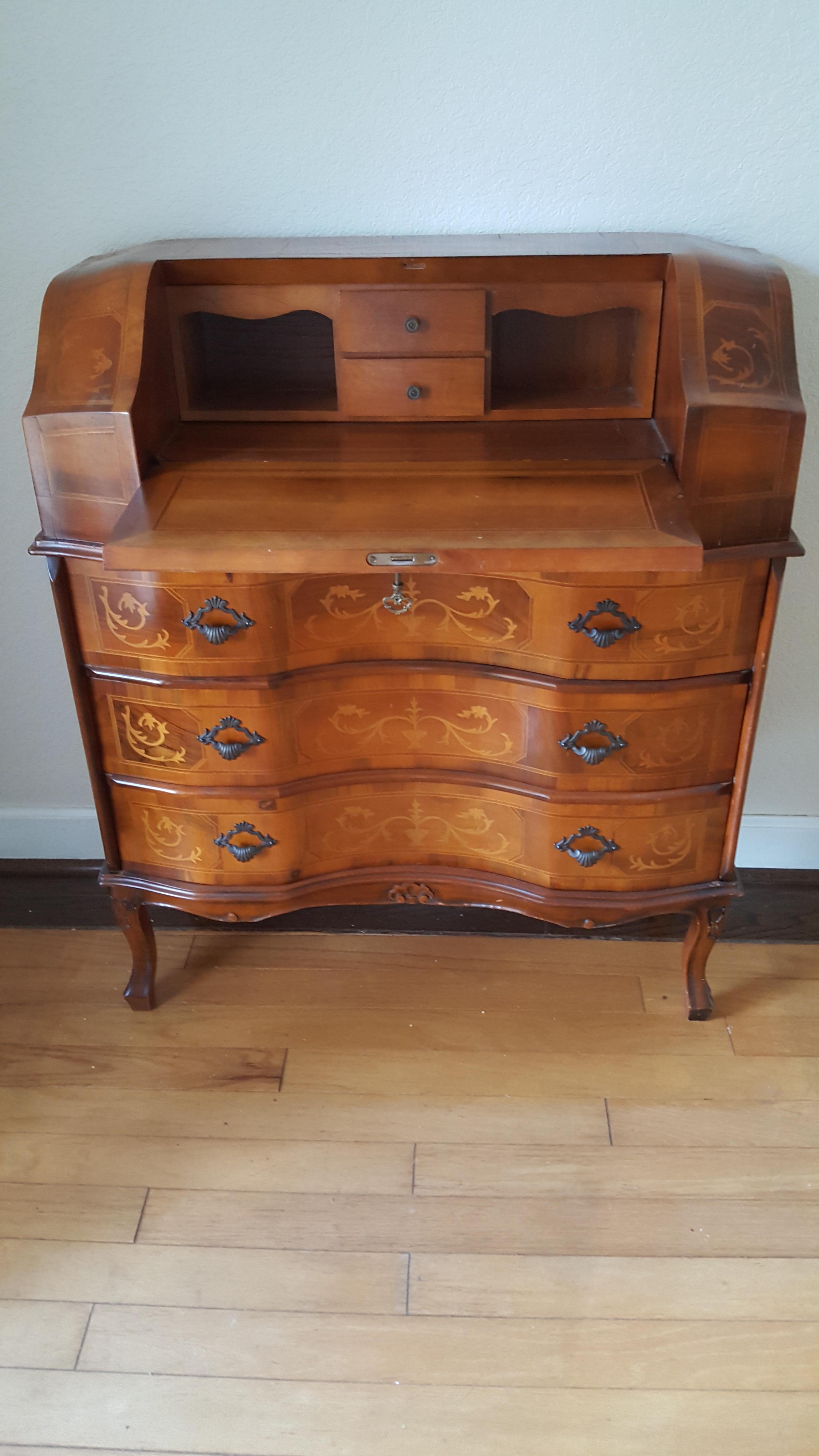 This gorgeous writing bureau features 3 large drawers and a top door that opens downward to a small cabinet. The intricate handles add a nice touch of detail. The marquetry inlay, however, is what makes this piece truly special.