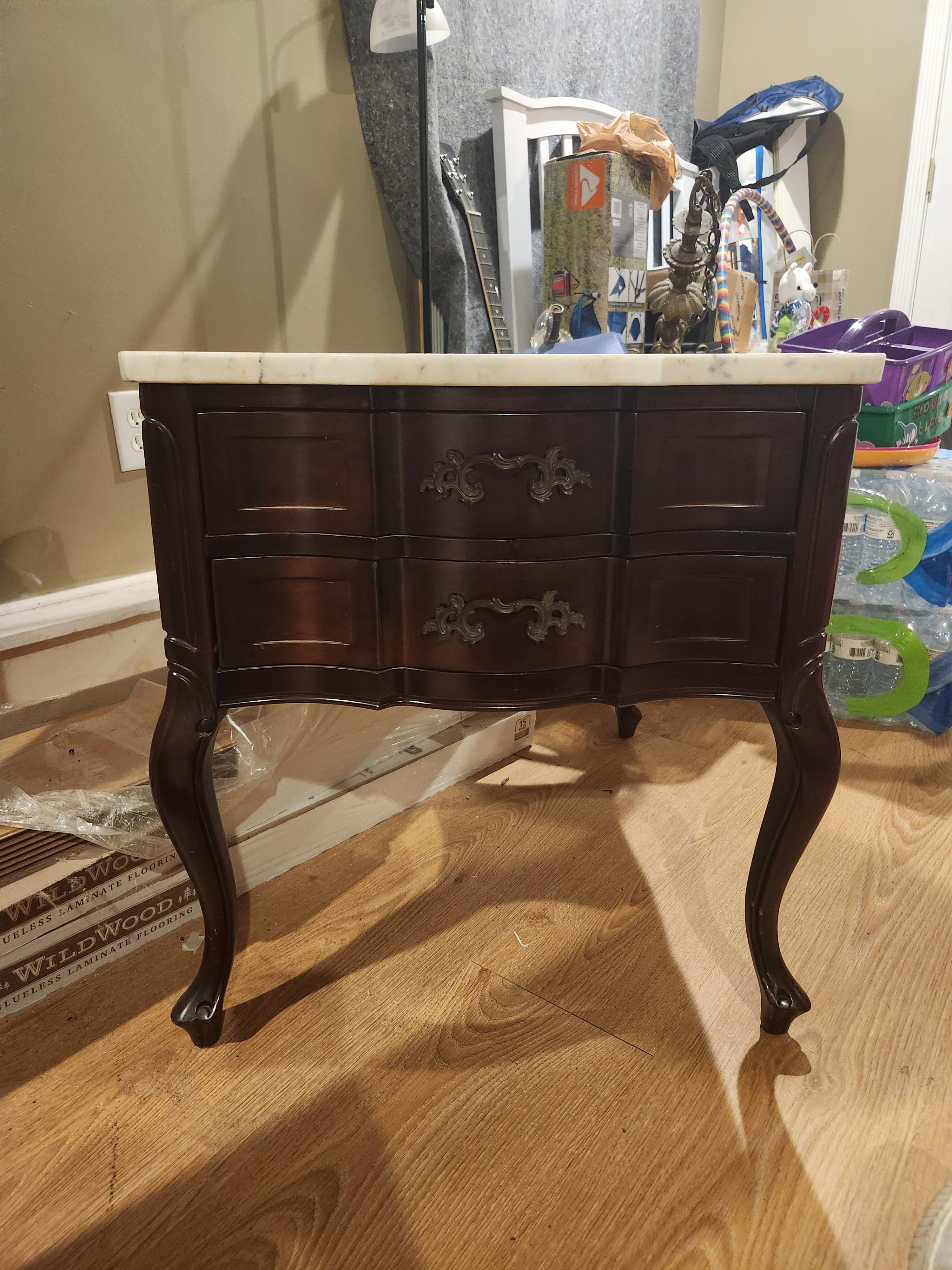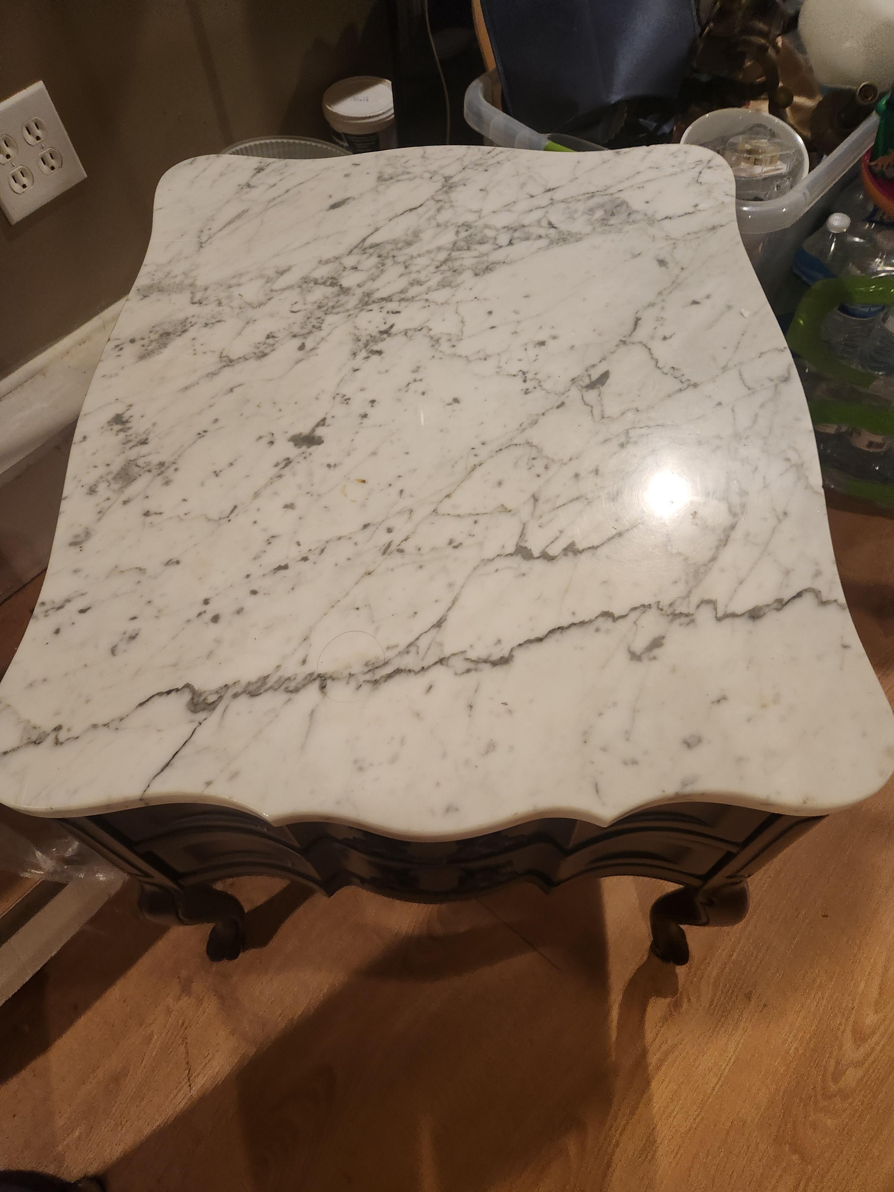 Pair of wood end tables with scalloped Italian marble top