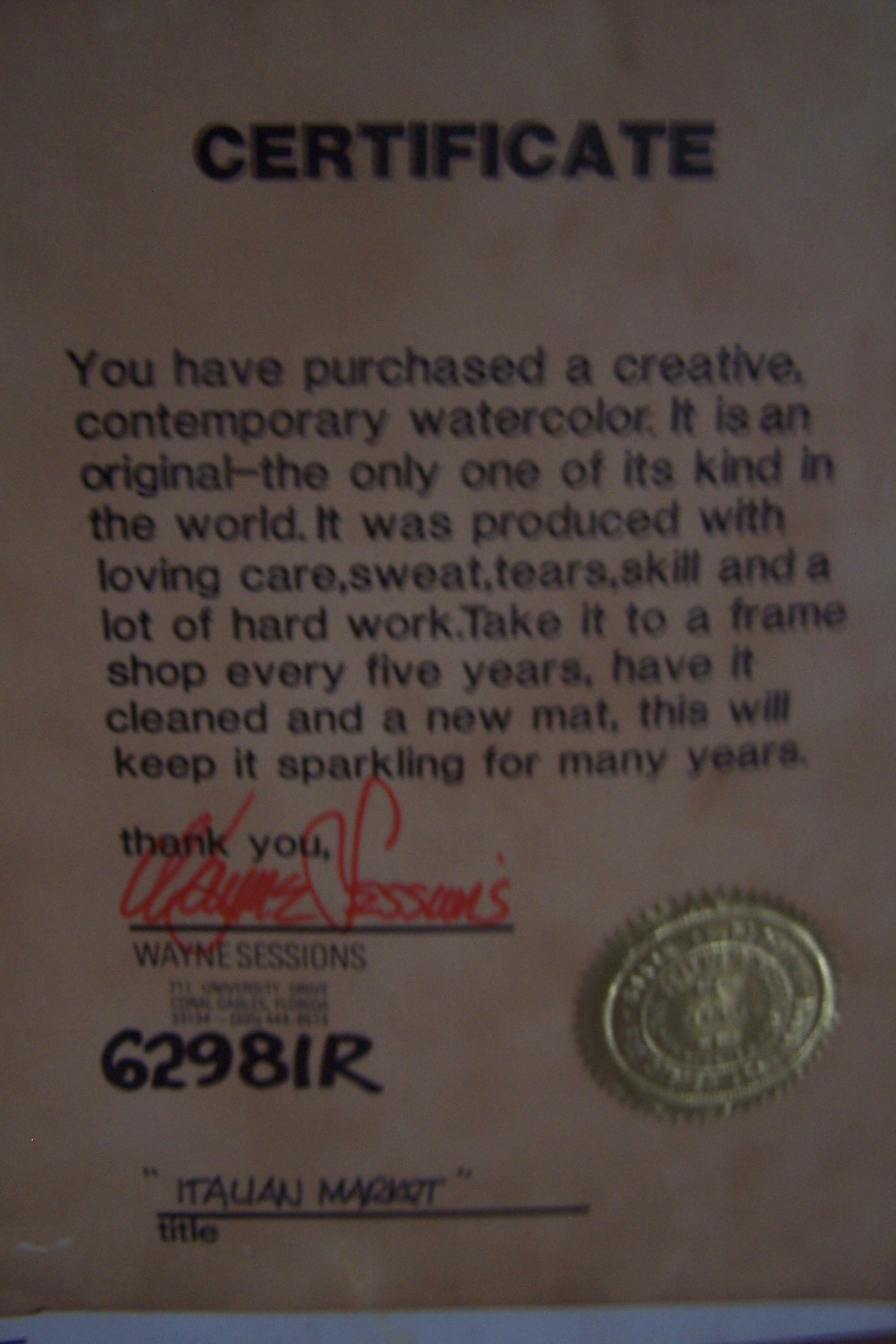 Wayne Sessions Original Signed Watercolor Italian Market, Cert # 62981R, 1970's