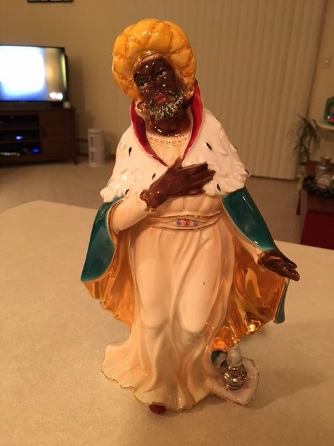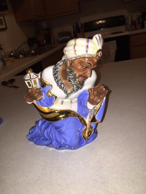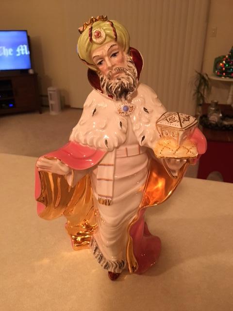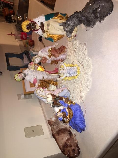 I have a nine piece nativity set. They are hand painted and numbered porcelain from Italy, the writing on the bottom is in gold for all pieces except for the ox and donkey. The blue stickers on the bottom say "Made by Aldo for Gloria" and "Made by Aldo for J.B." The two tallest wise men figures stand about 12 inches tall, with Mary and Joseph and other wise man standing around 9 inches.