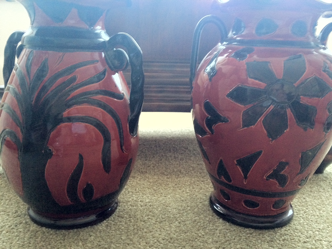 Vases are black and red and the designs are not painted on, but rather are a little raised/indented.  They are approximately 18" tall each, and both have handles.  An interior designer friend said they looked like Italian Olive Urns.  I have no other real history of these vases except they are perhaps 50 (or more) years old.