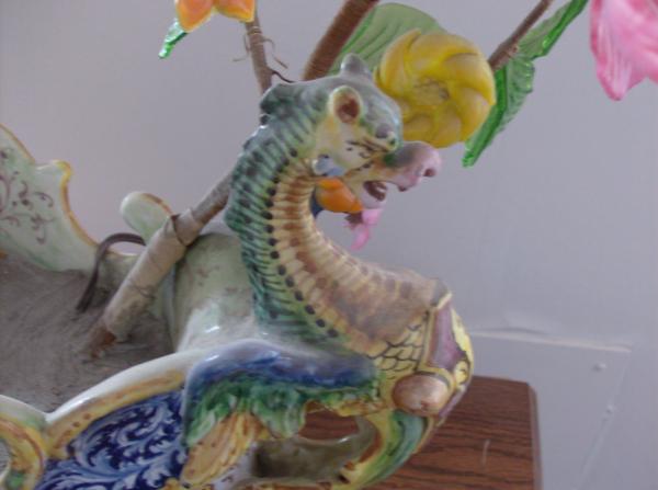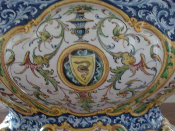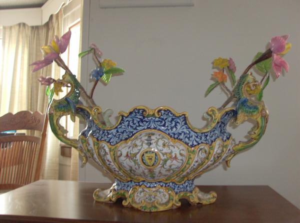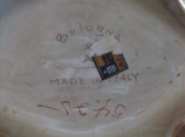 This antique table lamp fixture has been sitting on the mantle of our family owned funeral home business for as long as anyone - including my grandparents can remember...We are looking for information on it to see what it is worth and possibly what artist made it. The only identifying marks on it are located on the bottom and they read "Bologna, Italy" and there is something that looks like a crest painted on it and below it in a banner it reads, "Salve."
