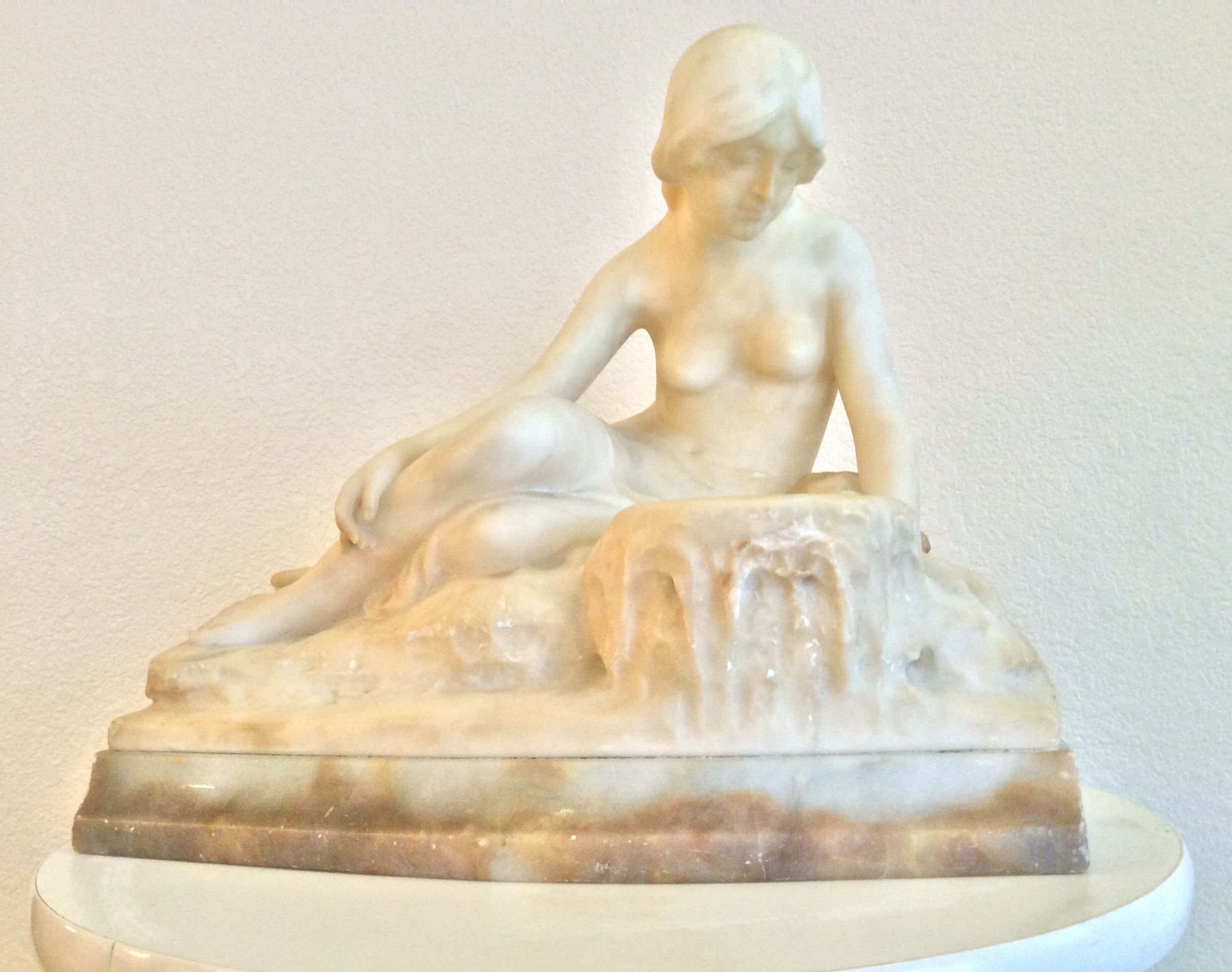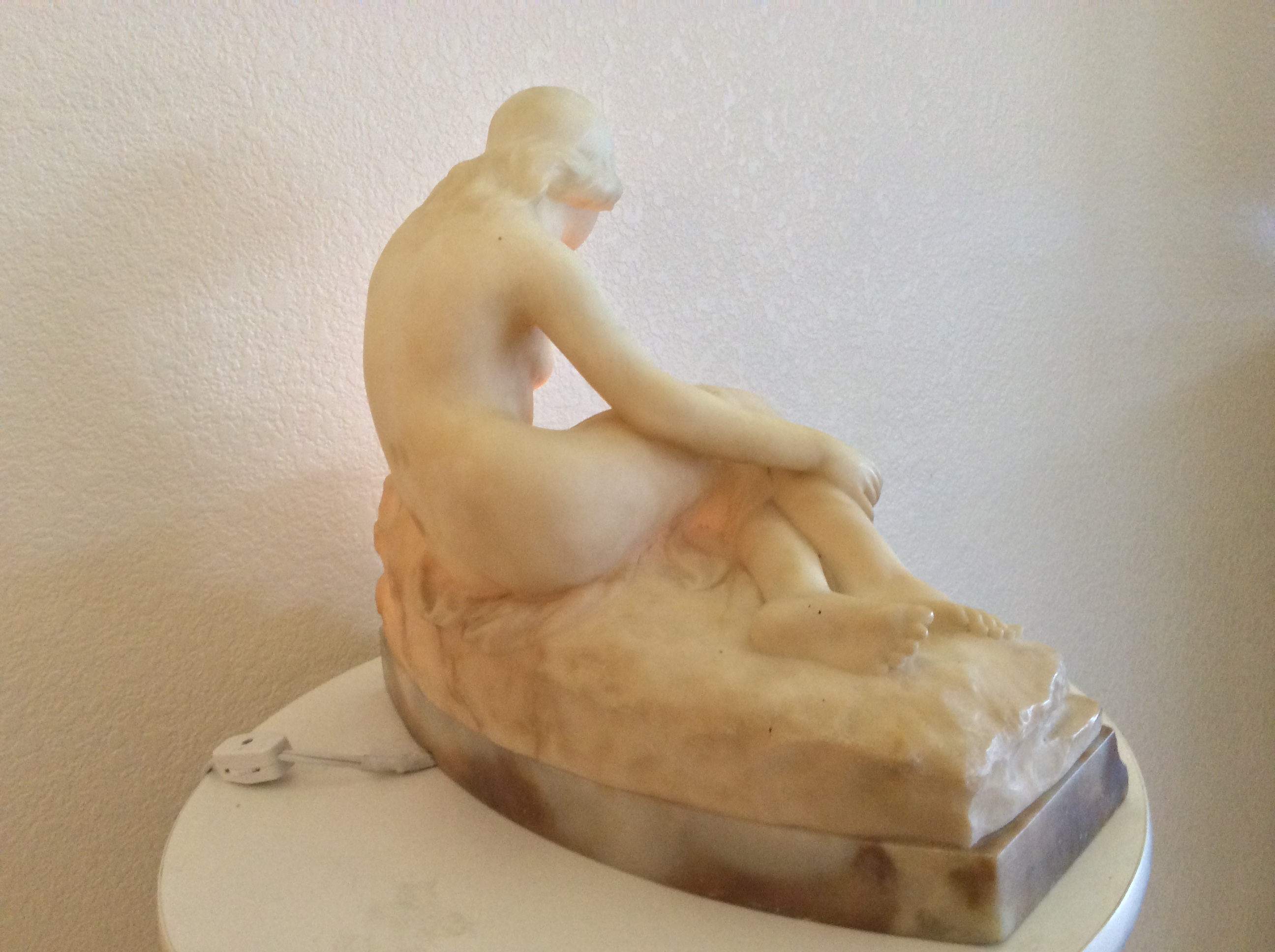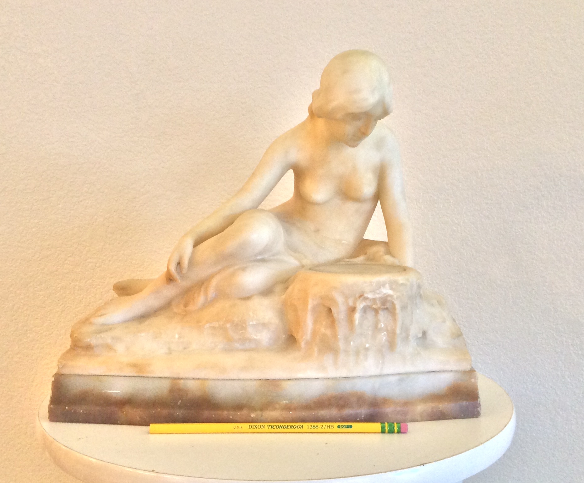Sculpture was inherited, it appears to be marble, has "made in Italy" carved on the back. It is a female, semi- nude, in repose. She is gazing into what appears to be a well. The well lights up - I remember as a child my parents had the cord and light restored.