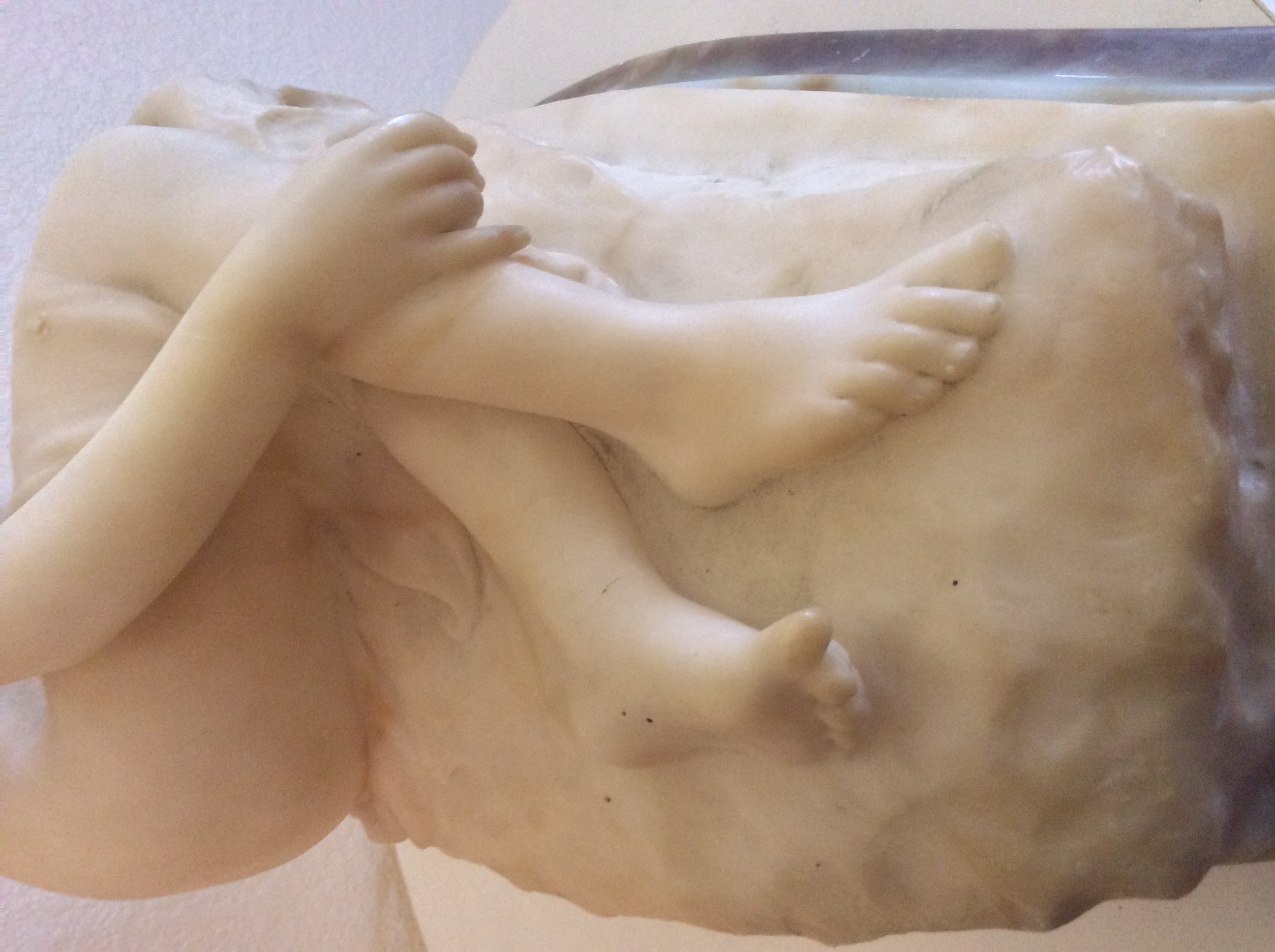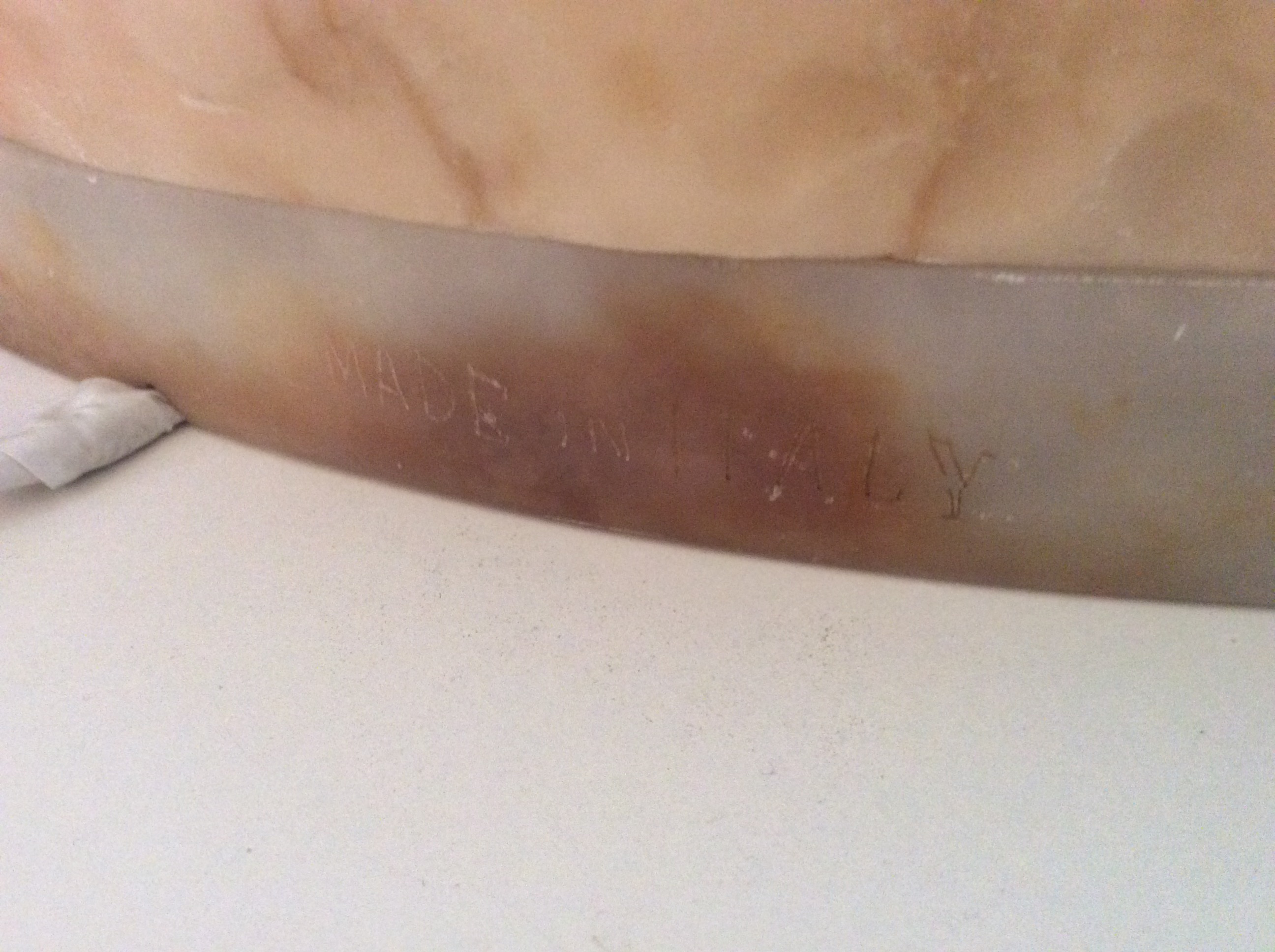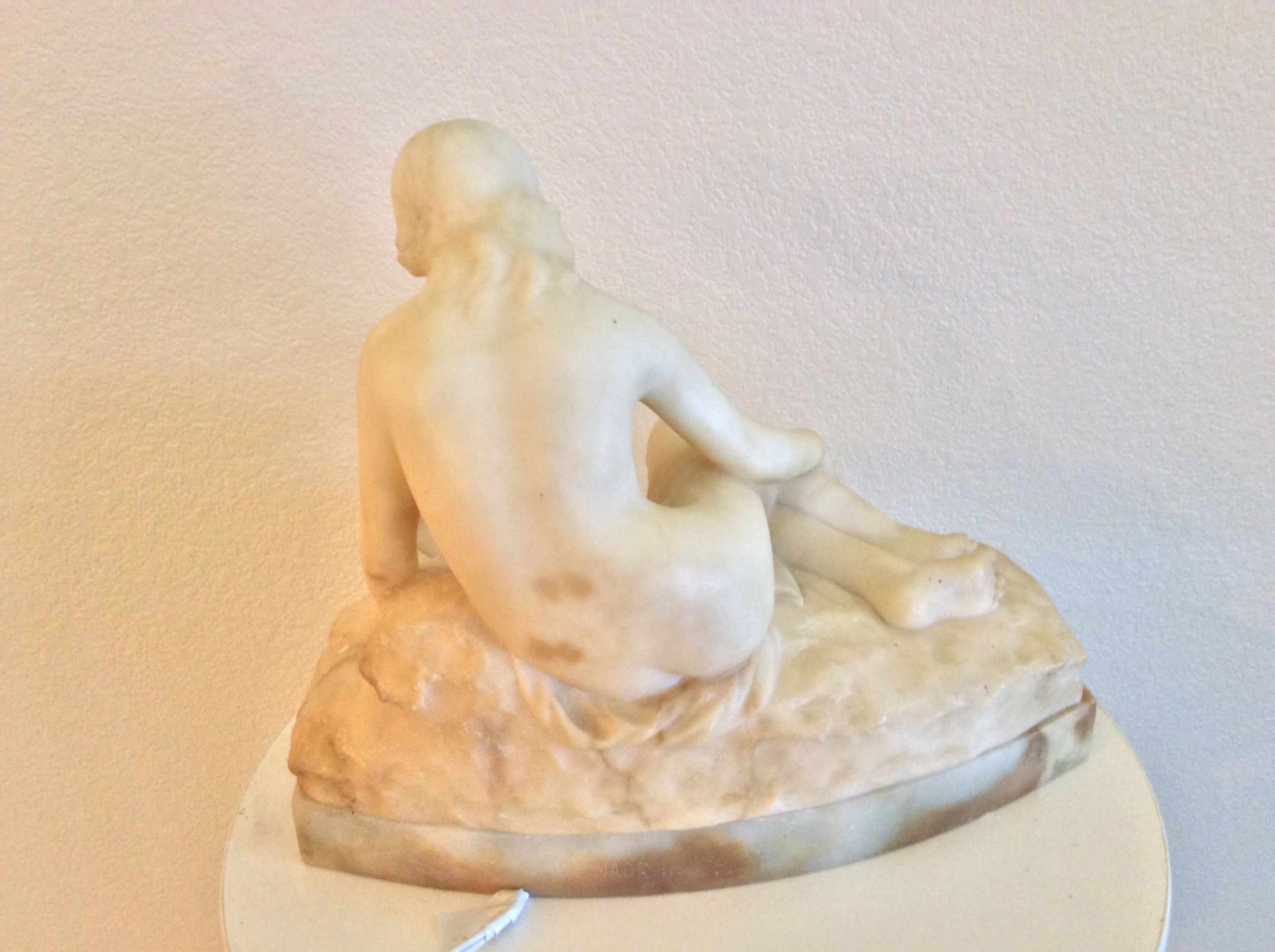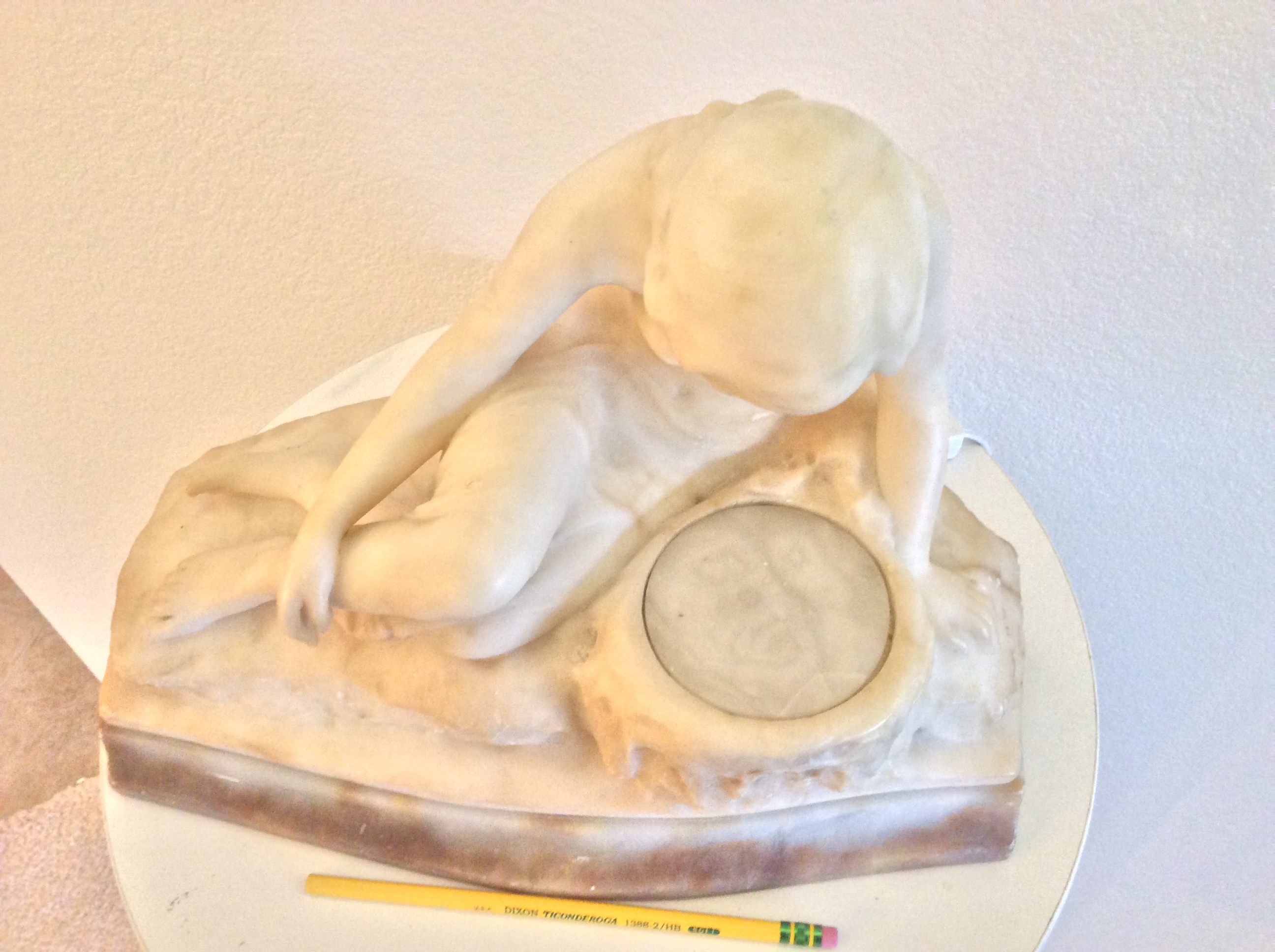 Sculpture was inherited, it appears to be marble, has "made in Italy" carved on the back. It is a female, semi- nude, in repose. She is gazing into what appears to be a well. The well lights up - I remember as a child my parents had the cord and light restored.