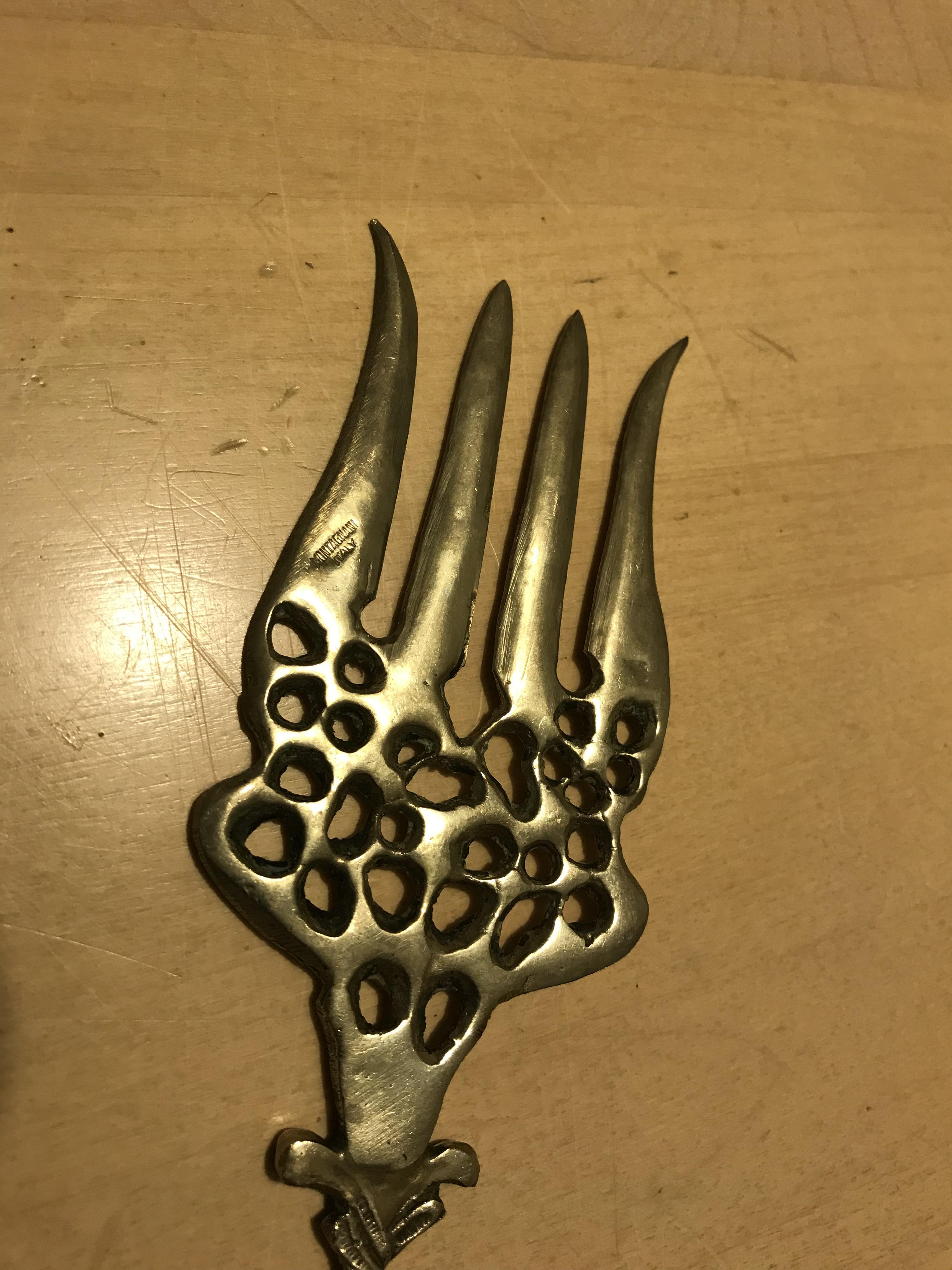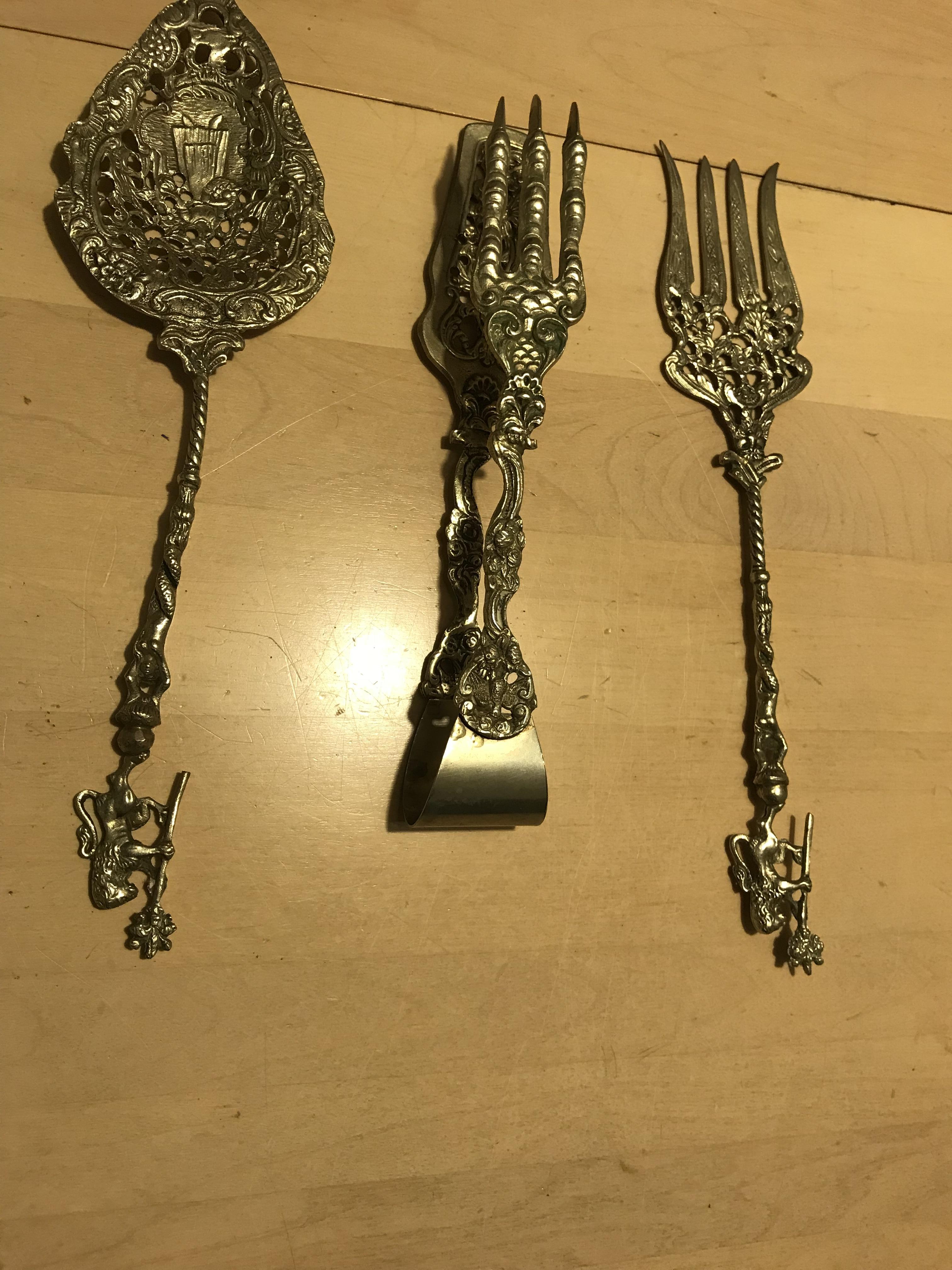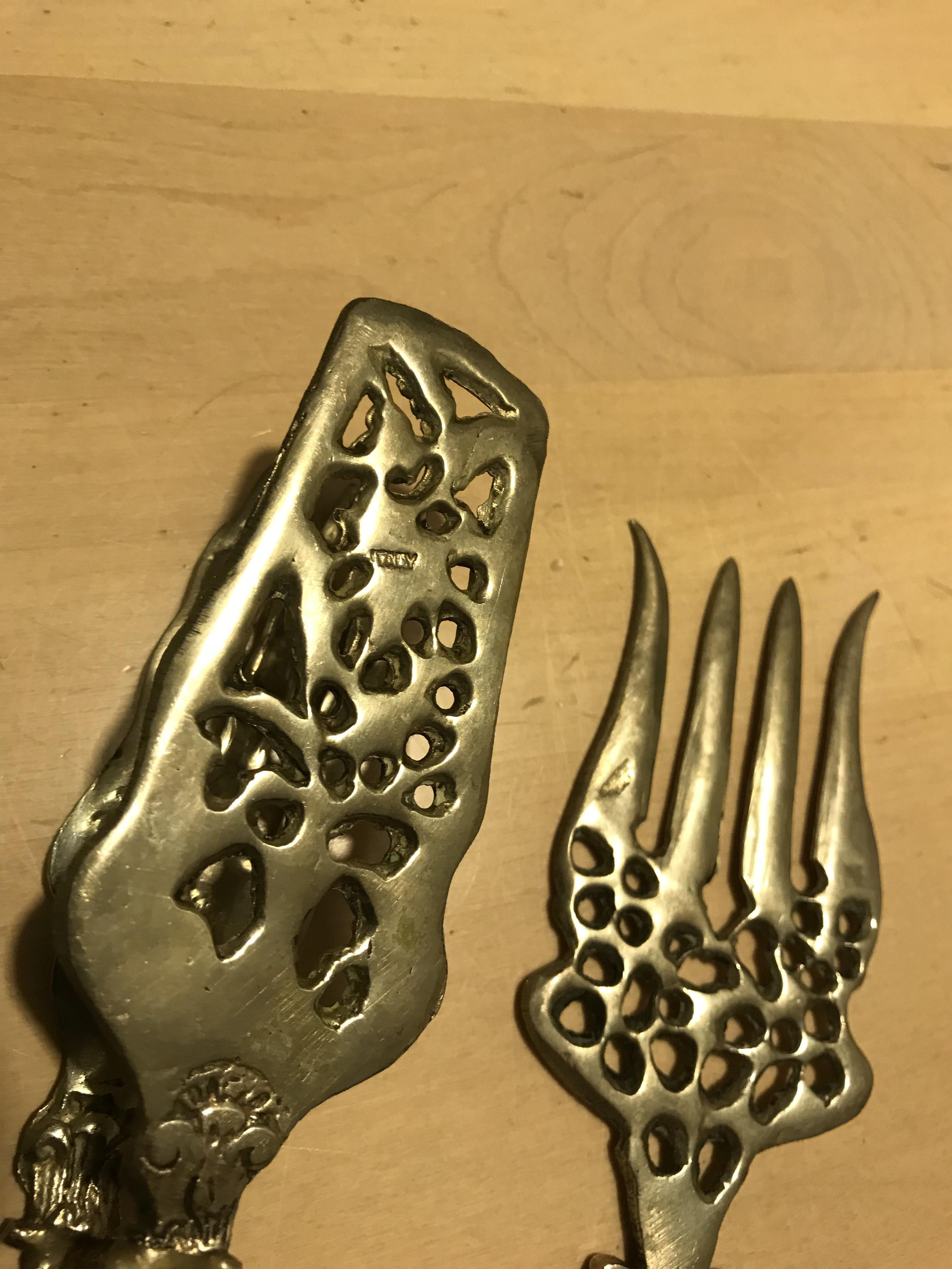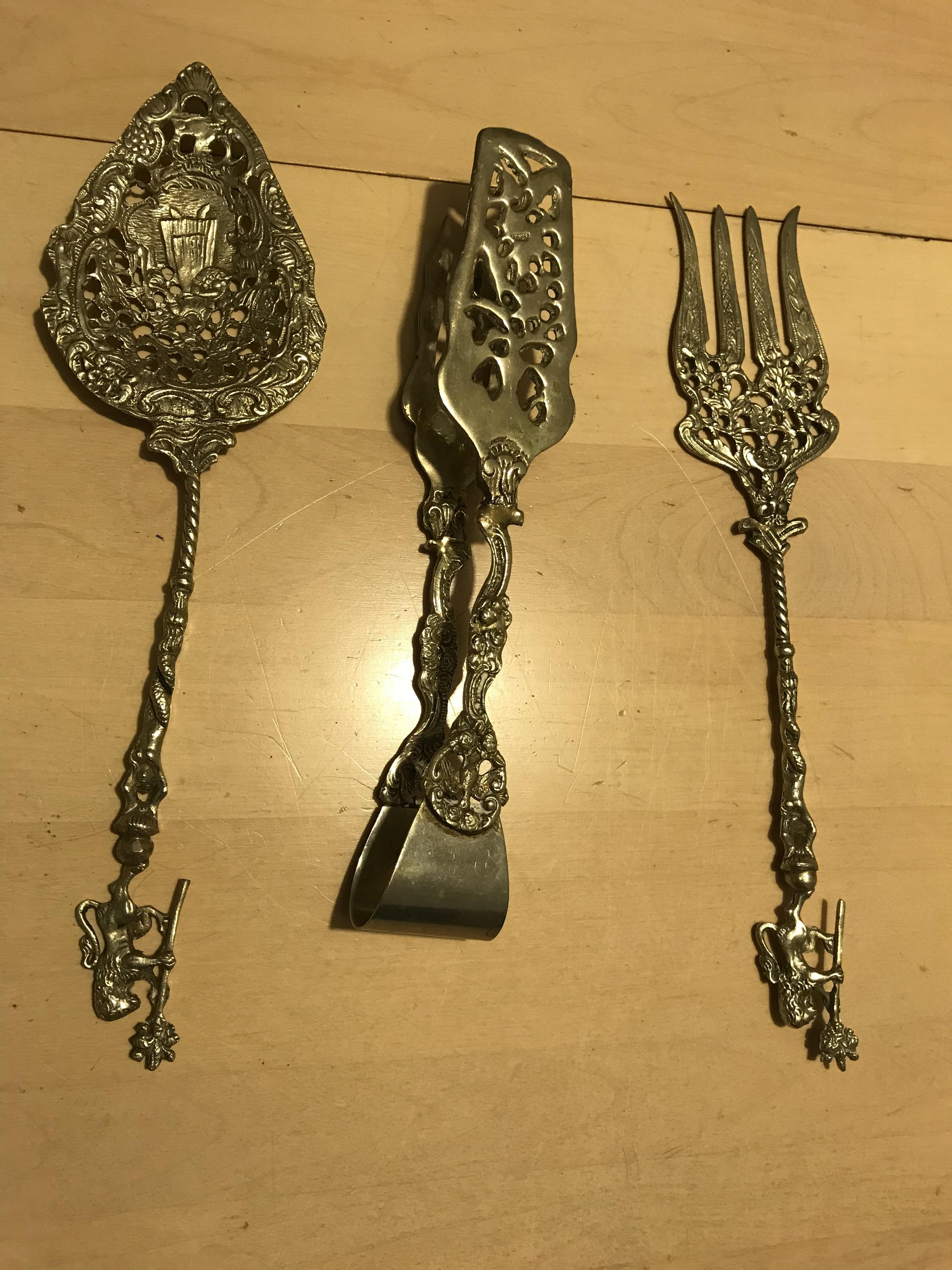 Serving Pieces that is some sort of metal not silver or gold so I’ve been told. As my grandparents came from Italy, these pieces are from their Village in Sicily. Anything anyone can tell me about these pieces would be great.