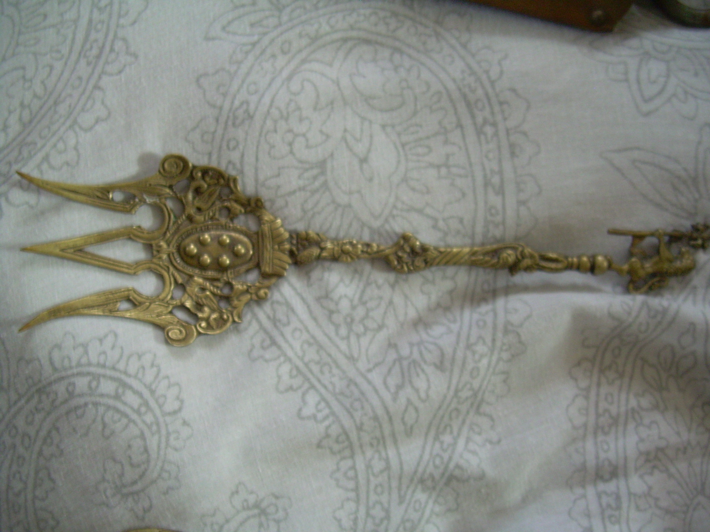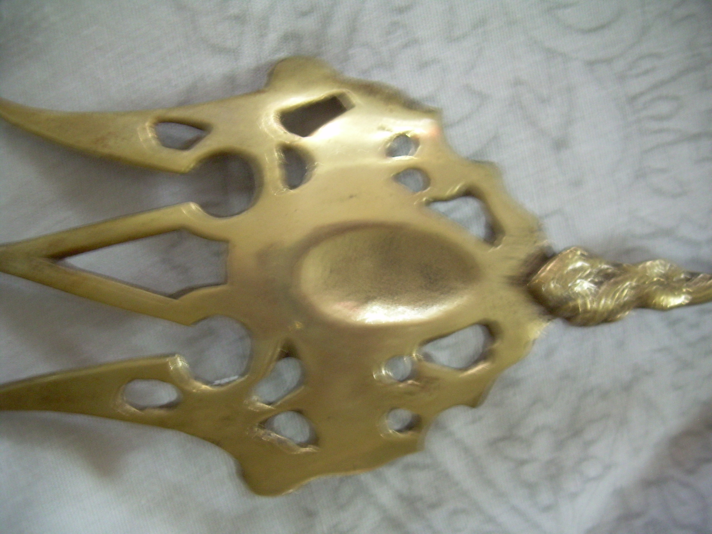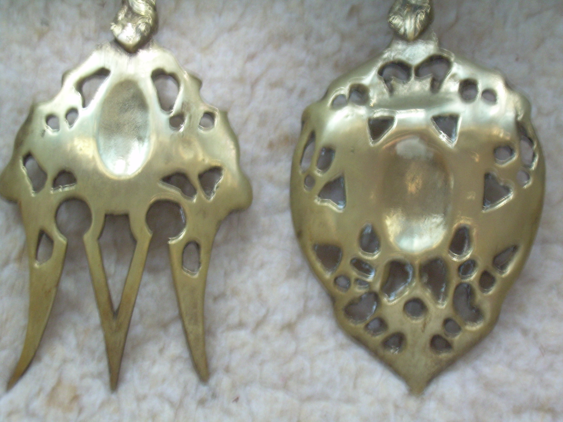 Undated Italian Silver Plated salad serving set, heavily ornamented baroque style with Lion Rampant Finials, and Coronets on the face. Both pieces have an heraldic theme with shield in the center of the face with six raised dots inside the shield. The spoon face is surrounded by vines and flowers, and the fork by dragons. A floral repousse motif runs up the handles to the Lion Finials.