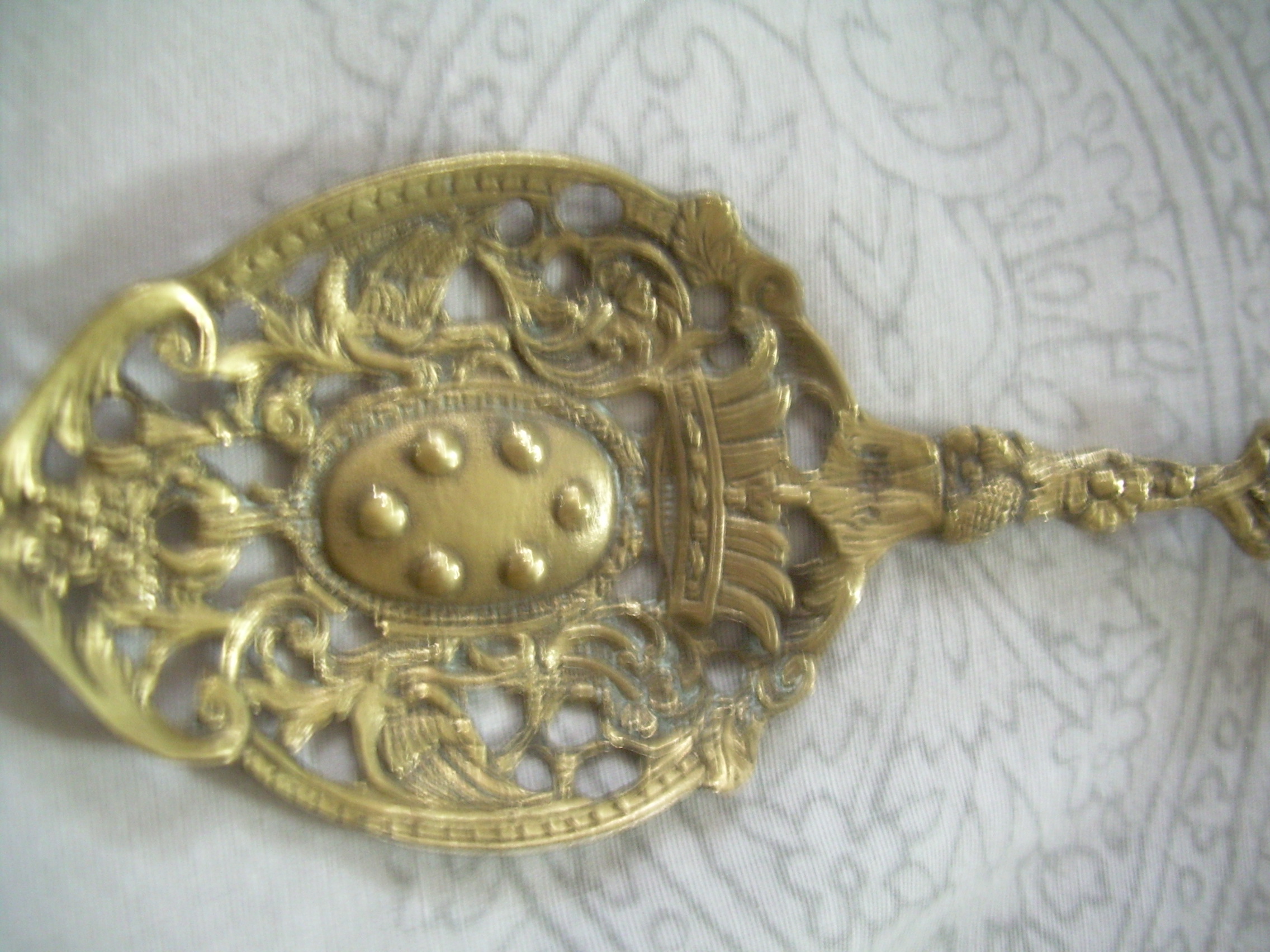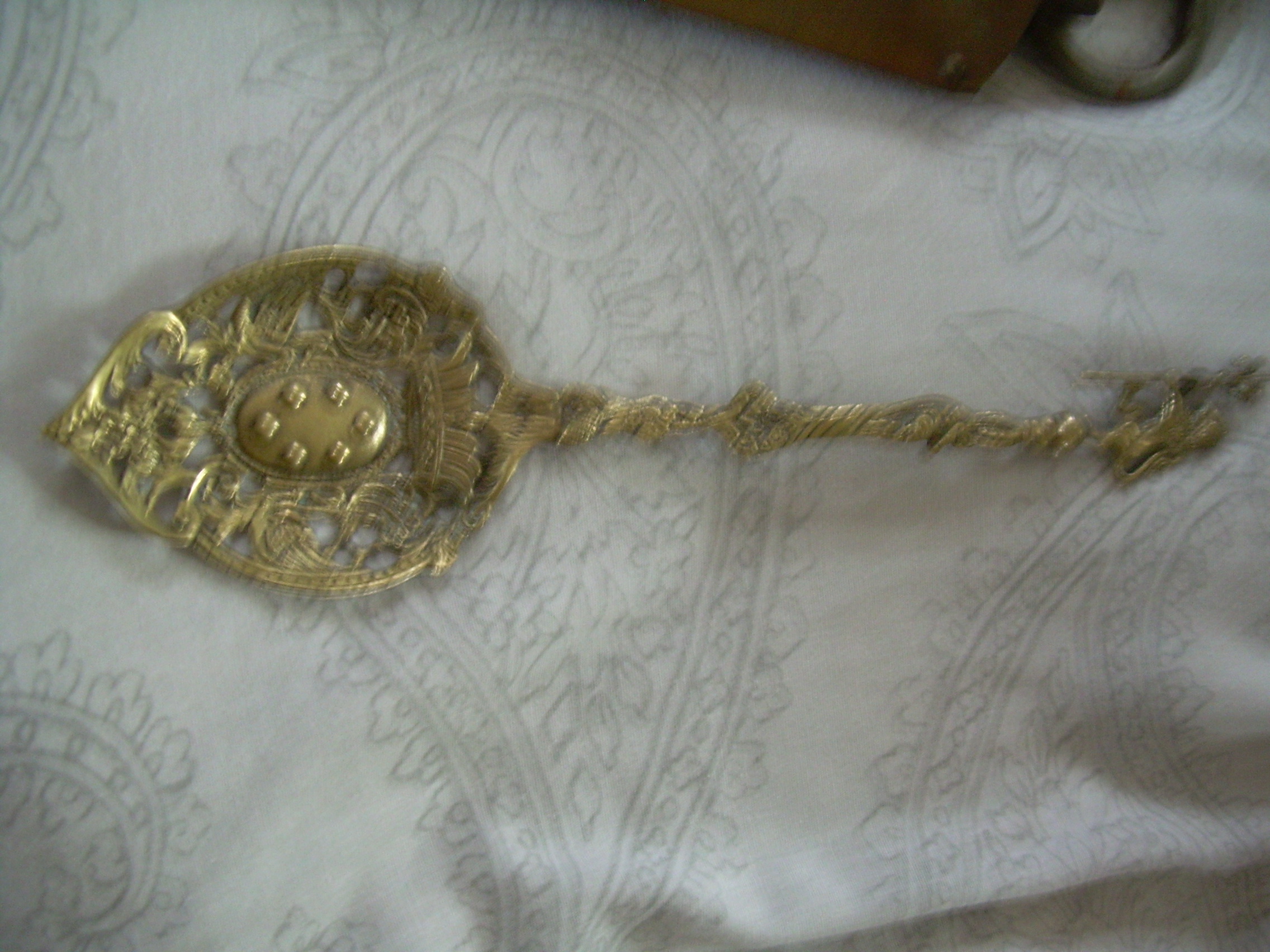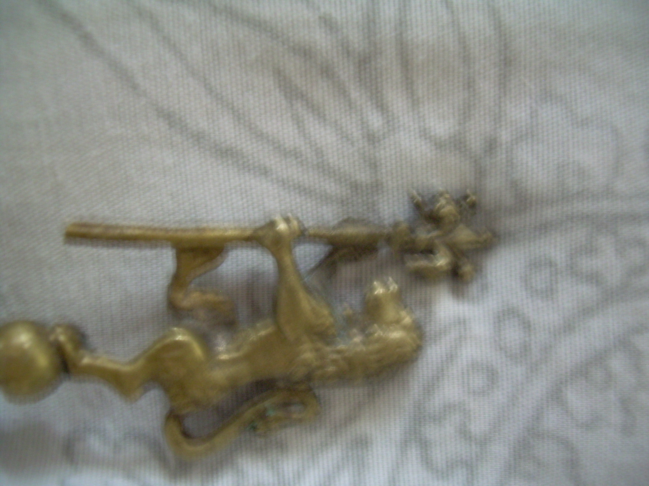Undated Italian Silver Plated salad serving set, heavily ornamented baroque style with Lion Rampant Finials, and Coronets on the face. Both pieces have an heraldic theme with shield in the center of the face with six raised dots inside the shield. The spoon face is surrounded by vines and flowers, and the fork by dragons. A floral repousse motif runs up the handles to the Lion Finials.