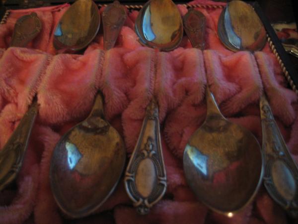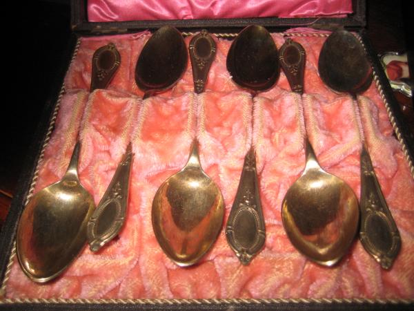 6pcs Silver spoon set in orginal case, brown case with pink pillow on inside cover that states G. La Villa Giojelliere Palermo. inside bottom of case is pink velvet with slots for all 6 spoons. Spoons have markings 800 G. Di Marzo. Also have a design on handle of spoon. Spoons are tarnished but in excellent condition. Box is very old and in poor condition.