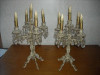 the base seems to be some sort of plaster sitting on a 2 tier metal base.the iron and wood are up to the wooden candles. The patina is really beautiful both gold and silver. Silver especially on the wood dowels that hold the candlesticks. I have owned this for a very long time and do believe that the woman had brought it home from Europe. It is quite large and commands a big area. I saw something similar in a magazine called pricket torcheres. I have looked over the internet and can find nothing that come is similiar. This was electrified at some point, I don't know what it lit, I cannot figure it out.