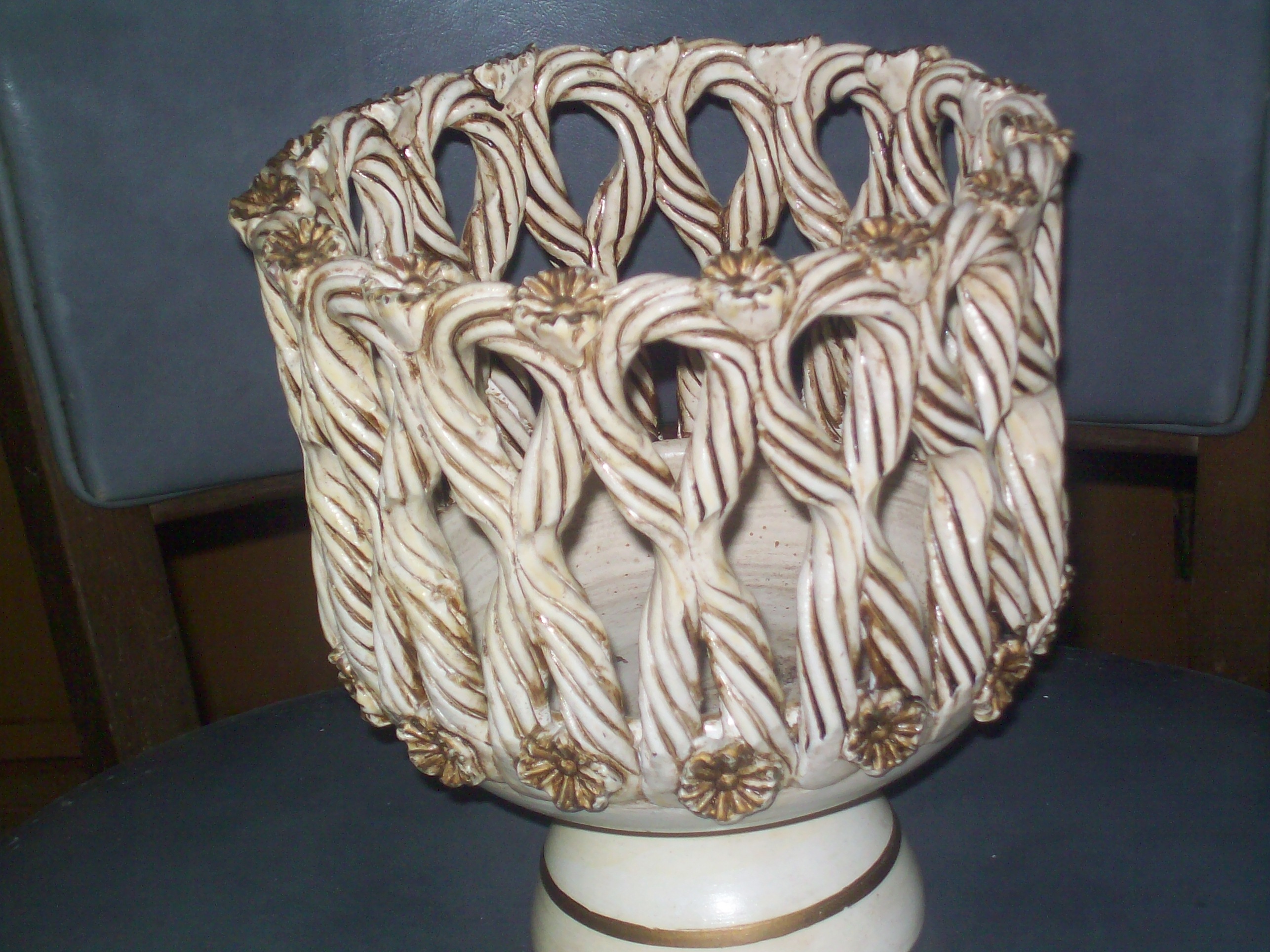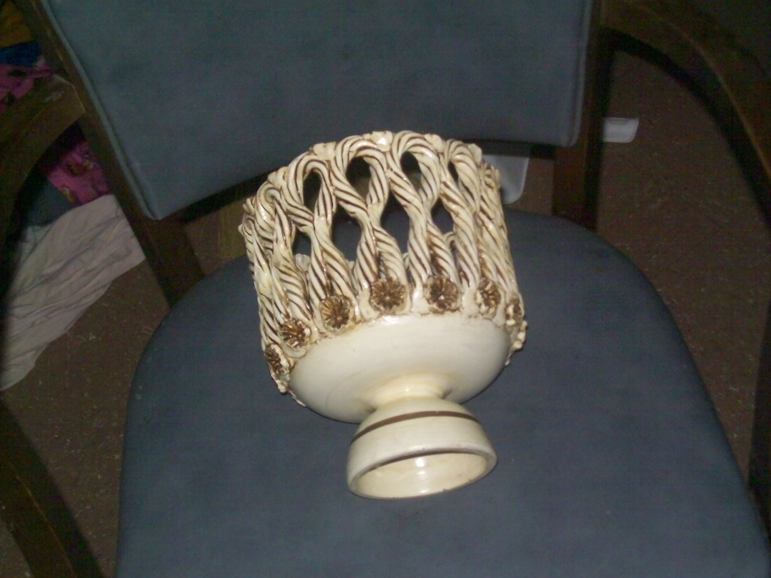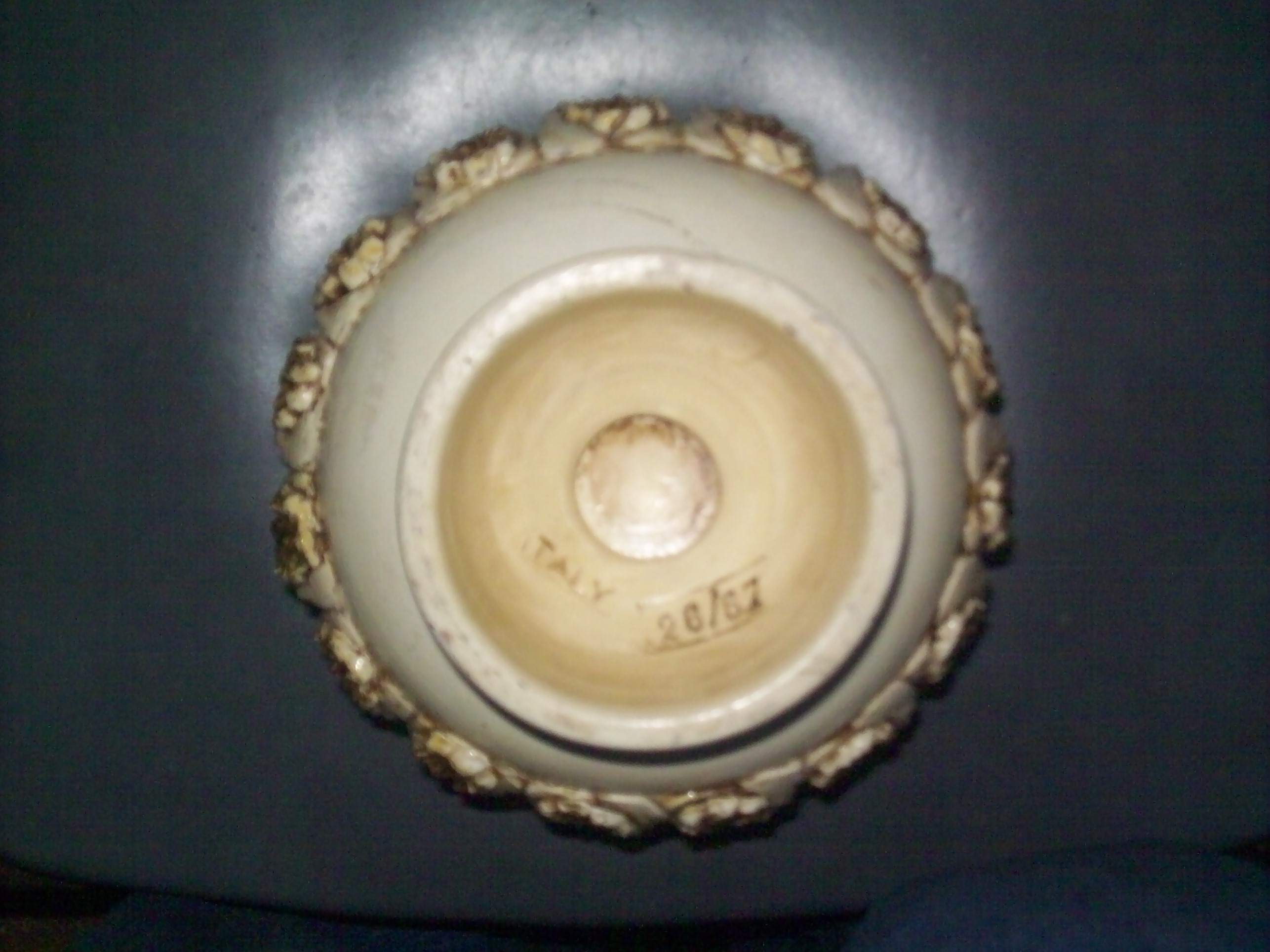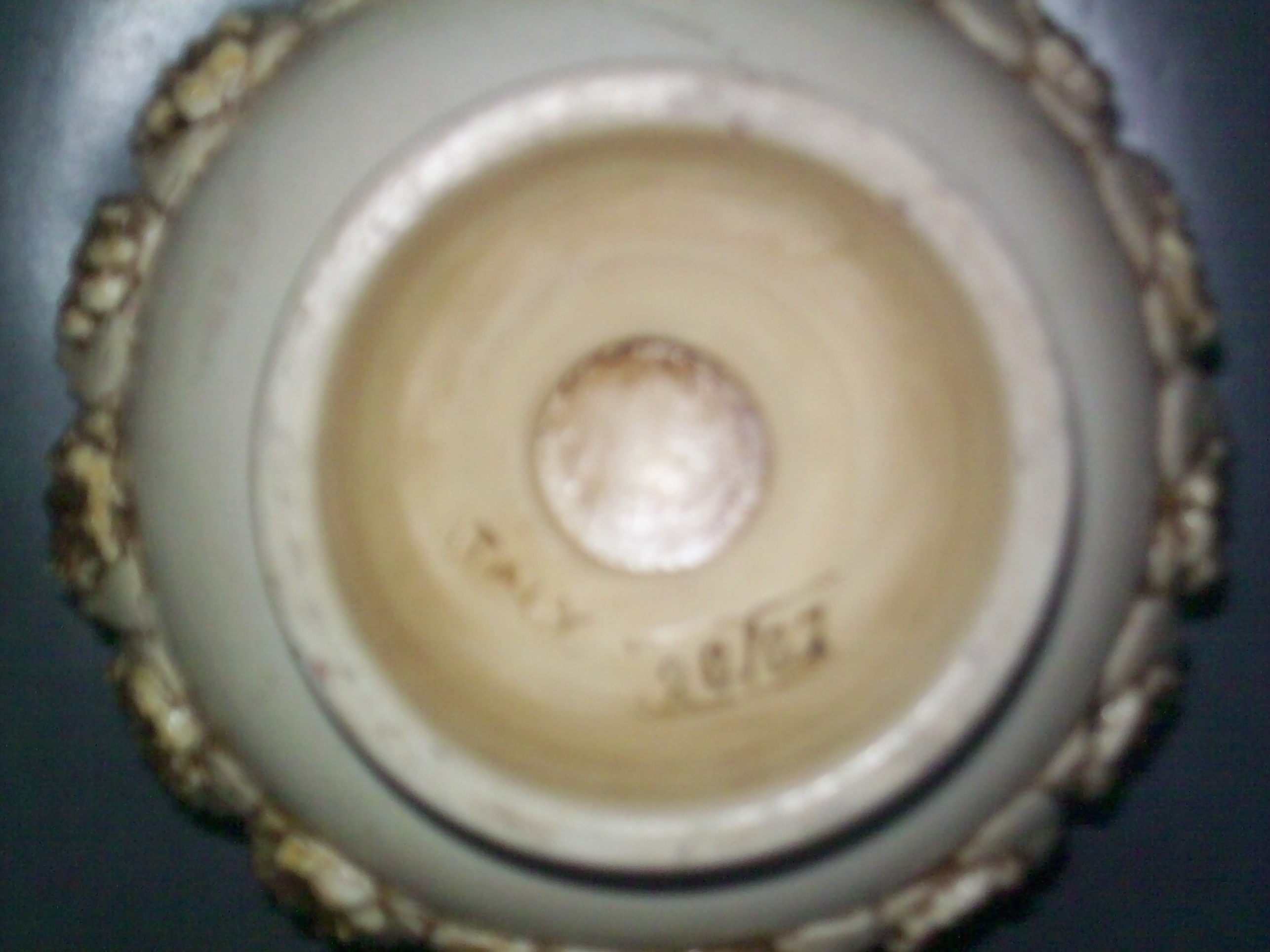 This is a cream to antique white in color....The top of it has like a rope design with flowers on top and bottom of the rope like design....It's stamped Italy along with the numbers 26/67 in a retangle box with one end open