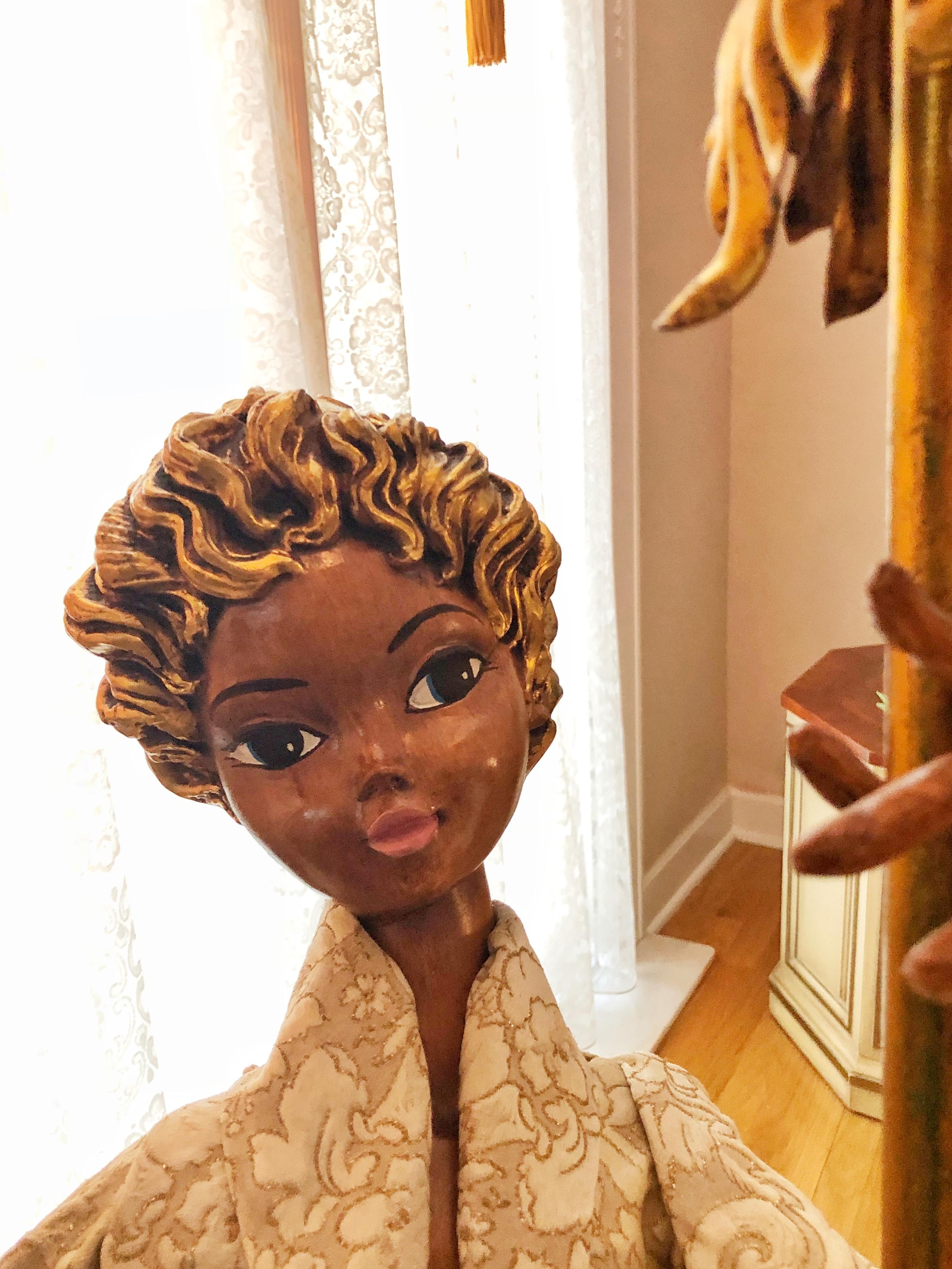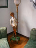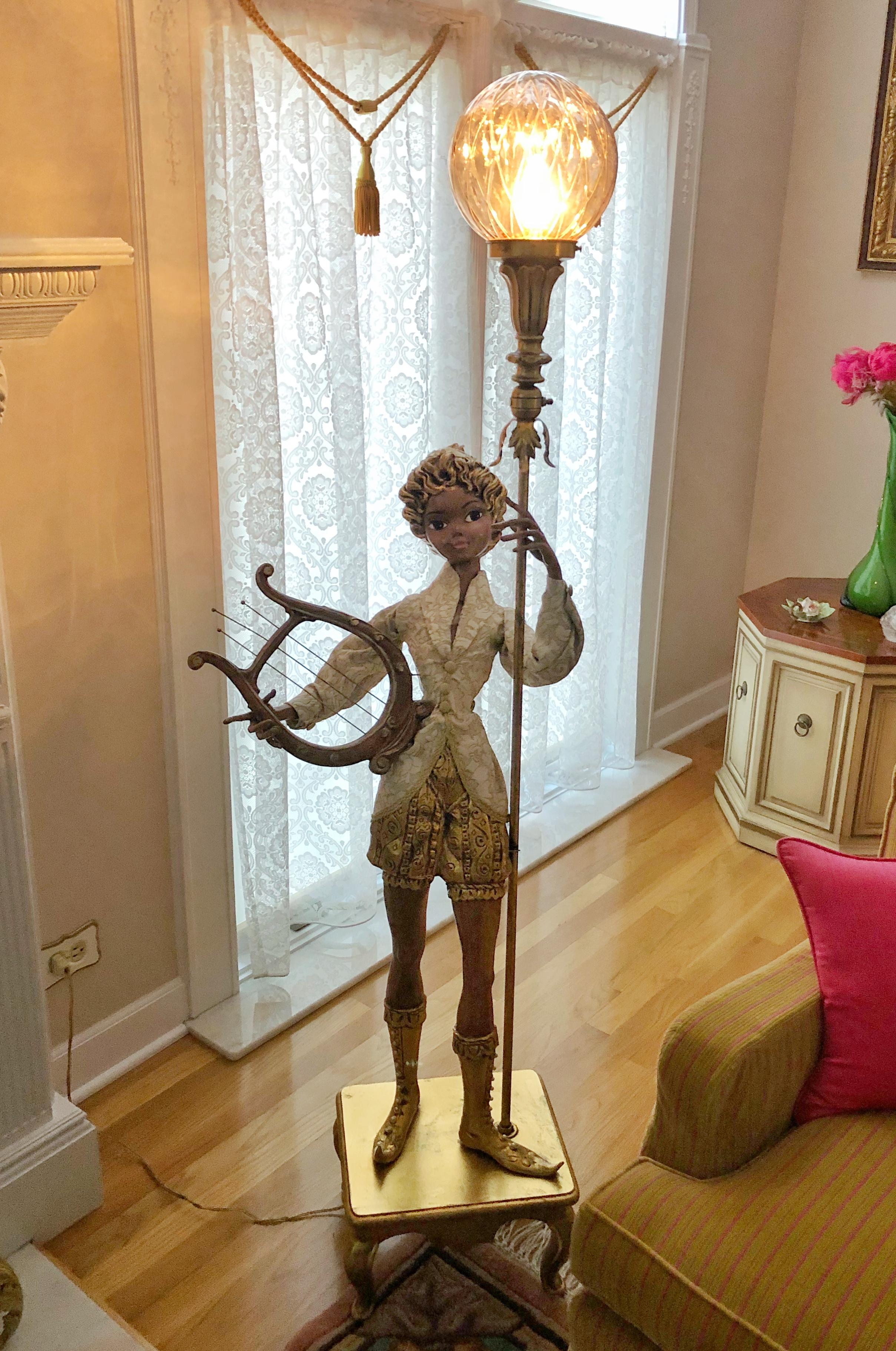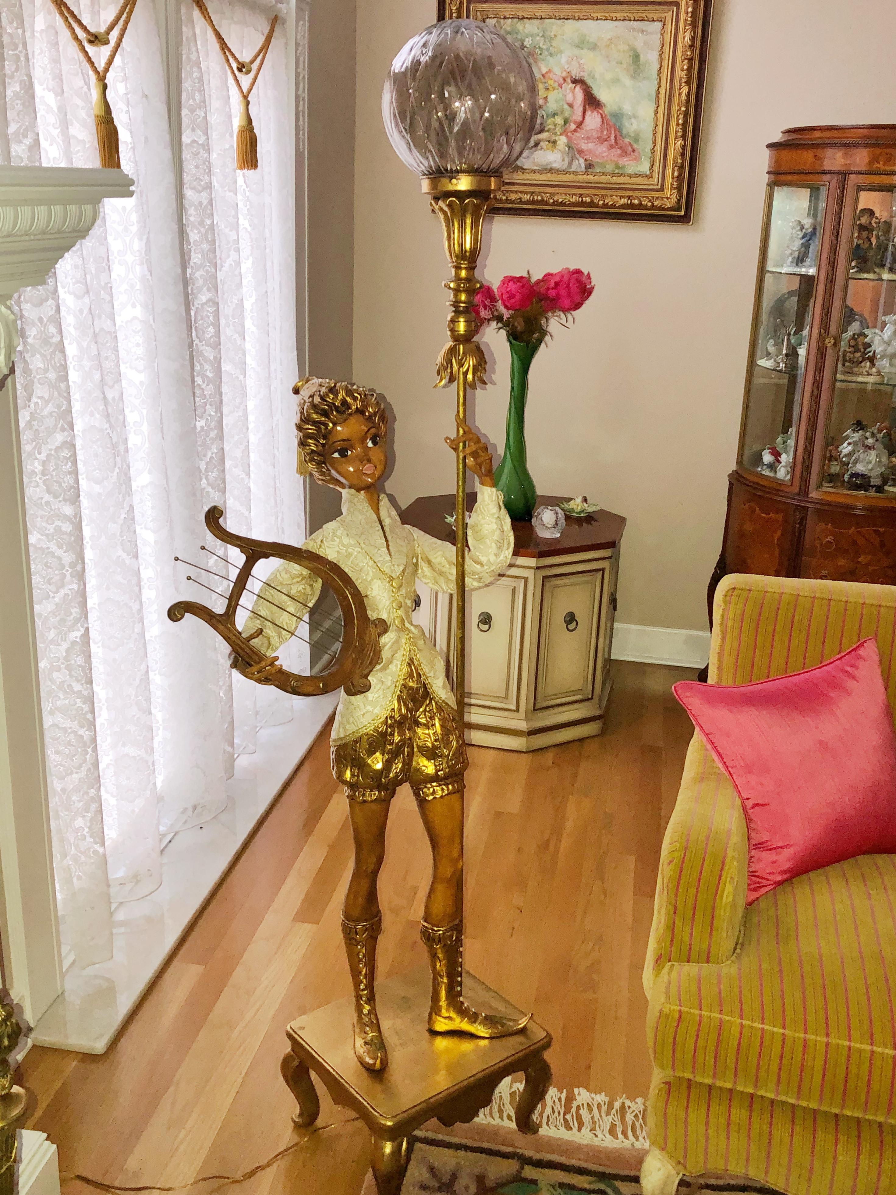 This lamp is almost lifesize. Including the actual light, it’s as tall as it taller than me. It appears to be entirely carved from wood. Painted face. Either gold leaf or gold paint. The clothes are fabric, a thicker, quilty, satin-ish type material.