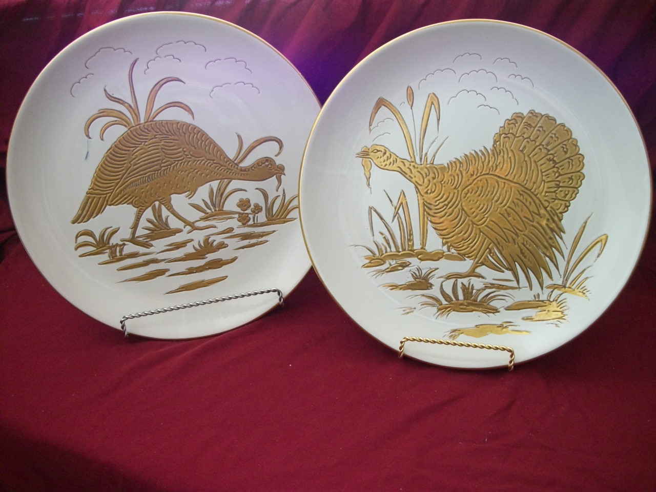Italian Majolica White & Gold Turkey Platter, Dinner Plates, Cups & Saucers