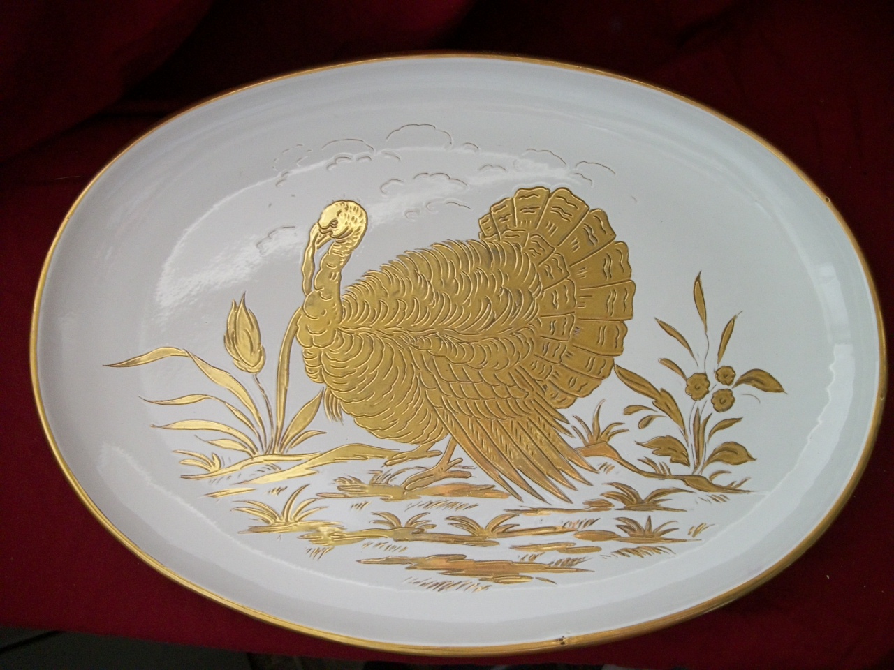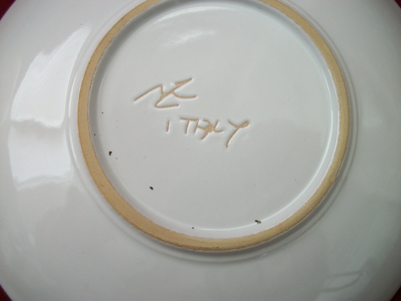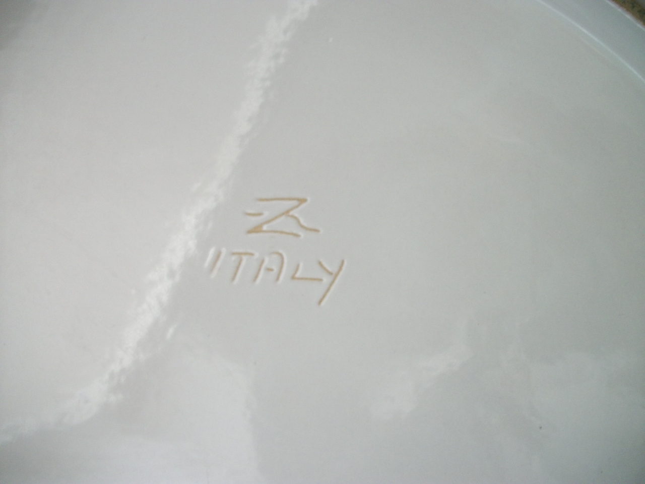 Yet another Mystery we would love to solve...We acquired this set of unique dinnerware from a woman whose mother had recently passed away. She had no idea where or when her mother bought these, nor anything else about them. The Huge Platter depicts a Gold Turkey and Harvest type scenery. There are four different gold turkey designs on the dinner plates (1 Turkey per Plate), the cups have an ear of corn and a flourish of gold along the handle and around it, an ear of corn and 2 gold floral sprays decorate the saucers. We have spent months researching them, and managed to come up with Zaccagnini Pottery, Italy as the maker. We found a vase online which was the same style, and had the same mark (different pattern though). We emailed the seller for information...She had no information other than what we have (Zaccagnini) No date, history...Nothing. HELP! What is a set like this worth? Thanks in advance for any assistance you may be able to provide.