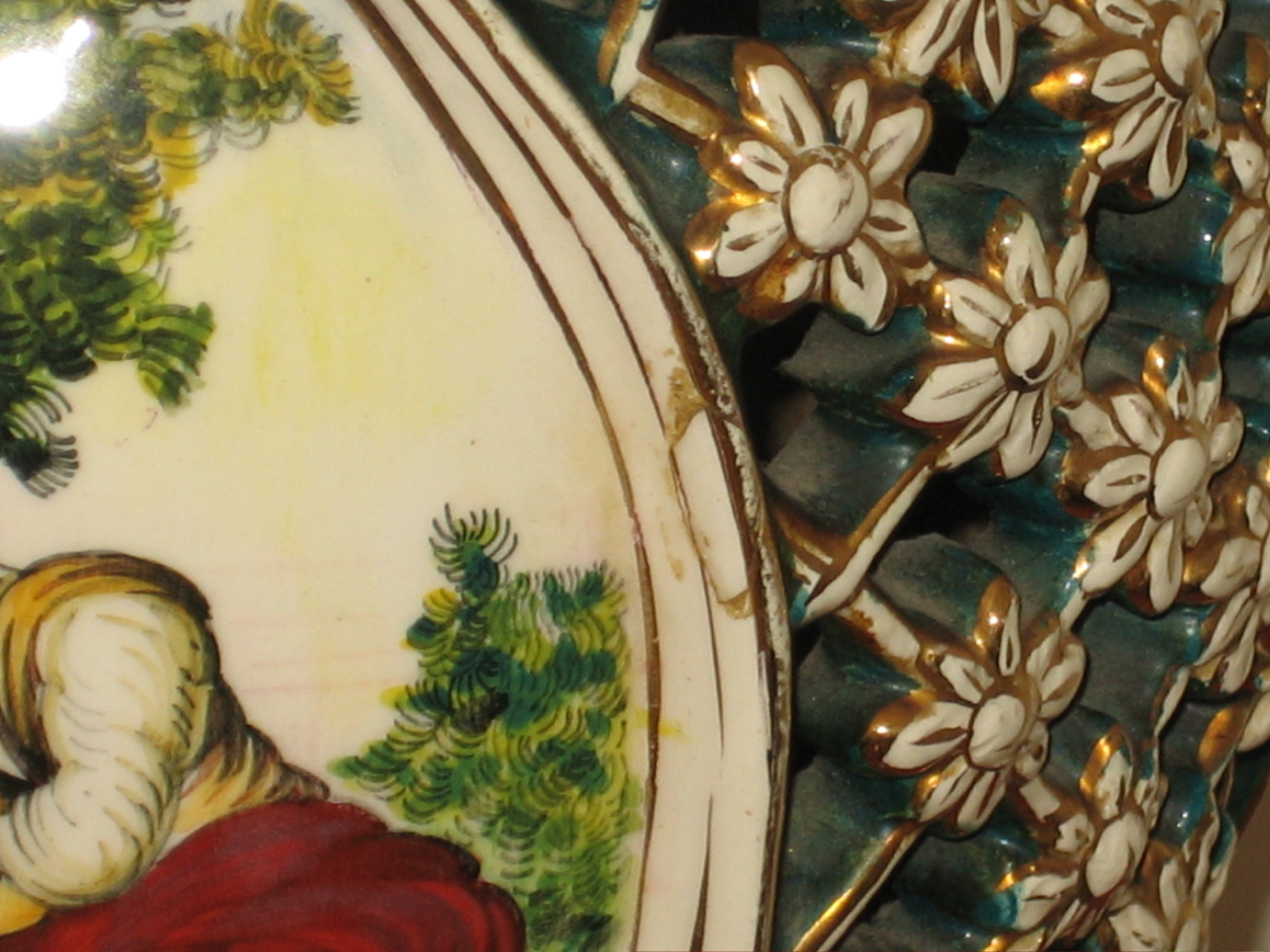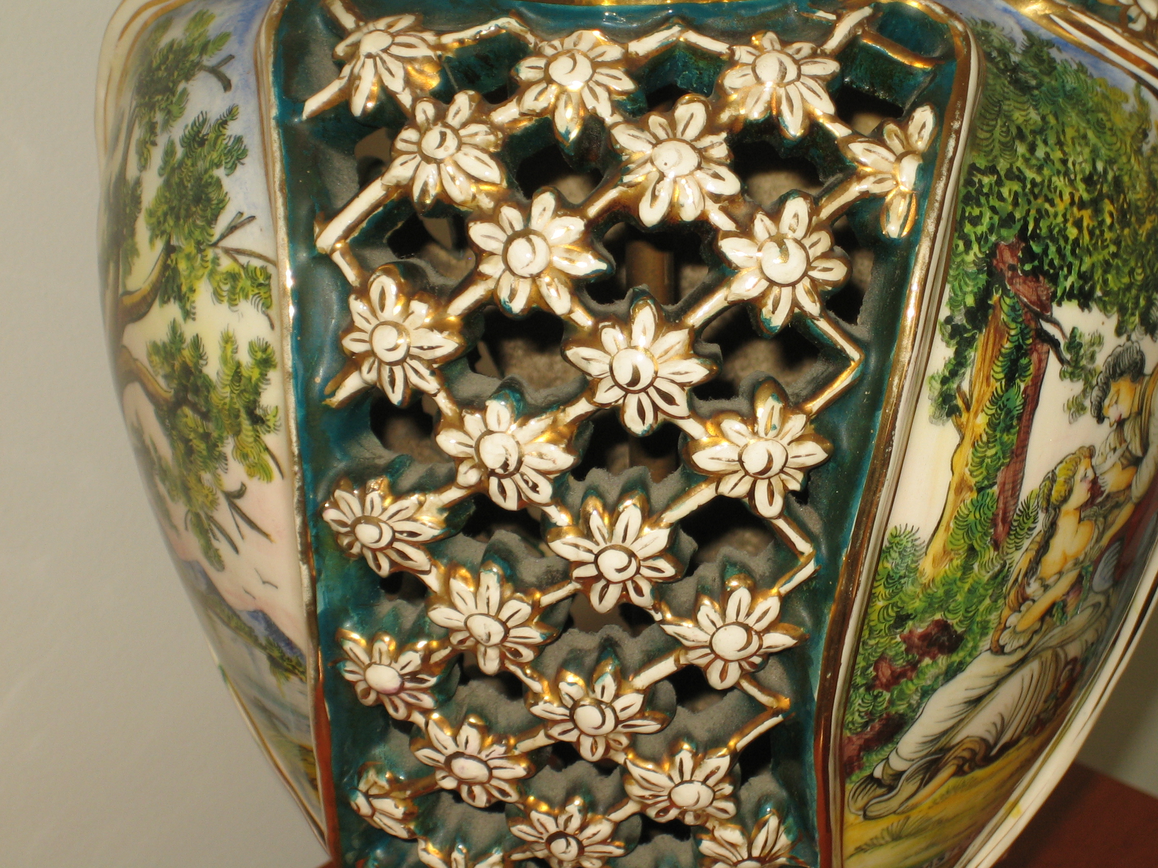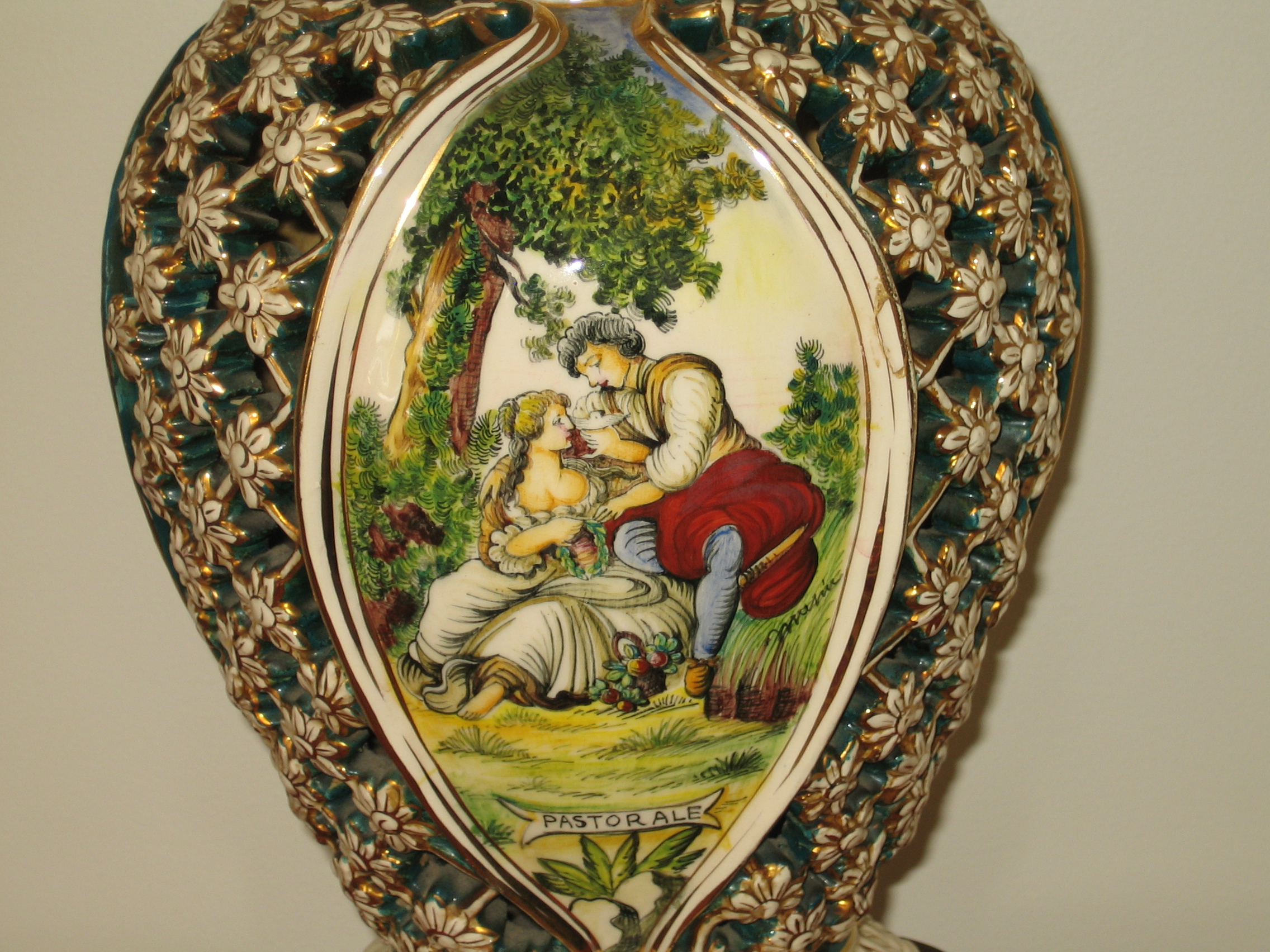 I obtained a pair of these vase from a estate sale. it s in very good condition except a few cracks on the latticed area on one of the vase and a small chip (which was glued back) on the other vase as shown on the last photos. The porcelan vase was mark on the bottom "DIHOLEVI 500 Italy". I think it is also signed by the artist on the body of the vase, but I can recognize the spelling. The overall measurement is 19" tall, the porcelain vase is about 15" tall and 9" wide.