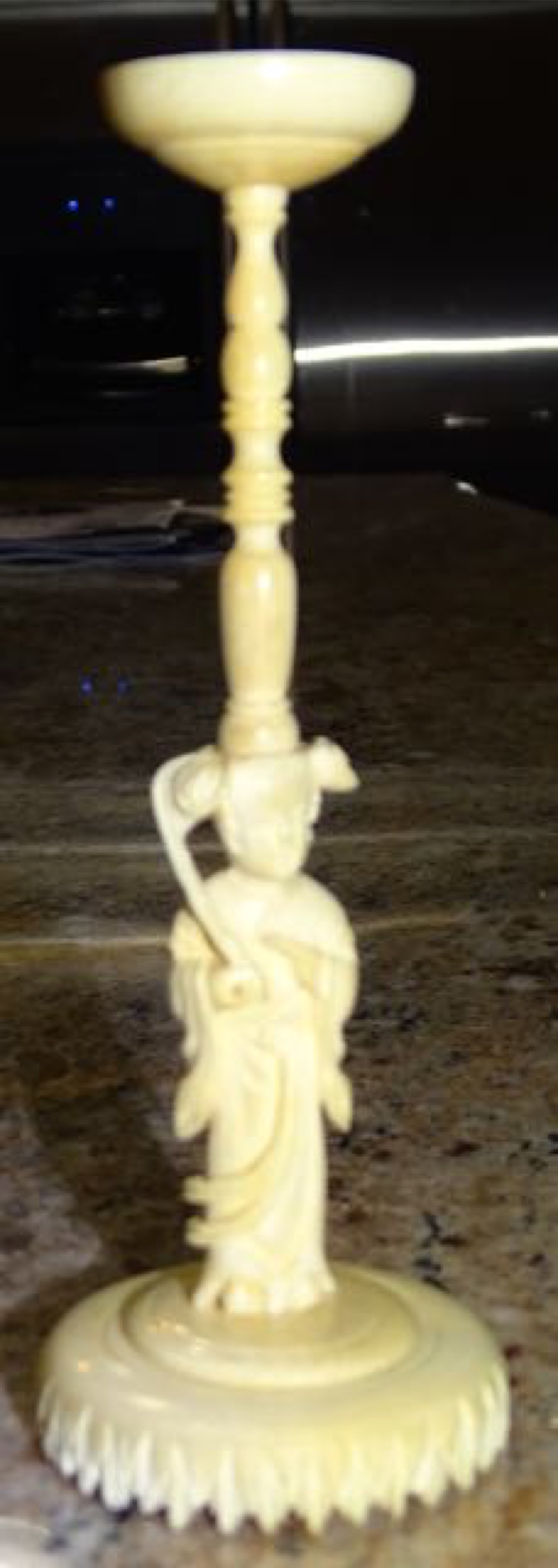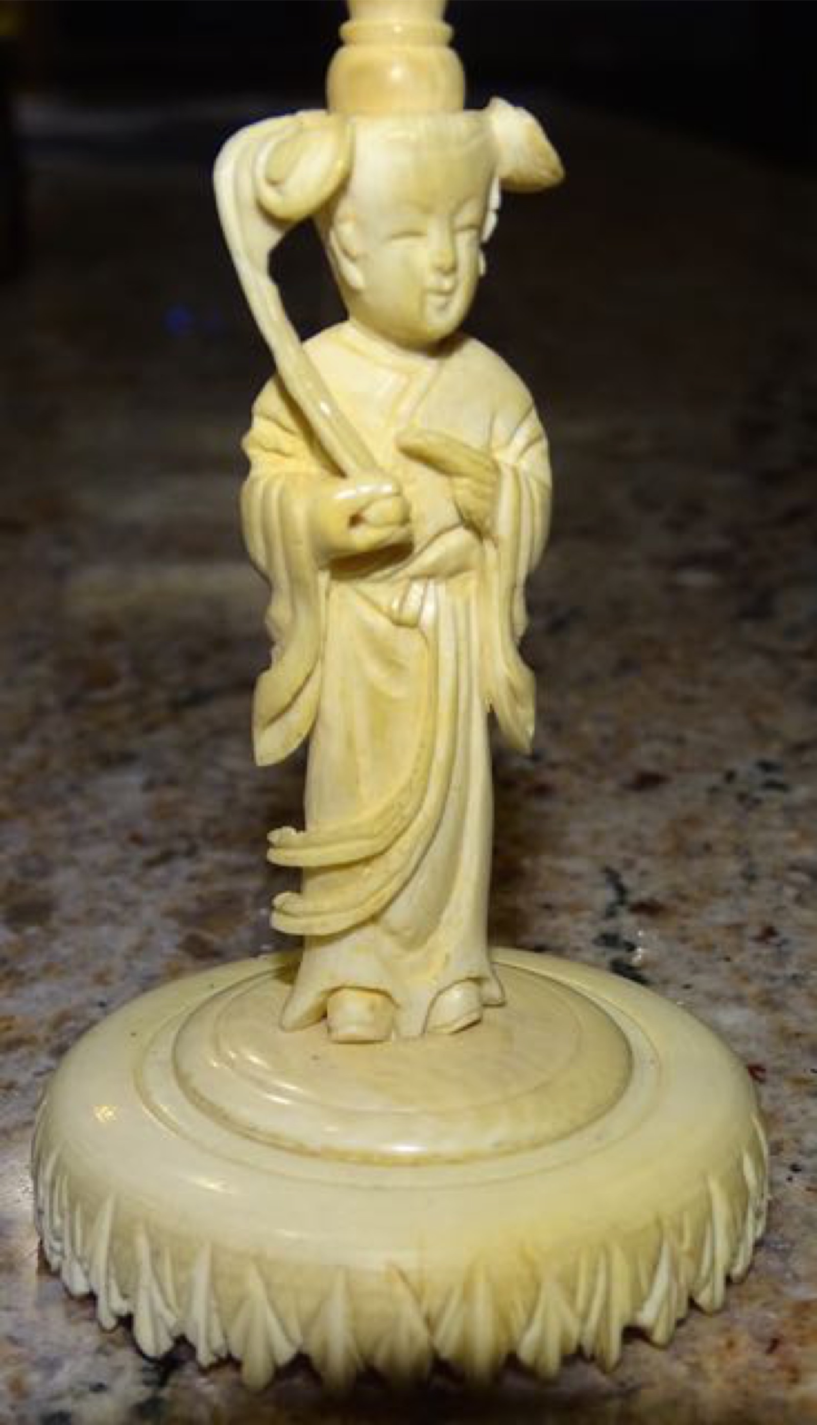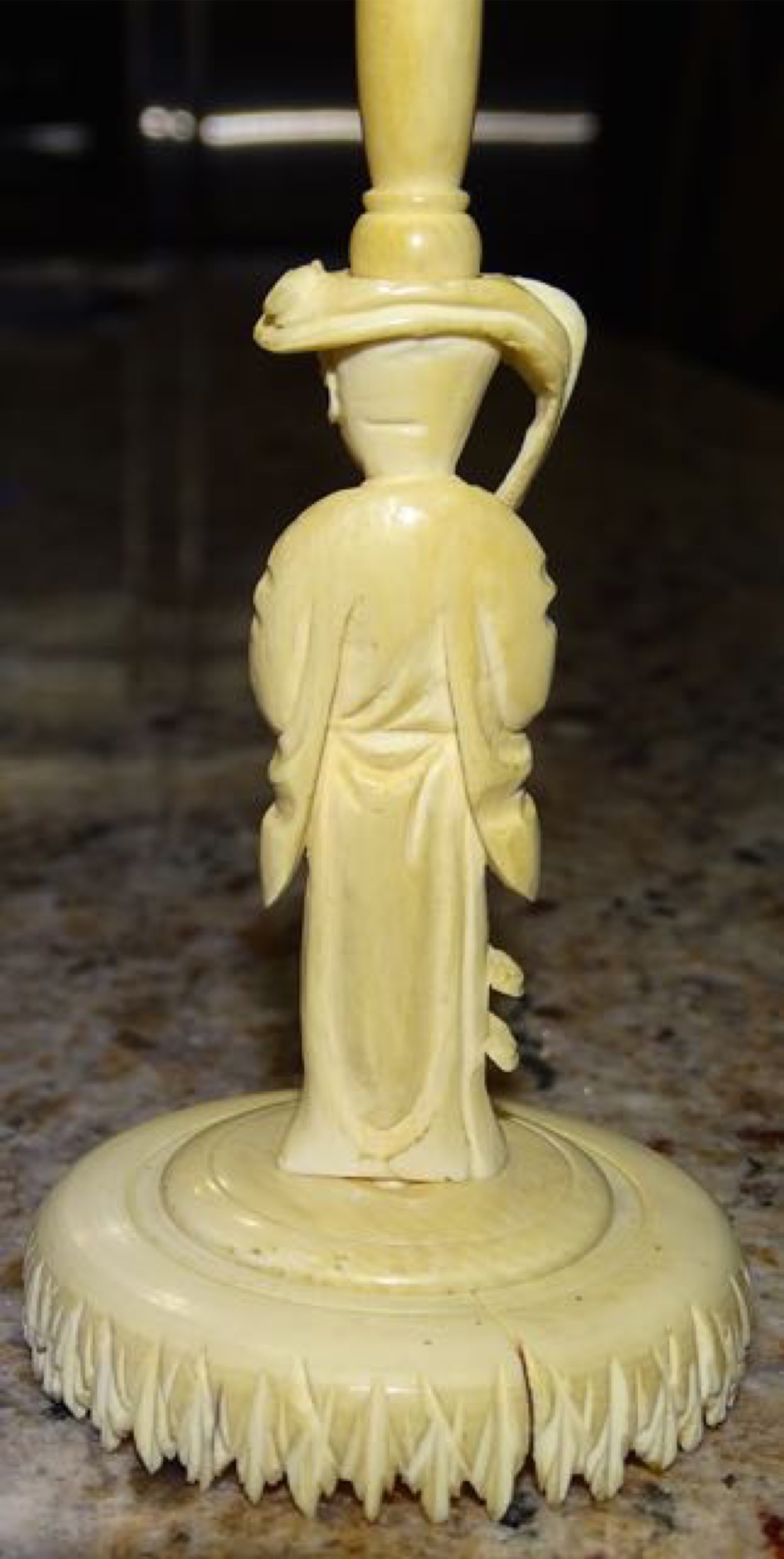 Appears to be asian girl on a stand with a stand attached to the top of her head. The asian girl screws into the bottom stand and the top stand screws into the top of the girls head.