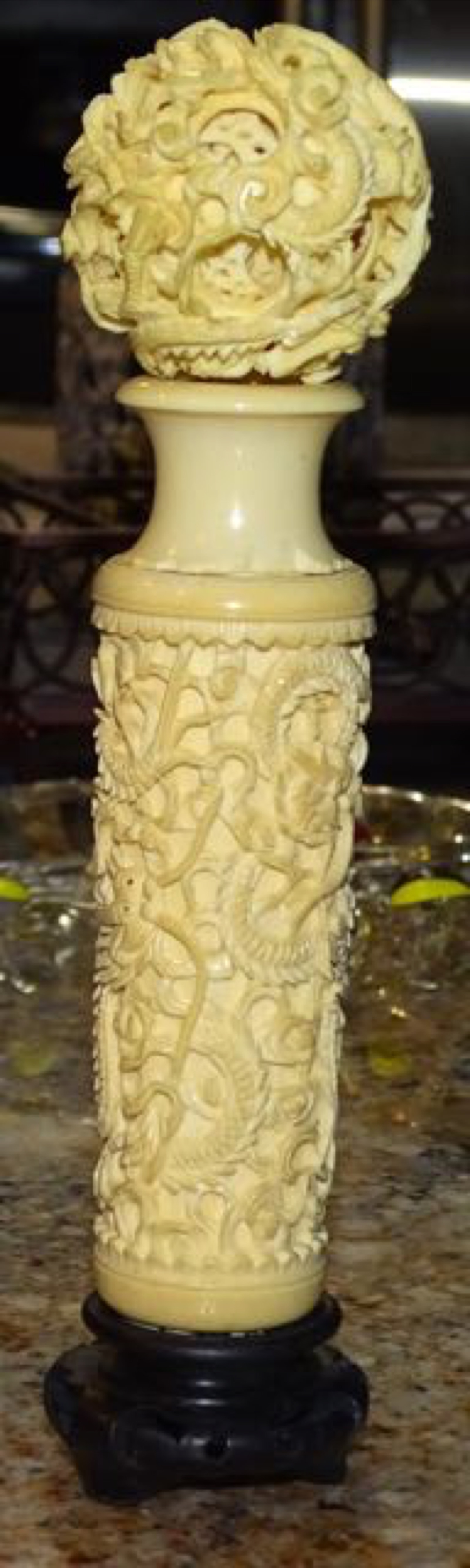 I have what appears to be an ivory carving. There are 4 pieces which build what appears to be a stand that holds a carved ball that contain's several carved balls.