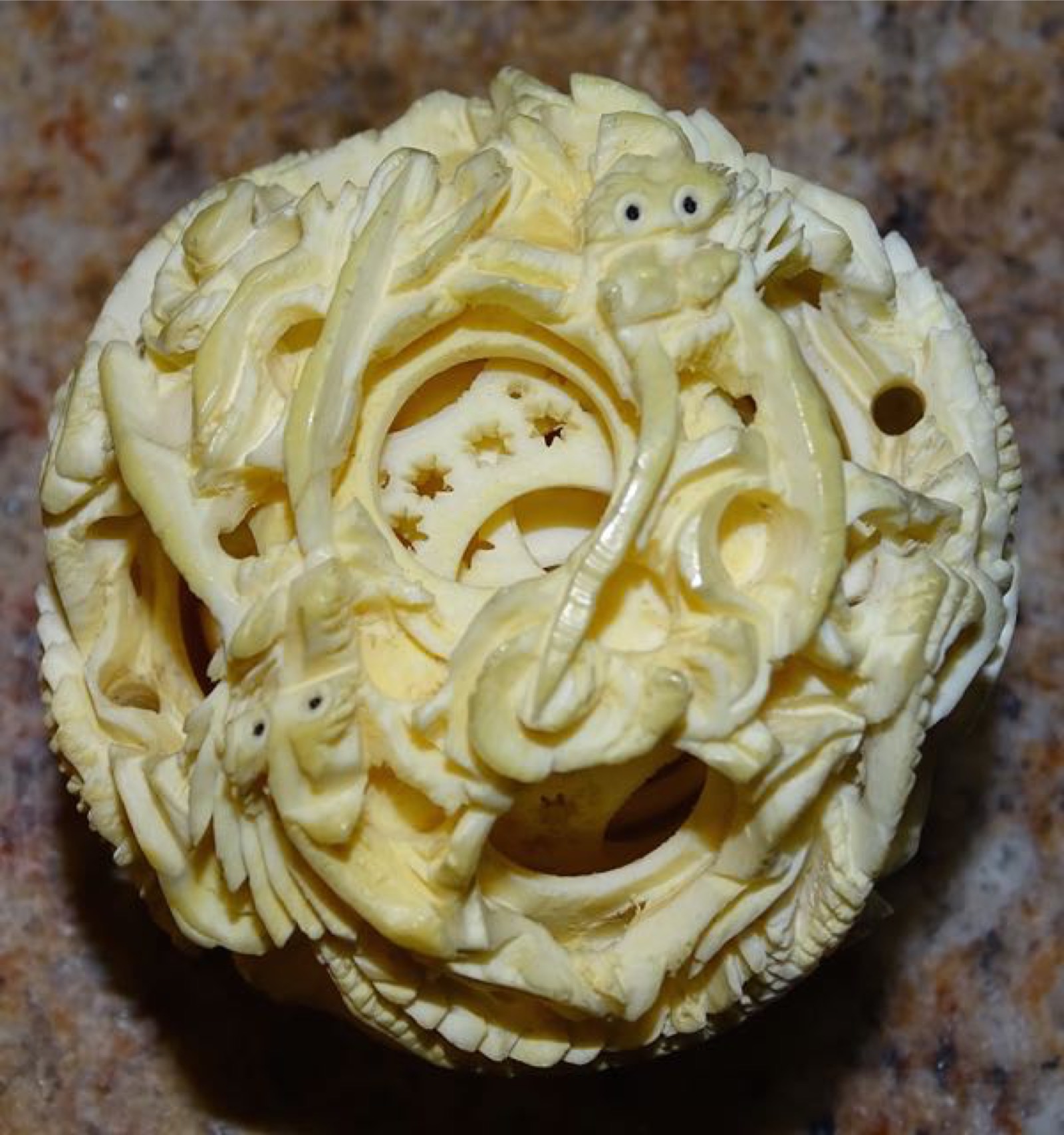 On the top of the second base sits a 2 " ivory ball and inside that ball is several other ivory colored balls each smaller.