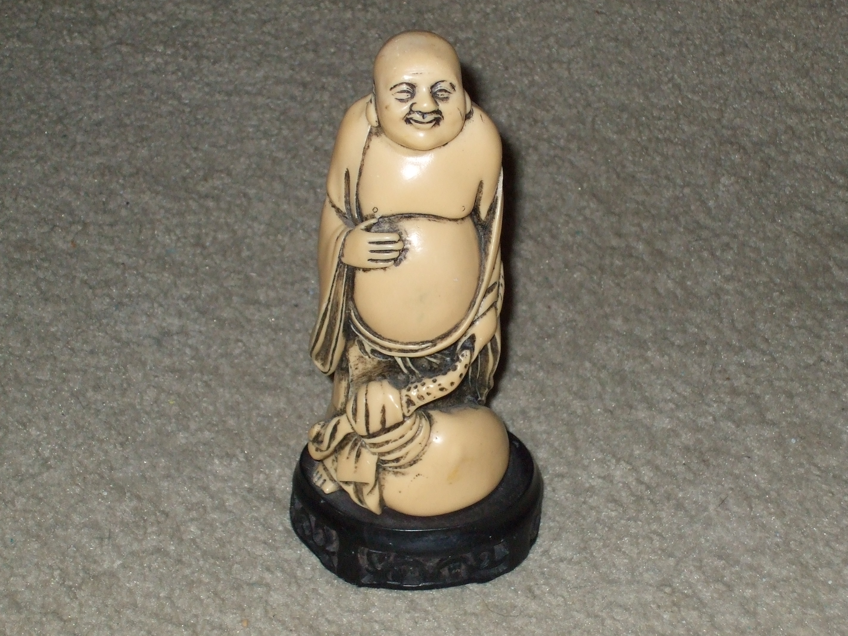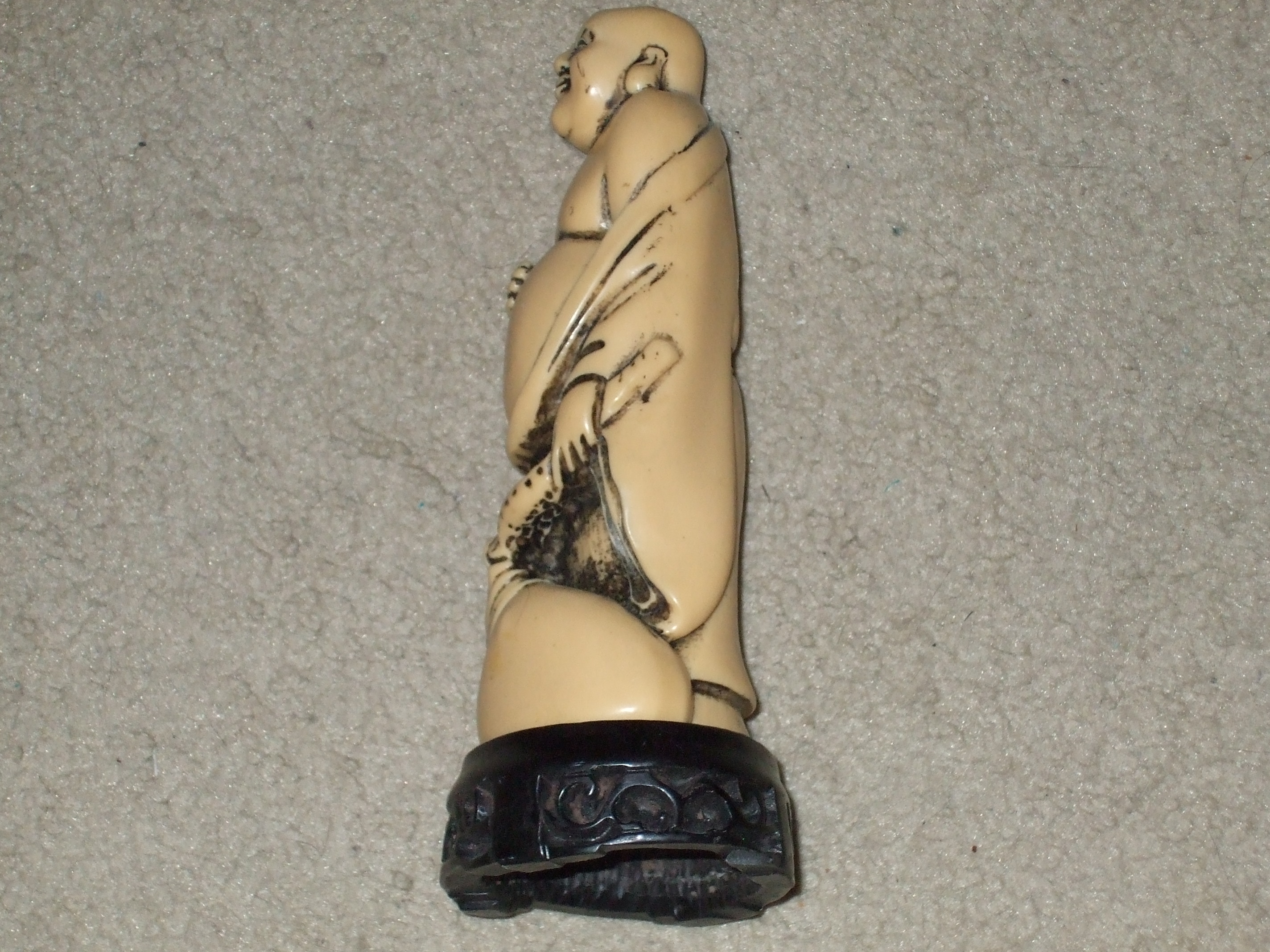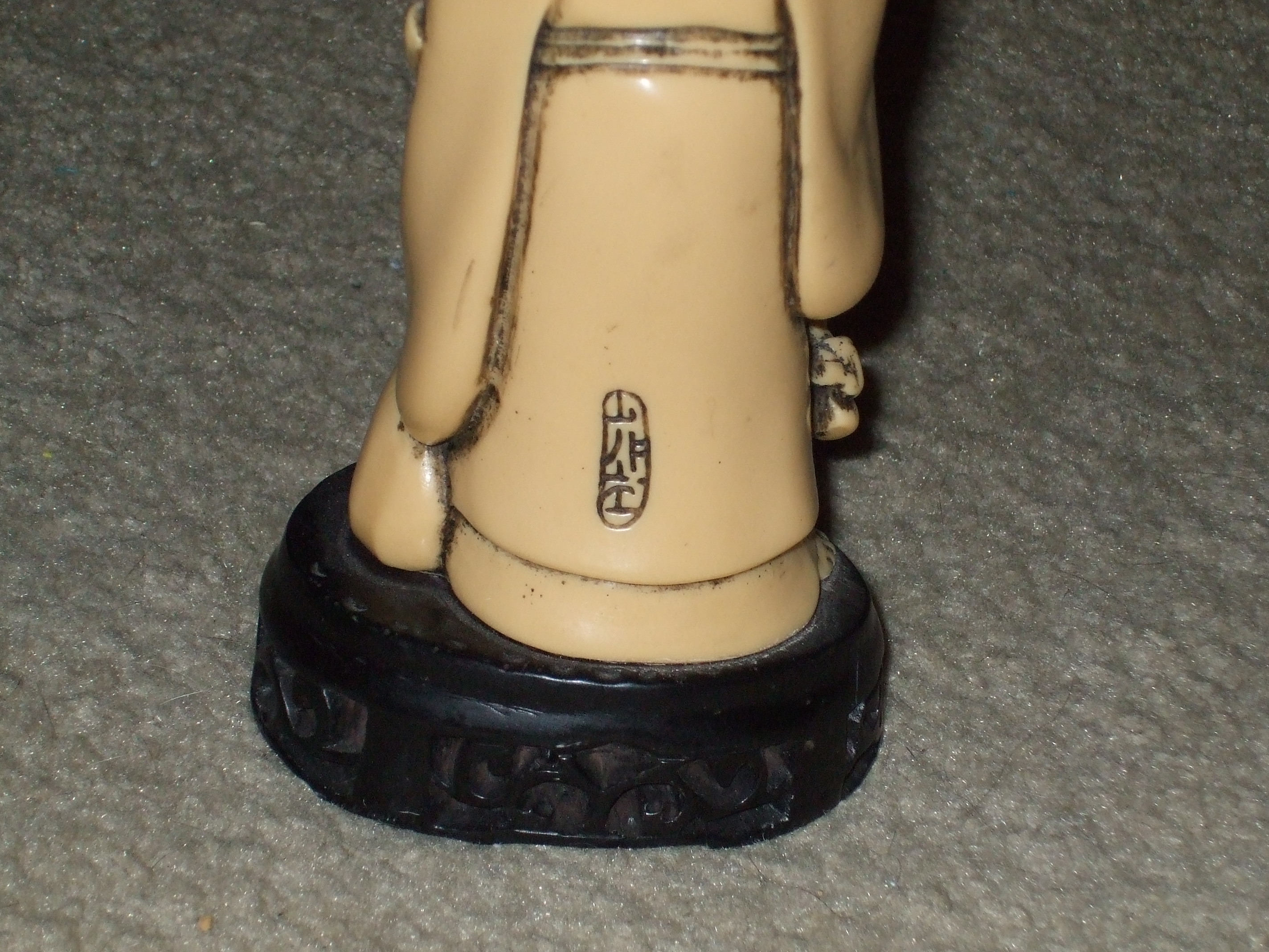 This is what I believe is an Ivory budda statue. He is holding a stick with a bag attatched to it. I have no idea how old it is or what the marking means on the back. It could be a date or a signature. I have 5 pics in this listing to look at. If anyone has info, please let me know. Thank you Dave