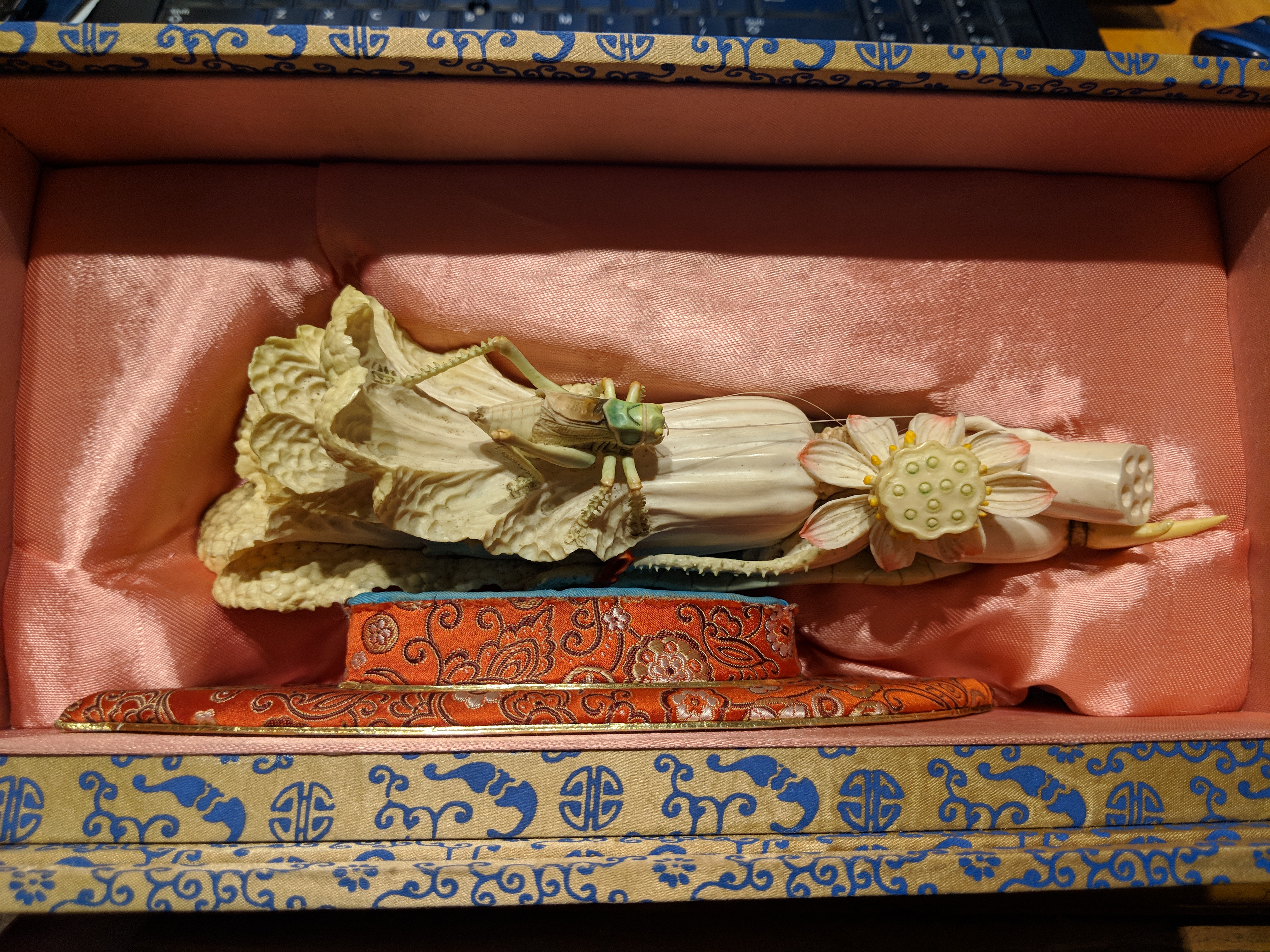 Very ornate Ivory Cabbge leave with Grasshopper and flower. In original satin lined box, with stand.