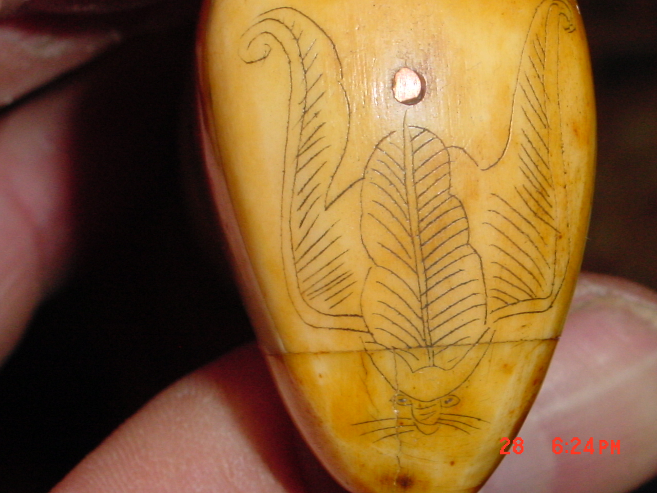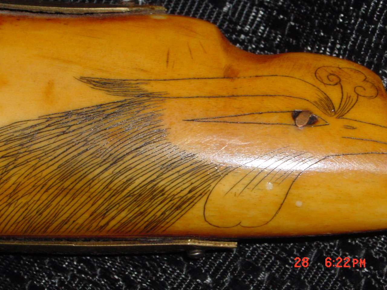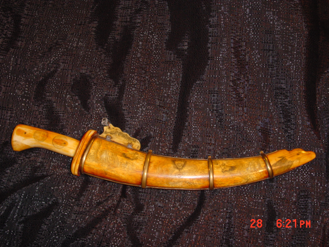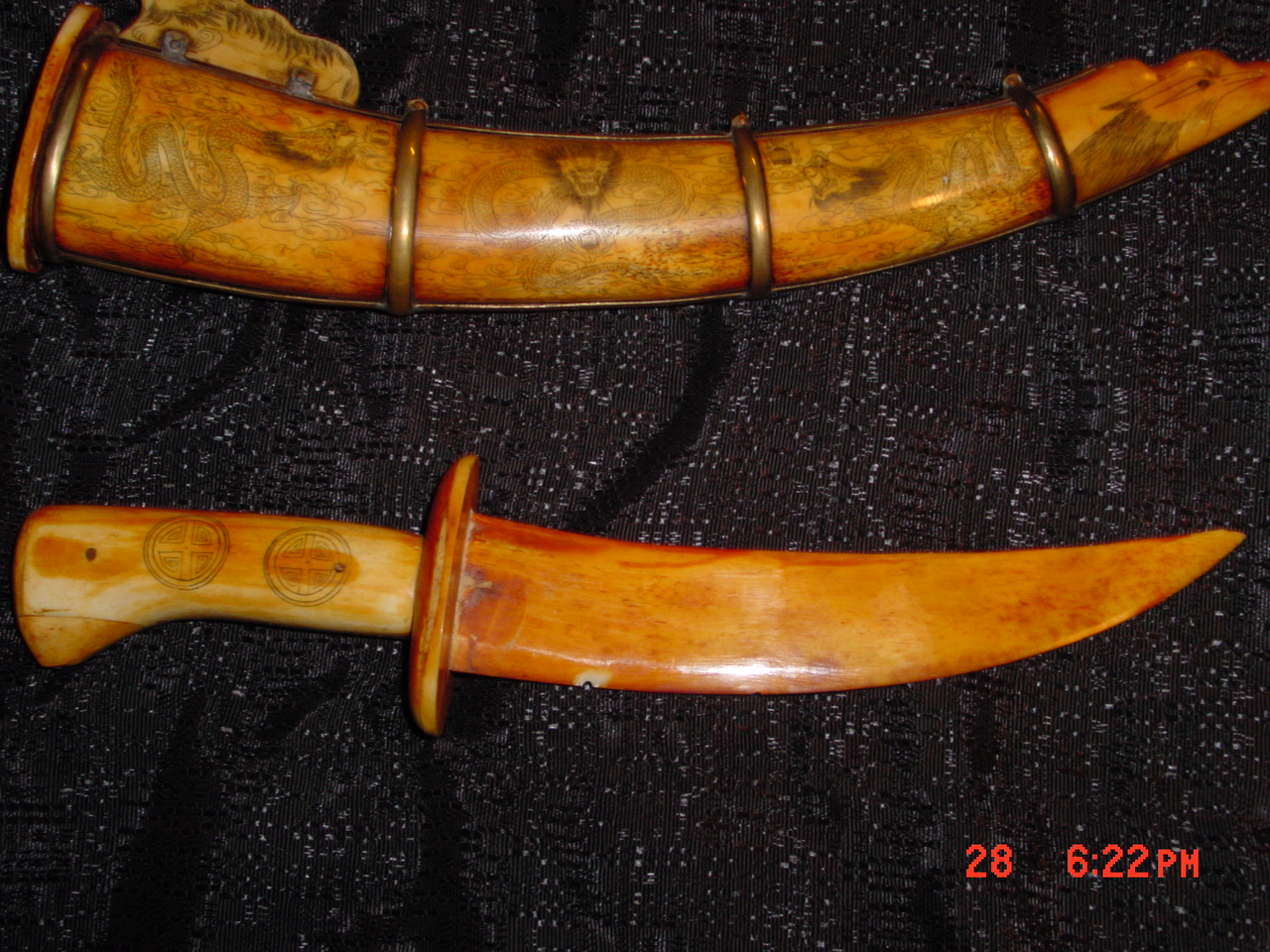it's an ivory knife and sheath both totally made out of ivory with eteched art on them