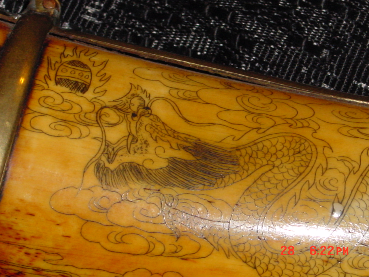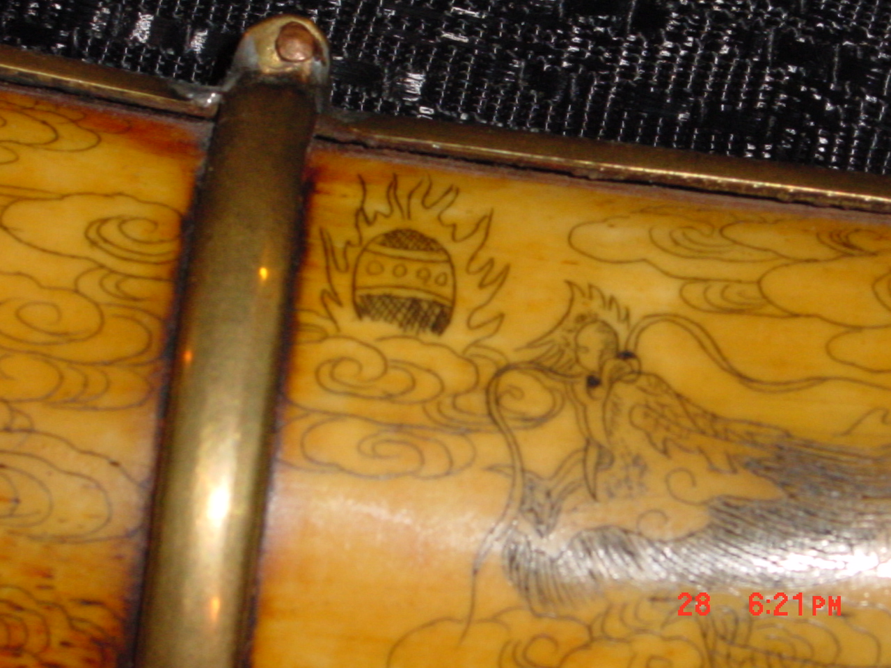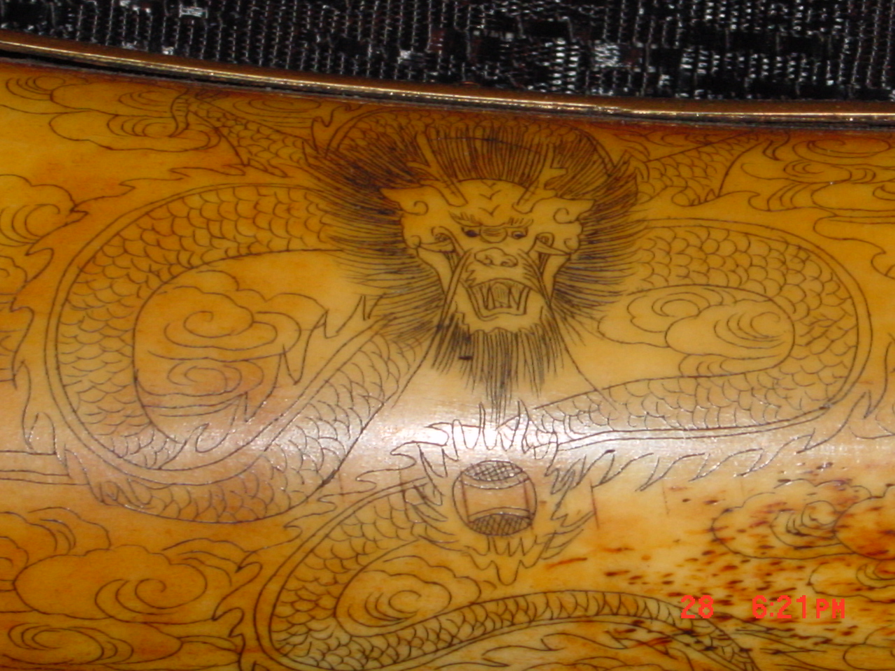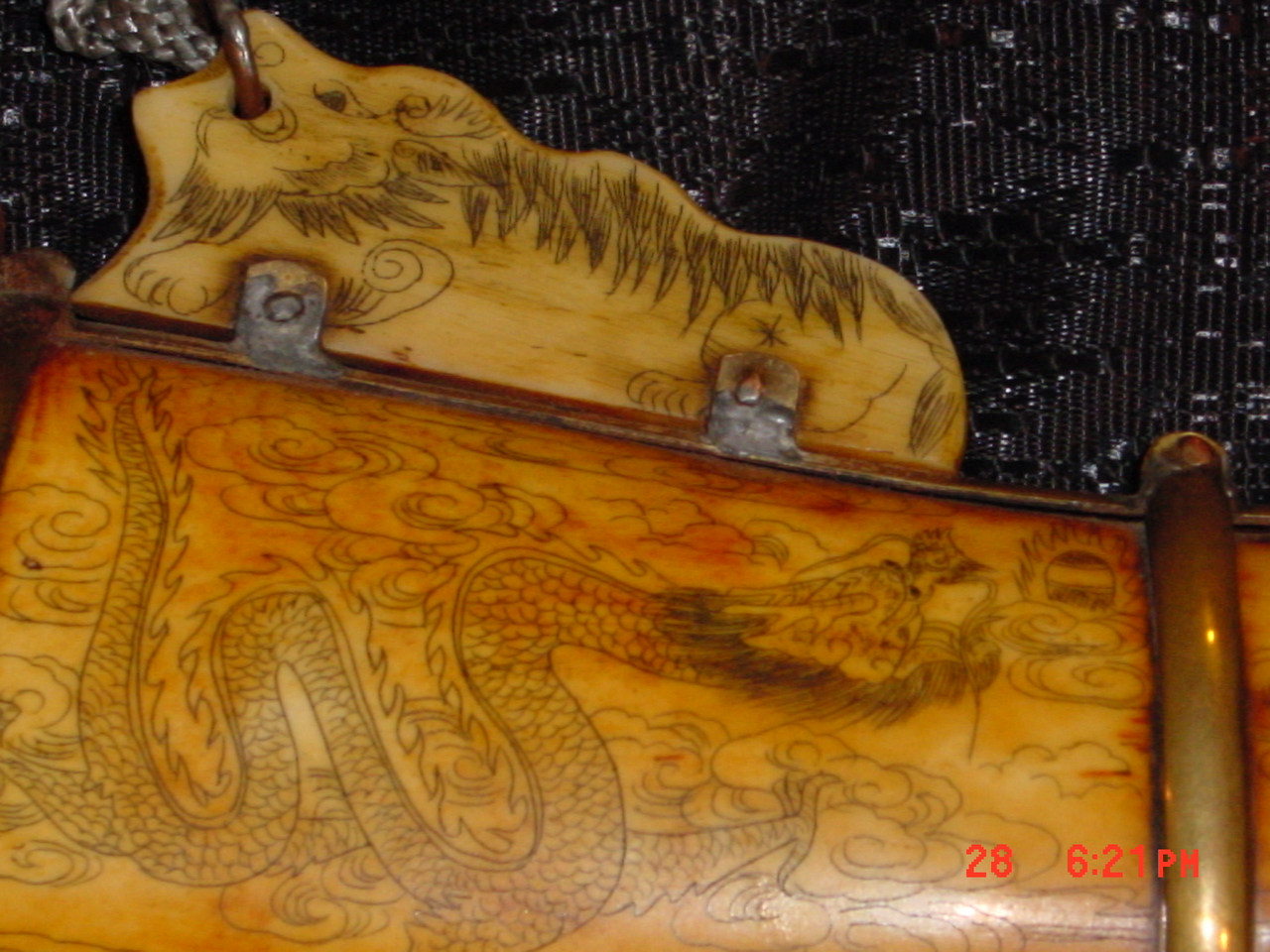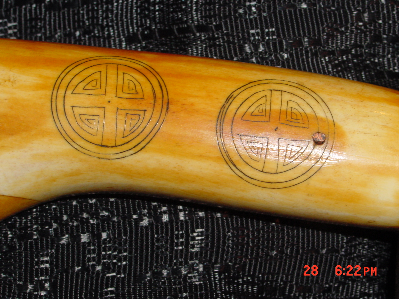 it's an ivory knife and sheath both totally made out of ivory with eteched art on them