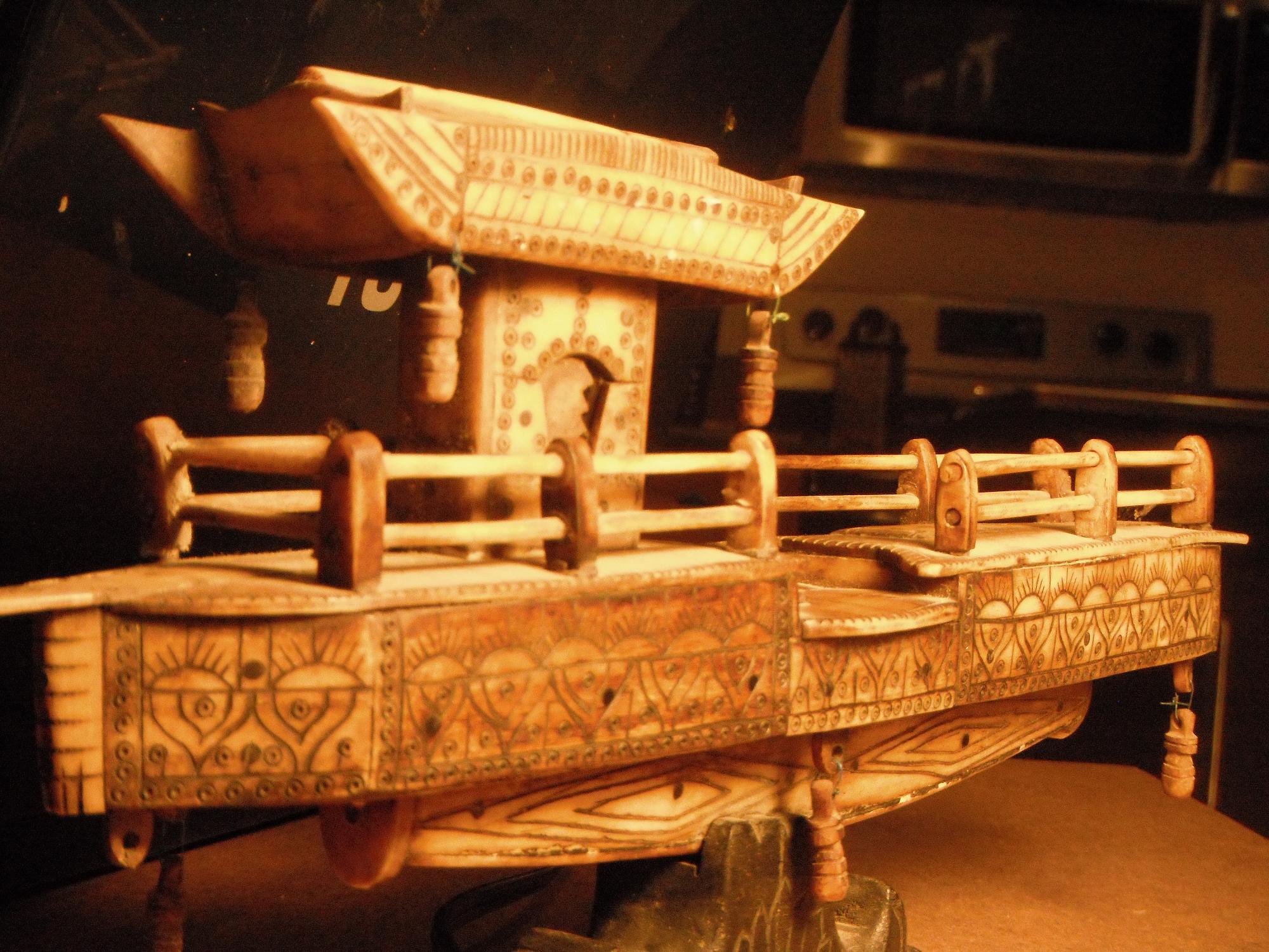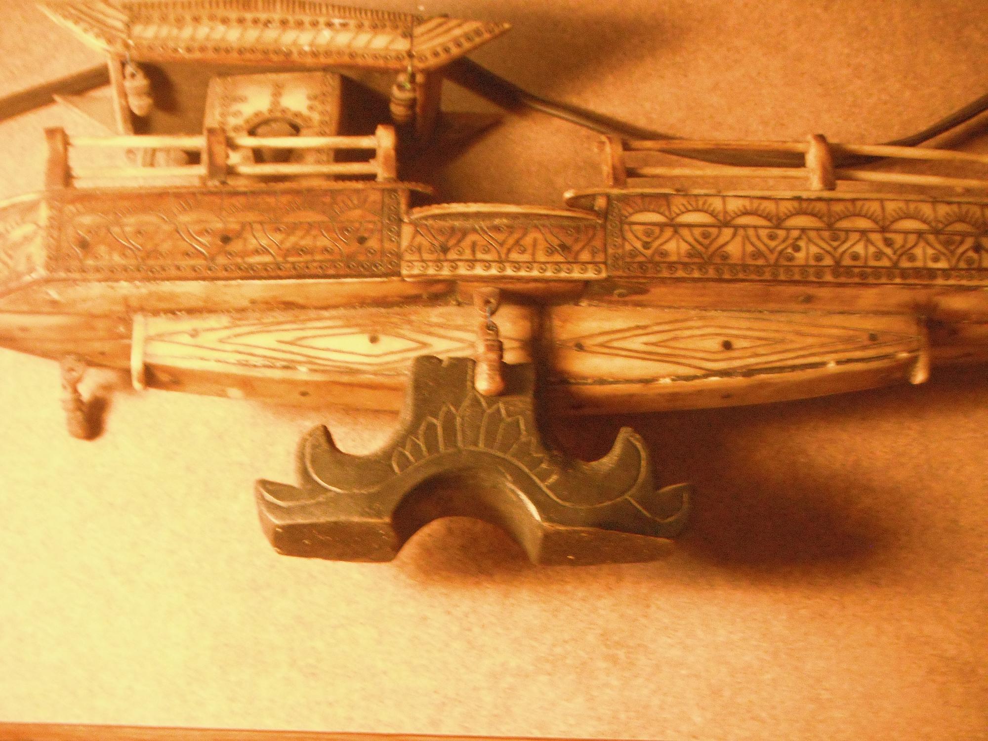 This boat was found in a second hand store and was part of a collection of things that were being sold for an 87 year old Army Veteran. I was told it was brought back after WWII or some time around then. Not sure whether it is bone or Ivory. The Ivory is plated in panels on the outside held in place by wood pegs. The wood pegs push through into a light weight wood block. I don't know what may be original and what would be repairs. The bouys are hanging from the sides and corners and are also carved ivory. This is an interesting peice and I am sure there is some history behind it. all hand rails are bone or ivory as well as the rail posts. I believe there is a sail or may passengers that may be missing based upon the empty peg holes on the bow platform.