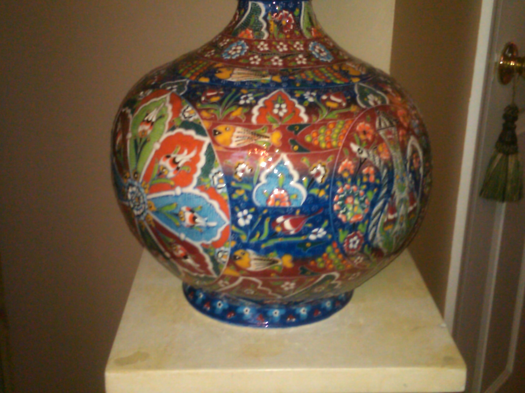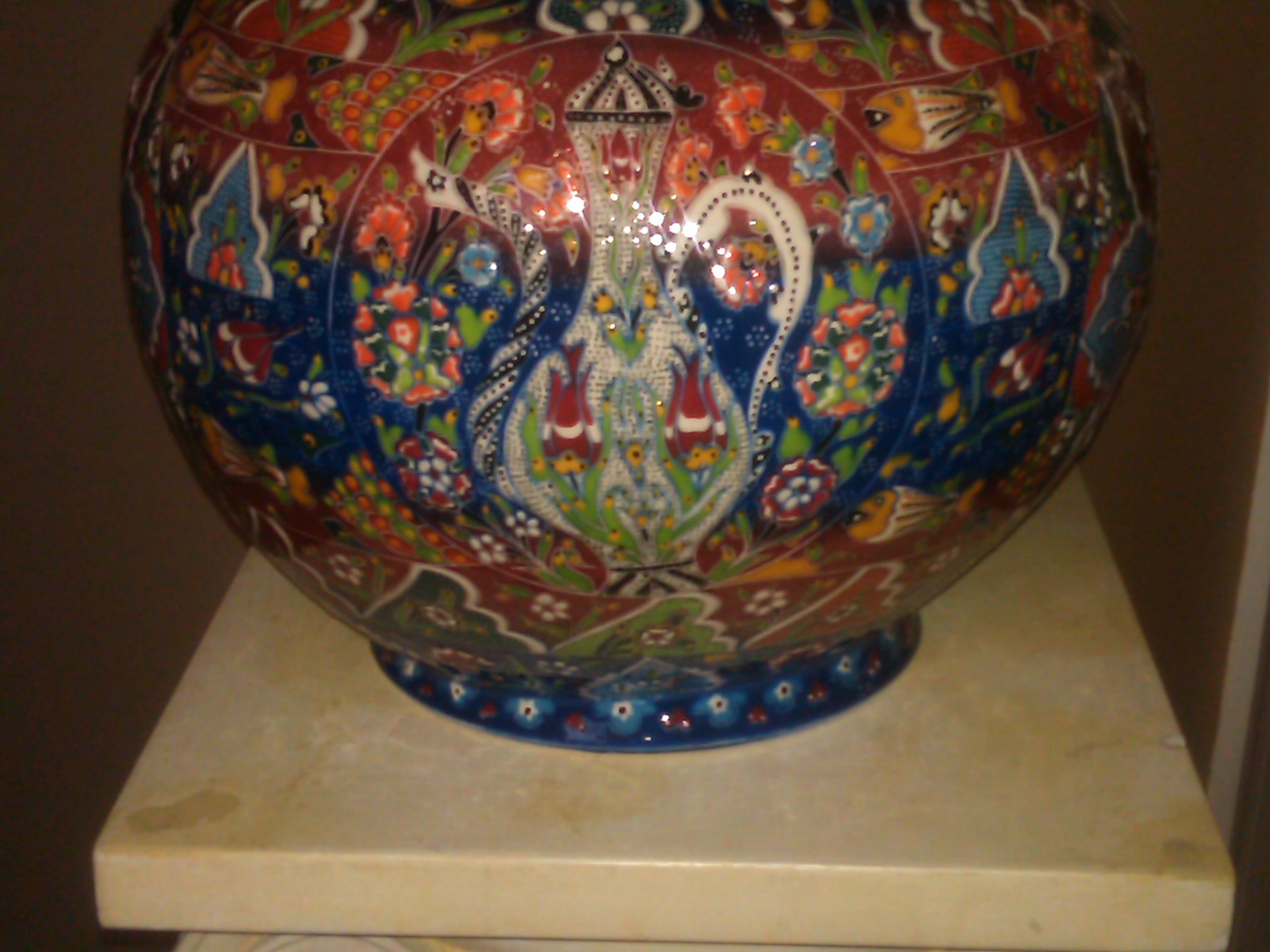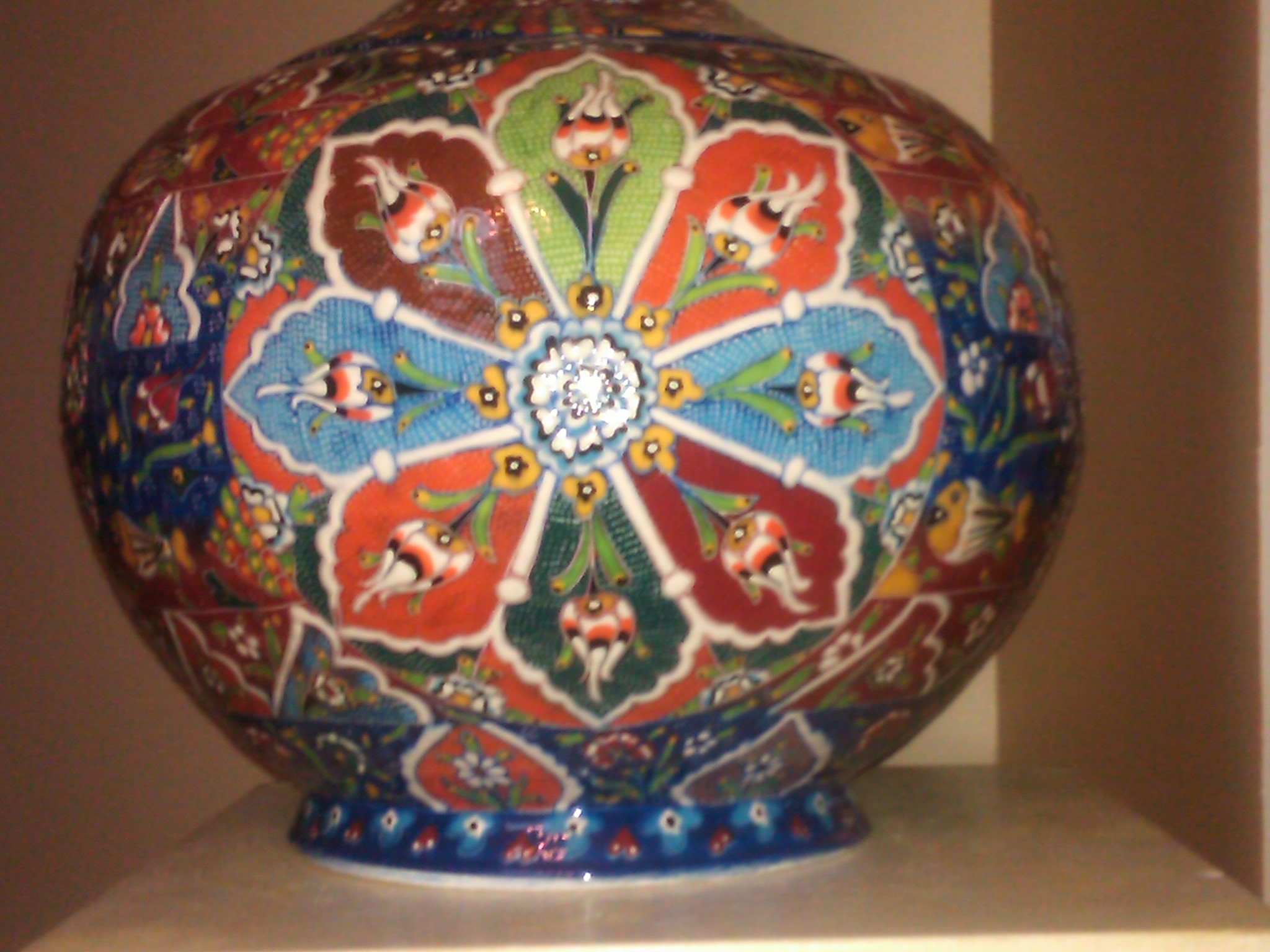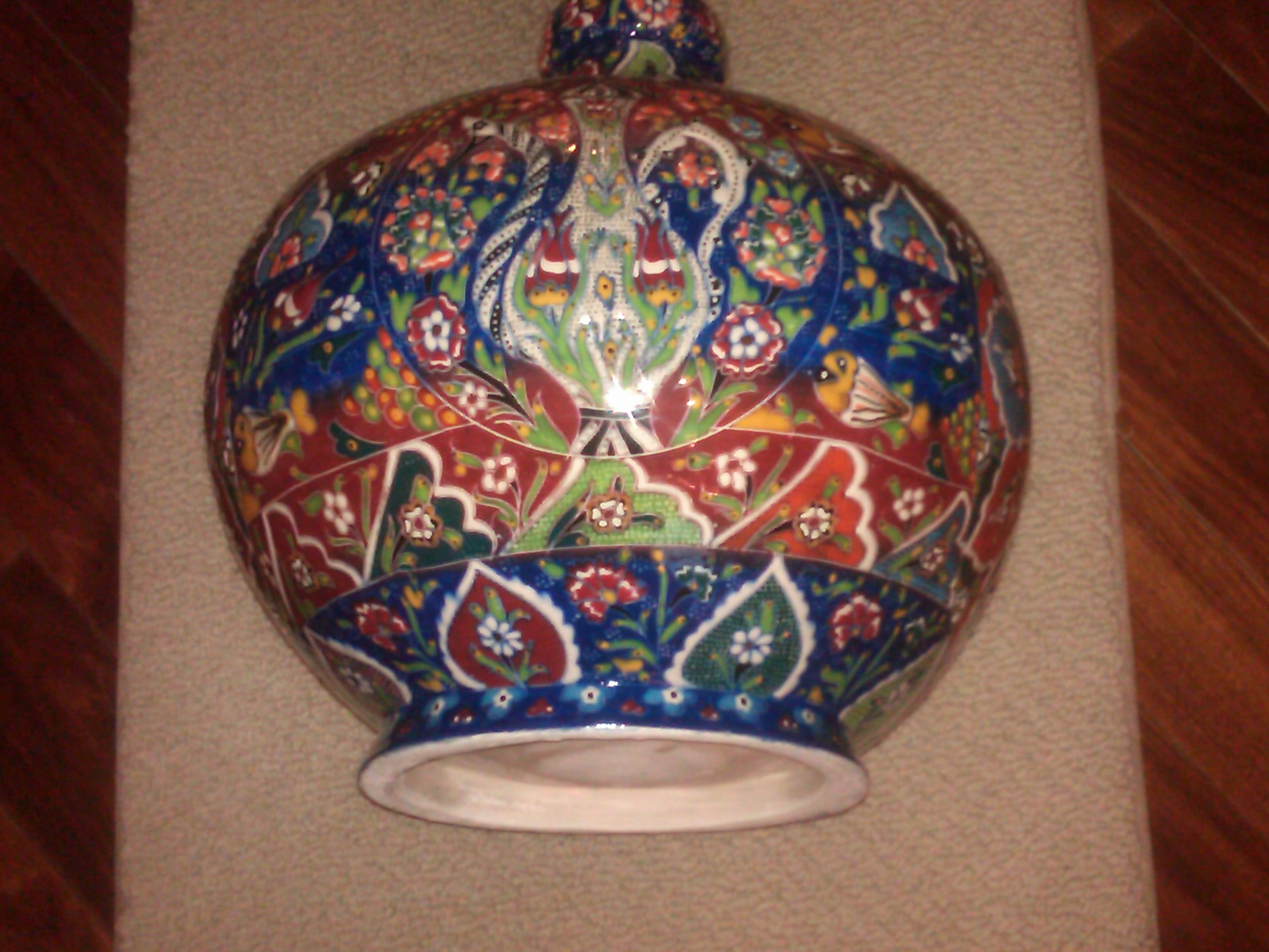 This is a vase supossely made of Iznik with the ottoman design and I'd like to know if it is really Iznik. It doesn't have any signature, the designs are not all strait as you could see in the pictures. Whatever it is, I would also like to know its price.