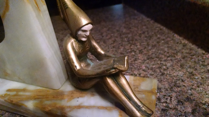 This clock was produced by J.B. Hirsch in 1927 using the original French molds by Austrian Costume Designer and Sculptor, Gerda Iro Gerdago for the Pixie figures . The Pixie Readers are dressed in the elaborate Deco dance costuming that Gerdago was famous for.