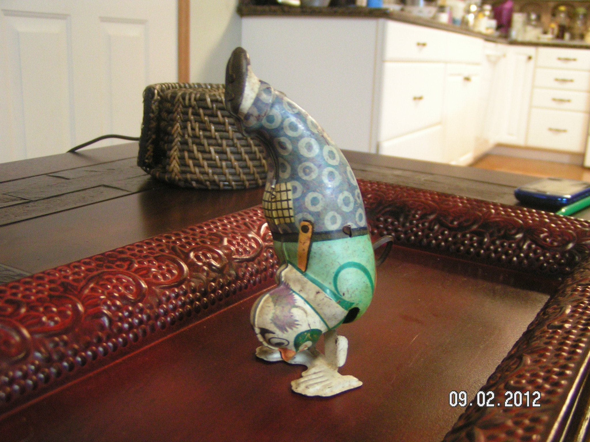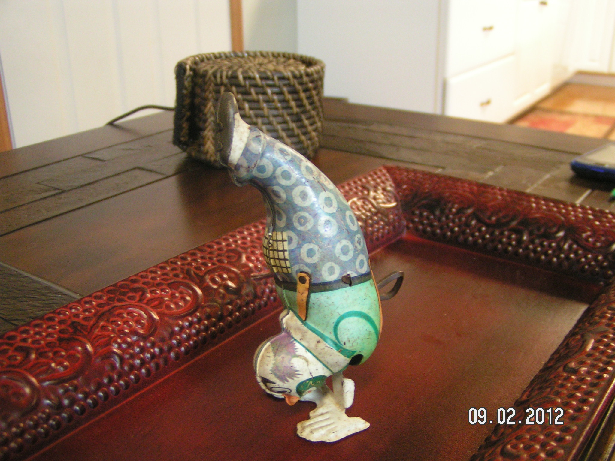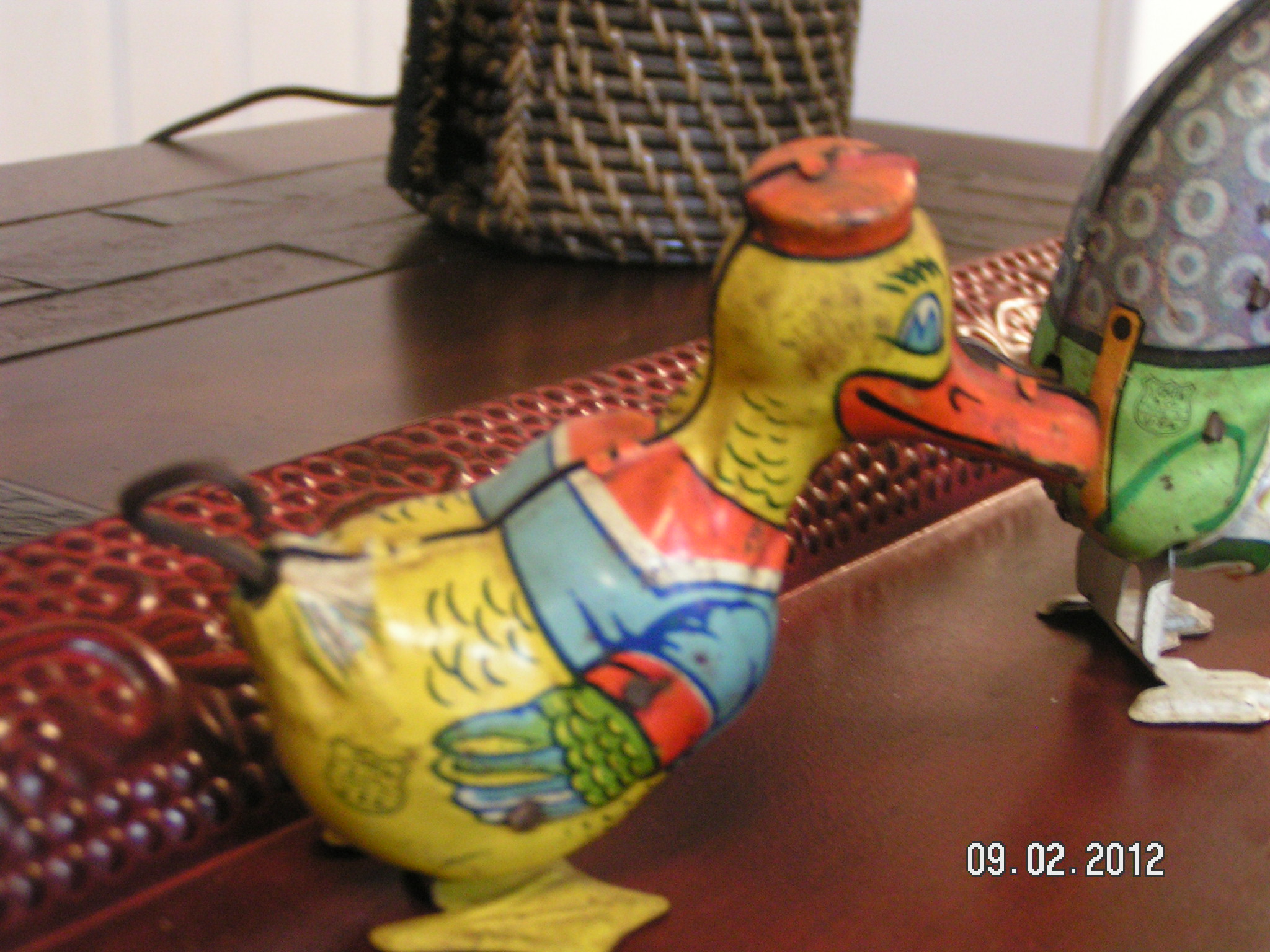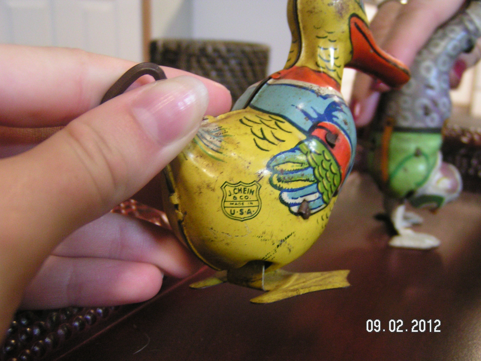 I bought two J. Chein tin toys at a local garage sale and I was just wondering what they might be worth. One is a clown in a handstand position, oh by the way, these are both wind up toys. The other is a duck that is mostly yellow and orange. Both have excellent colors and condition for their age, the duck's winding mechanism turns with no problems, but for whatever reason does not shake. The clown's winding mechanism is locked, but not sure it could be fixed or not. I can send pictures if necessary. Thanks, Angela