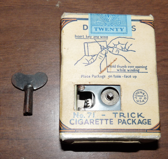 This is a vintage joke cigarette pack. Made by J. Chein & Company. Labeled "Camals", a VERY close approximation of Camel cigarettes. You use a key to wind up a spring, lay the pack on a tabel, and when you pick it up, it vibrates.