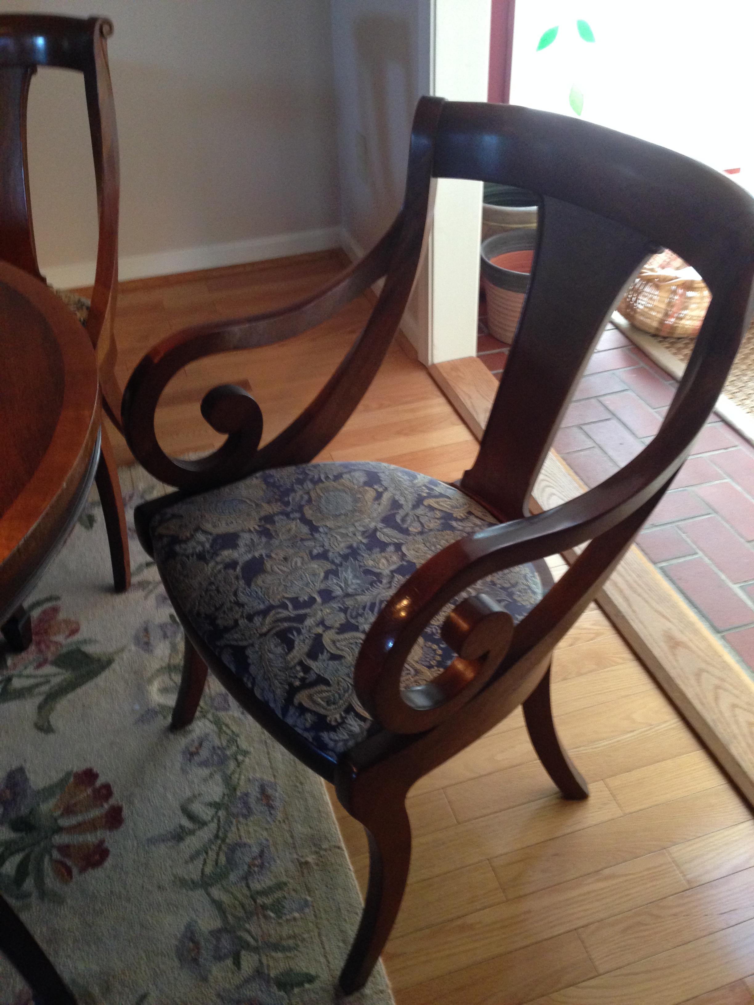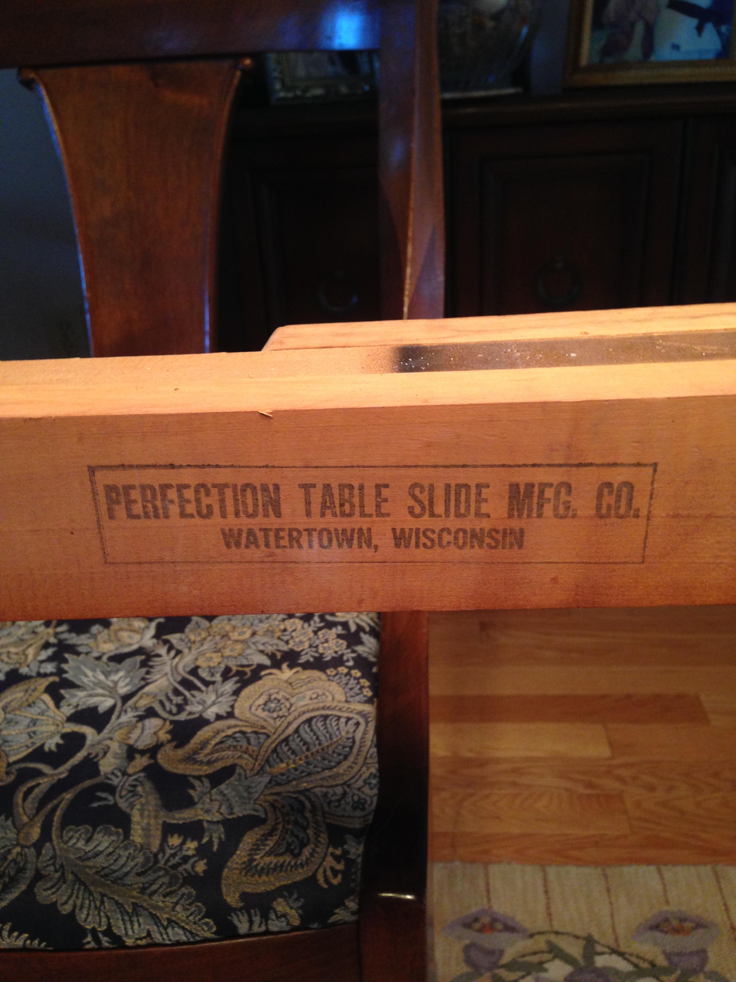This is a J L Metz Dining set with 6 chairs: 2 arm chairs and 4 side chairs. The table seats 10. It has been in my family for 60+ years and is in good shape. It does need refinishing. The original label is still attached to the bottom of the table and the J L Metz label is still there but not complete. It has Perfection Table Slide MFG Co slides.