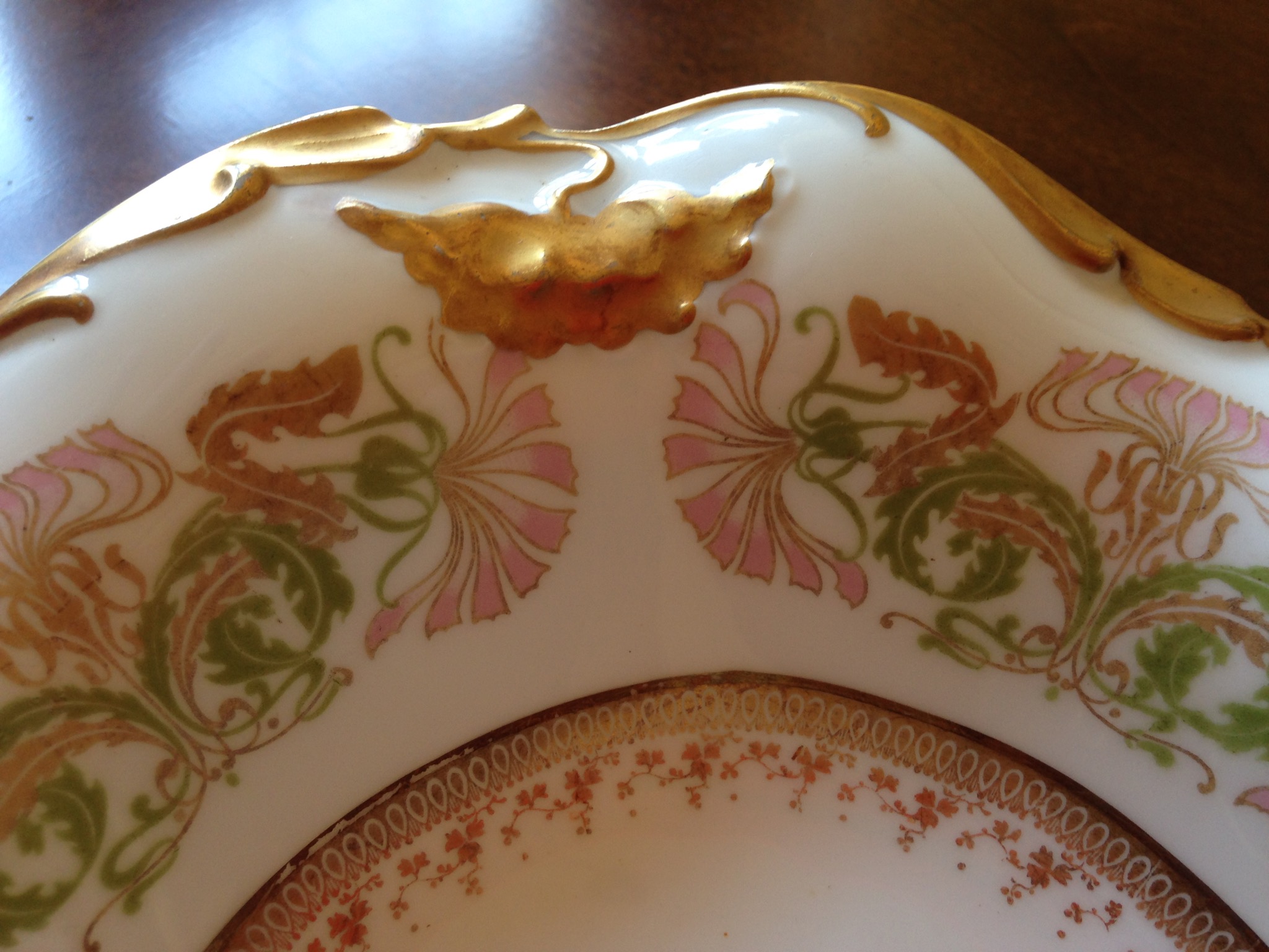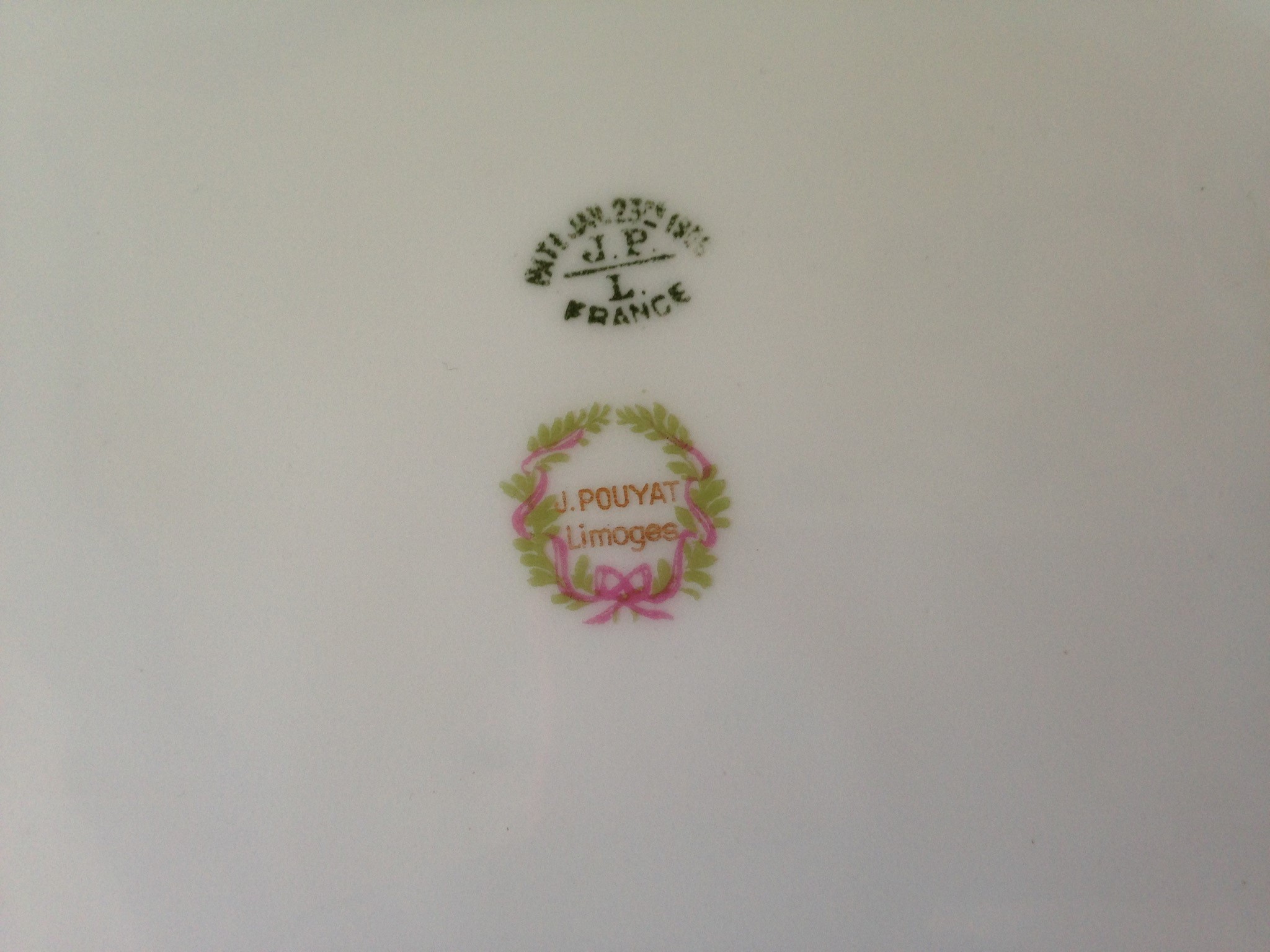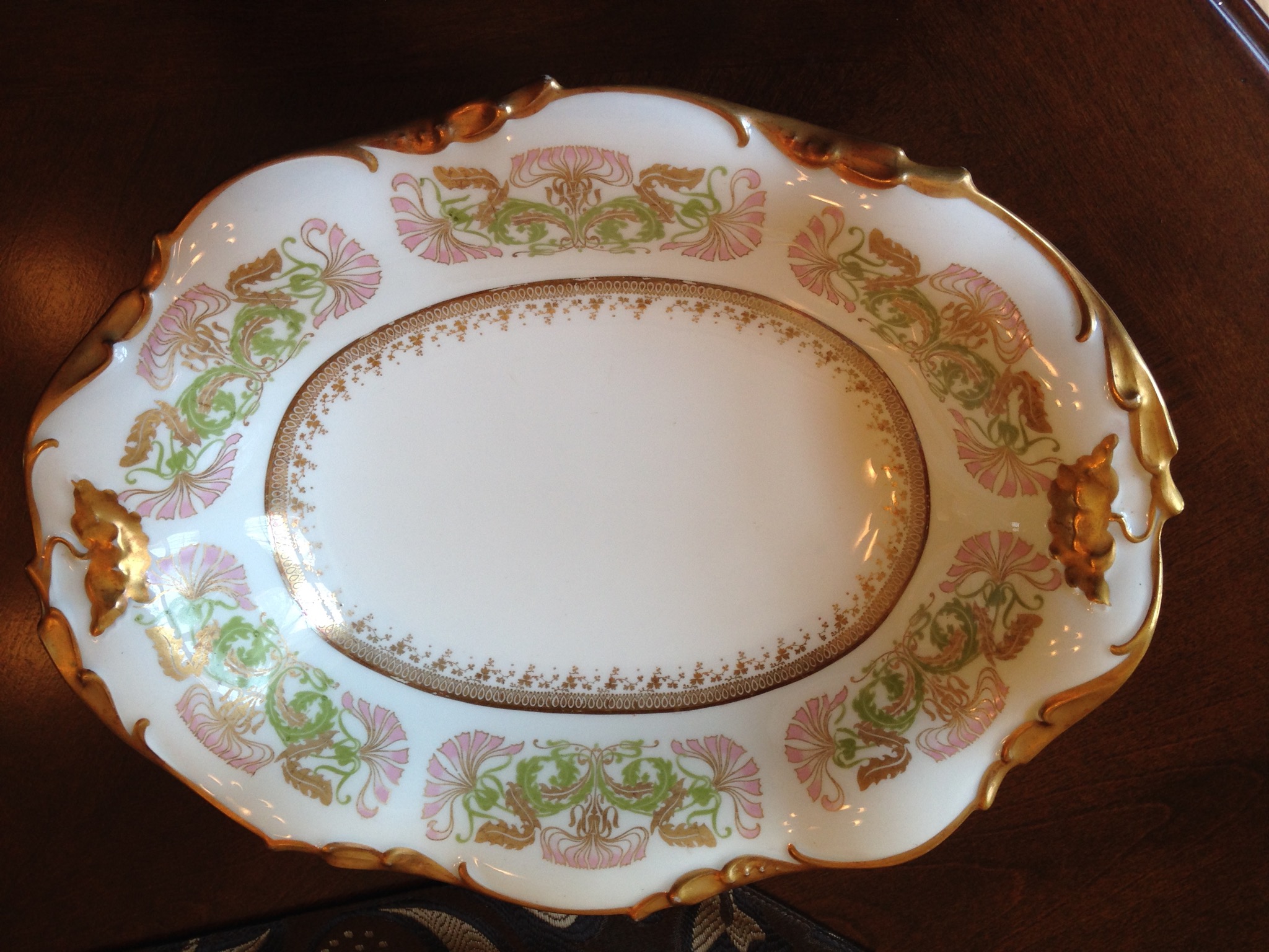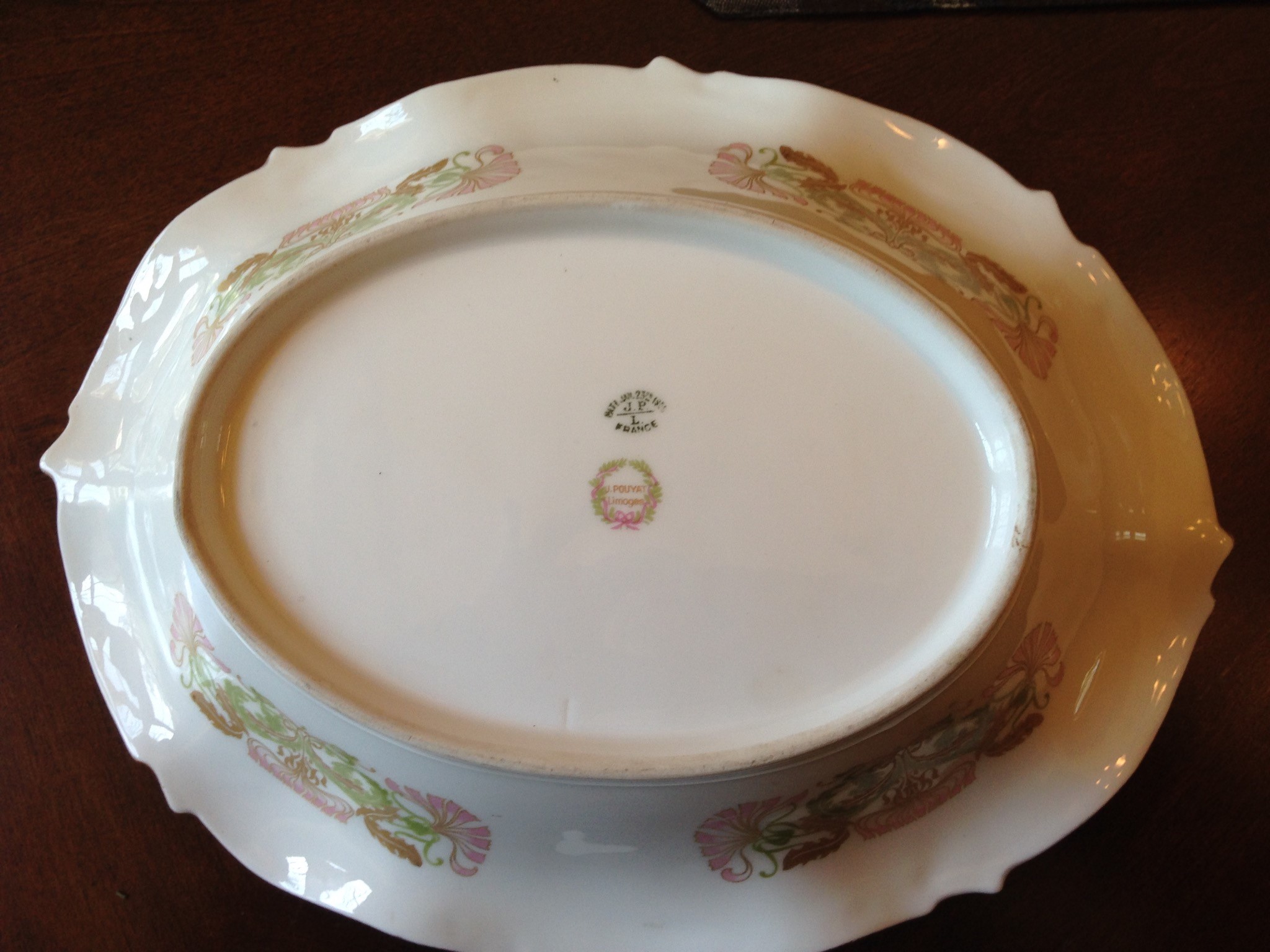 This is a J. Pouyat French Limoges Serving Dish from the late 1890's to early 1900's. It is approximately 12 inches long by 9 inches wide. It has a pink and green floral pattern with gold trim. It is in excellent condition. It was in my family for generations.