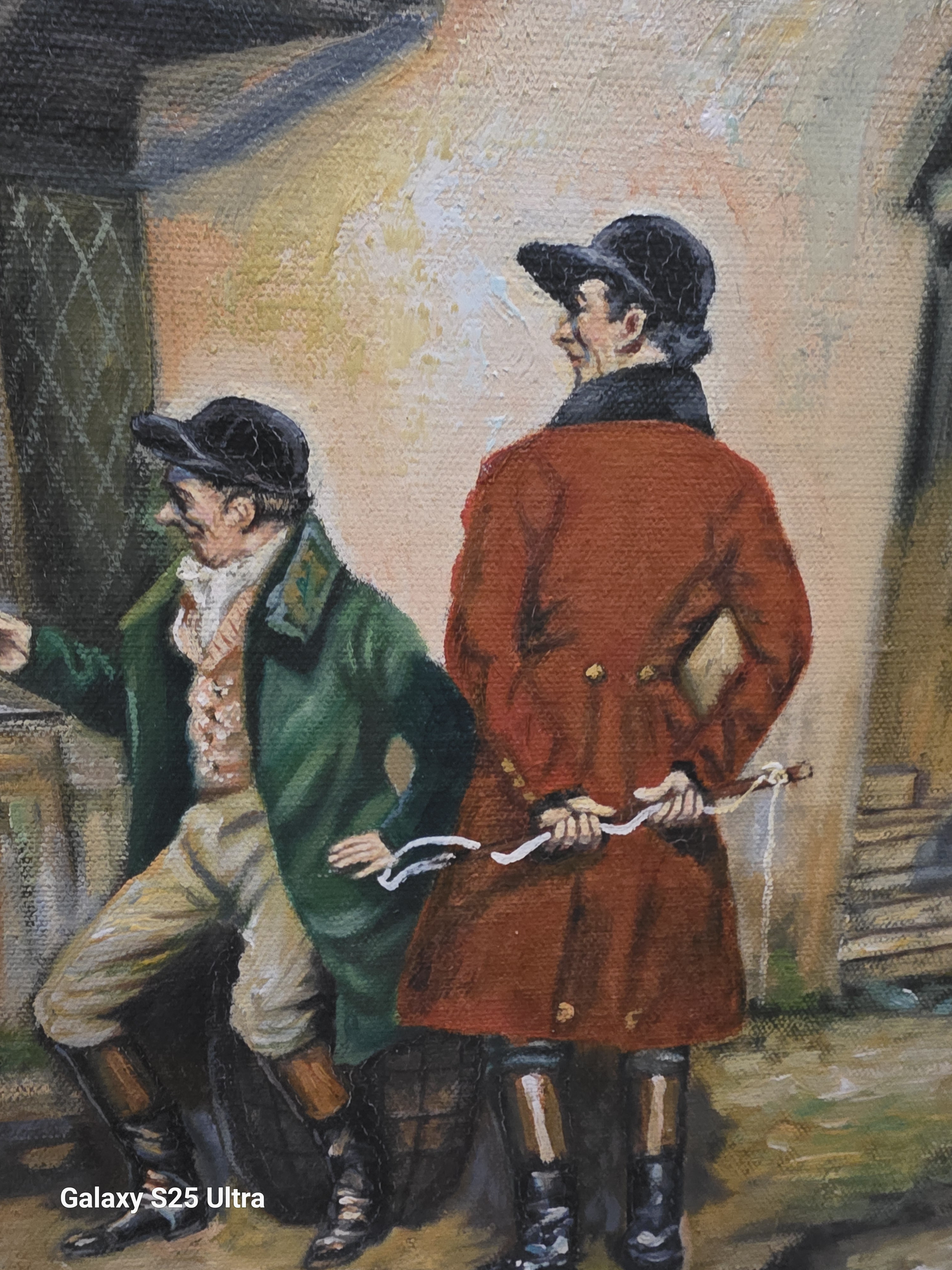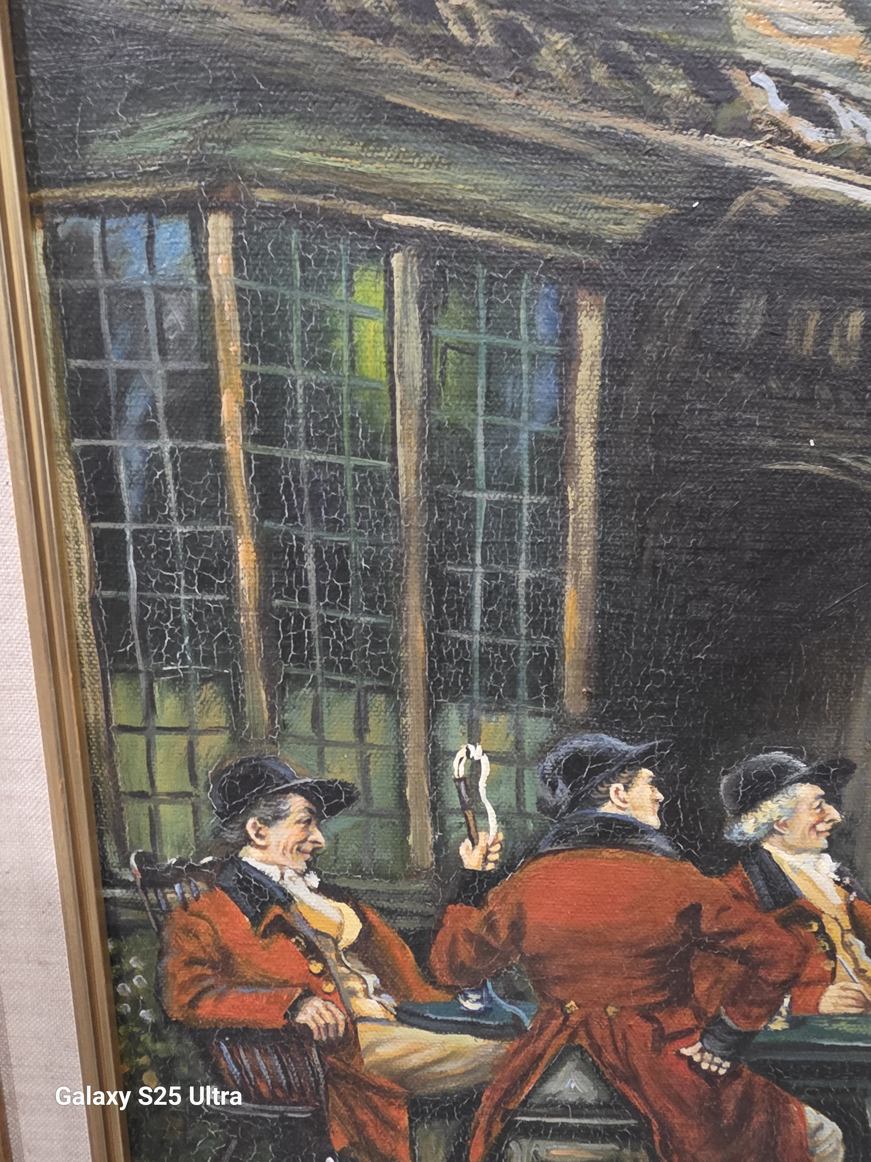 This captivating oil painting, titled "Bar Scene," is framed in an ornate gold gilded frame and measures 31 inches by 27 inches overall, with the painting itself measuring 23.5 inches by 19.5 inches. The artwork features a lively gathering of figures in period attire, engaging in conversation and merriment, showcasing the artist's skill in capturing human expressions and interactions.