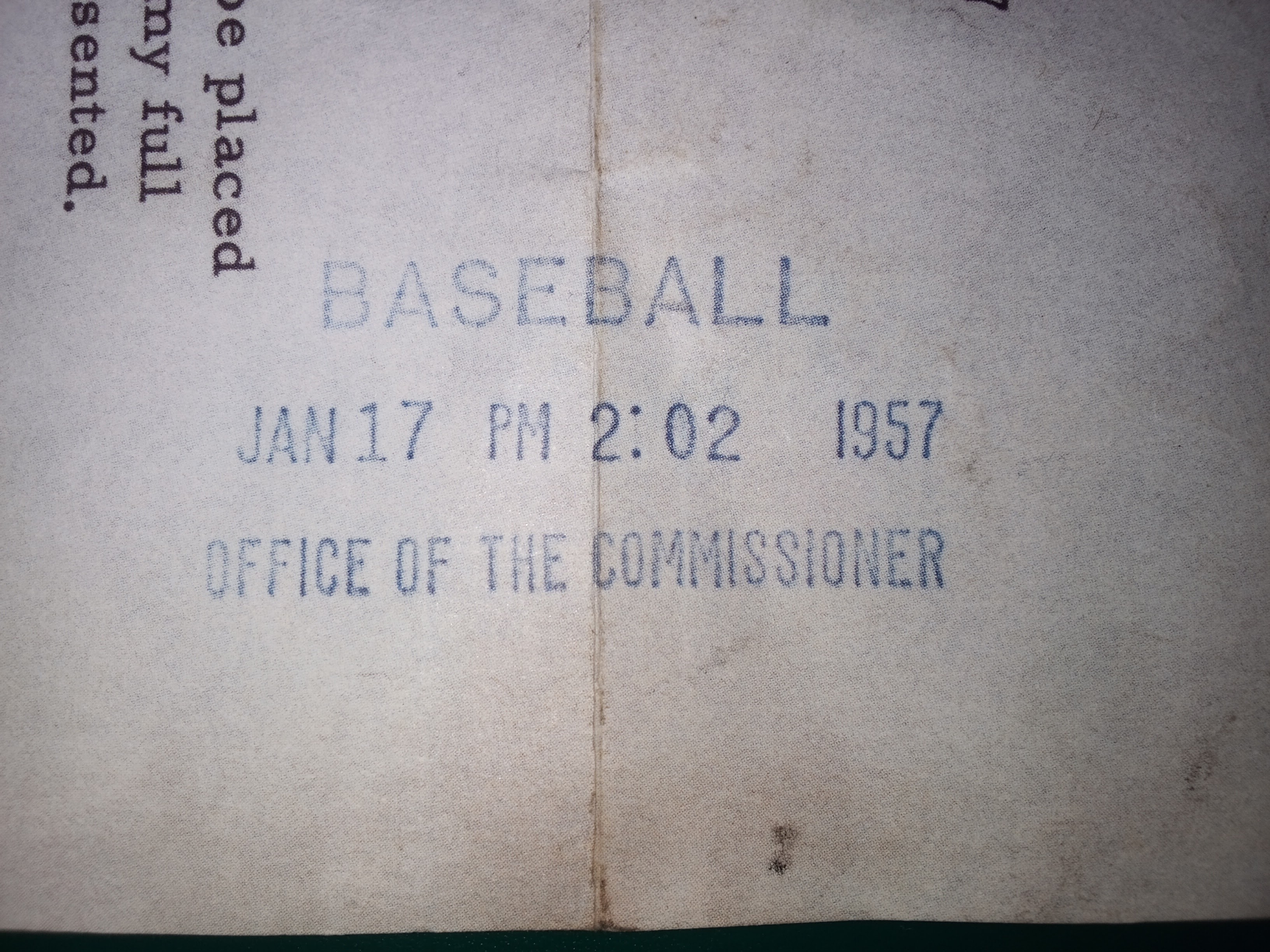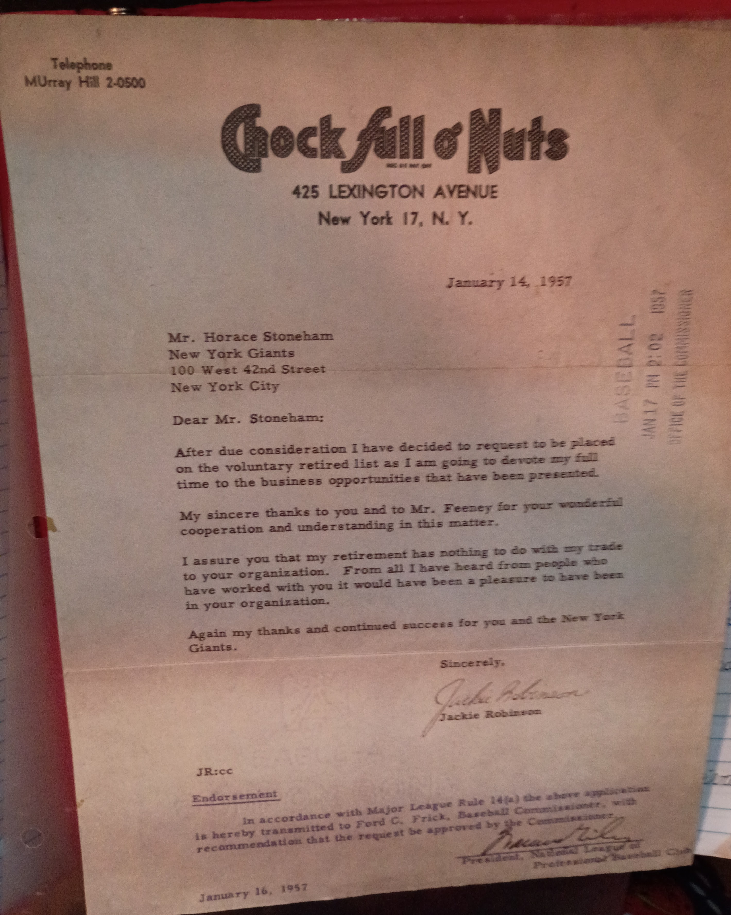 Description Historical document of Jackie Robinson's retirement from baseball dated January 14, 1957, on "Chock Full o' Nuts" letterhead, informing Horace Stoneham of his decision to retire. Endorsed by Warren Giles, president of the National League of Professional Baseball, and approved by Commissioner Ford C. Frick on January 16, 1957. The watermark of an "Eagle-A" with "GOOD ON BOND" is visible on the front as well as the back of document.
